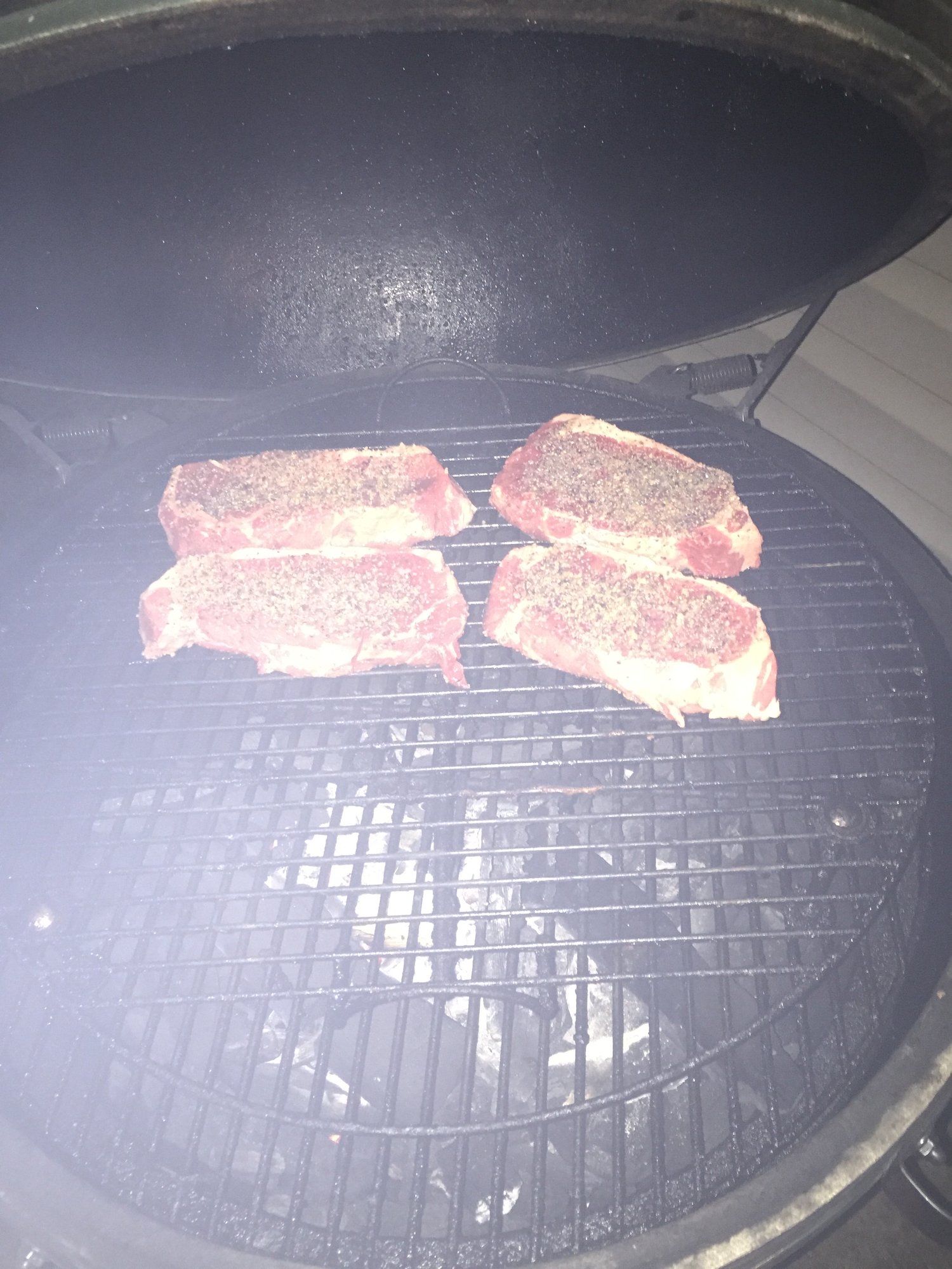 With kids gone for the evening decided to do some steaks. Went to SAMs to pick up some T-bones but, they had NY strips on sale. They only had 4 packs left so I went for a few with that(a few lunches during the week). Only did lump on half the xl(towards the front) and put the beef on the back side of a raised grate to begin with. Used the new Therapen MK4 to make sure they were on the right tack. A little bit of oak and they were amazing.