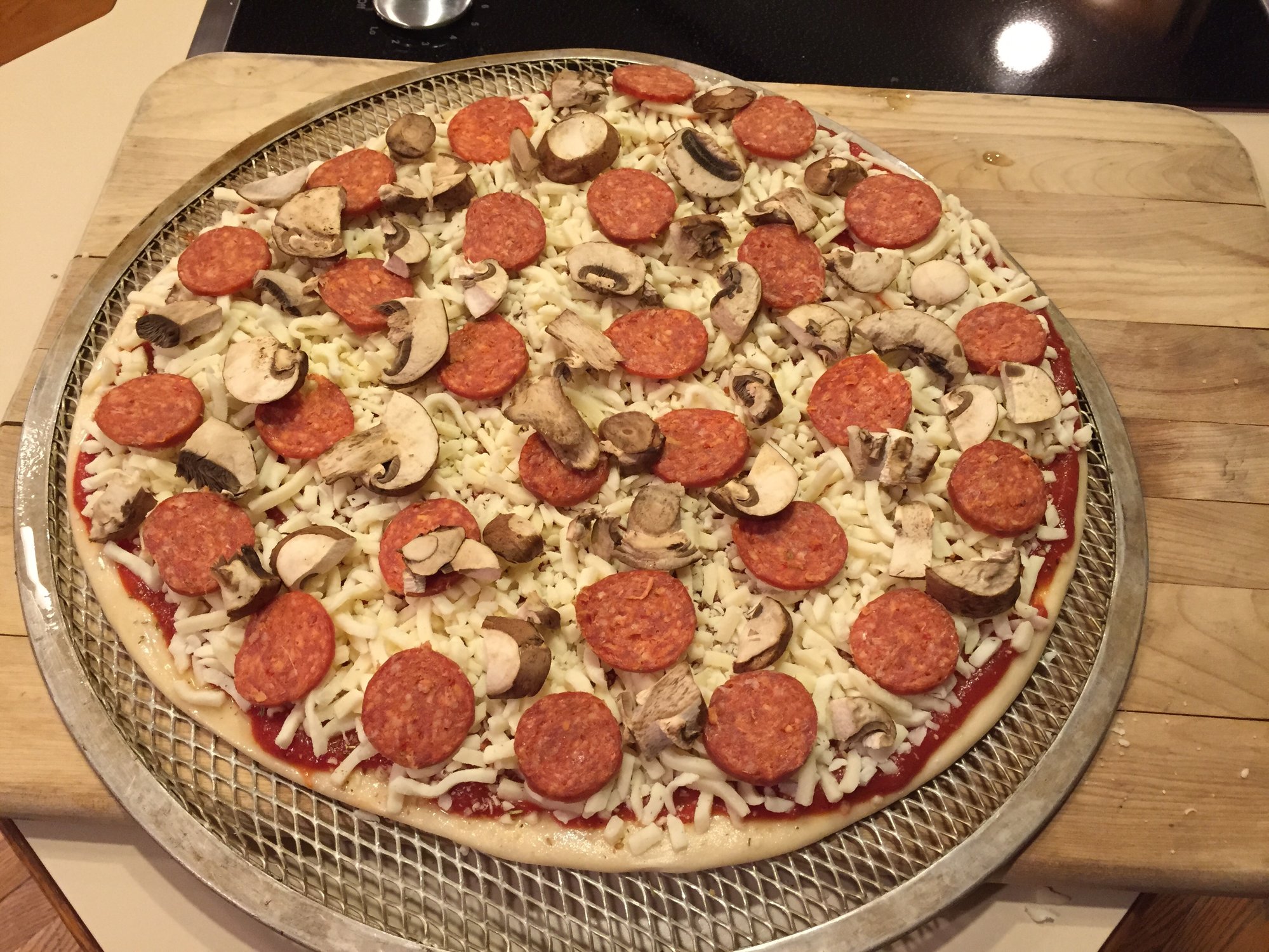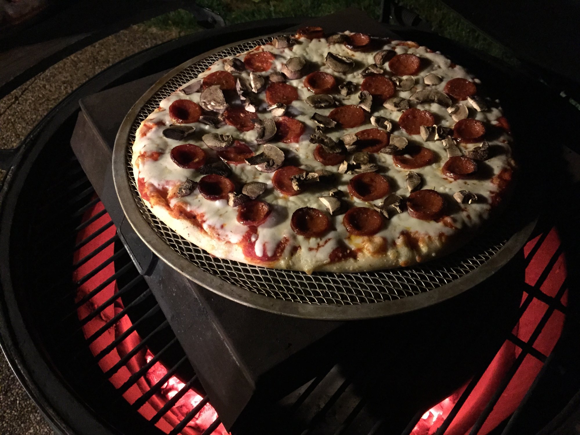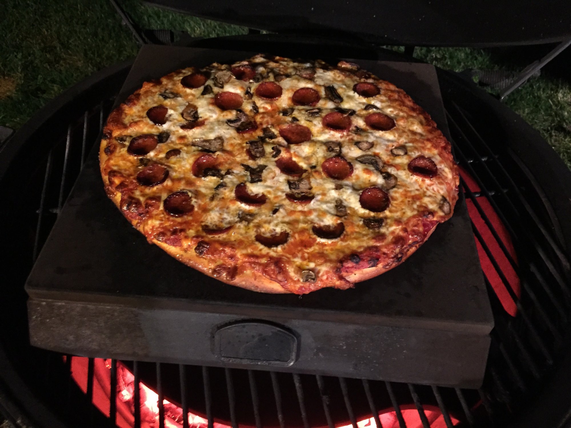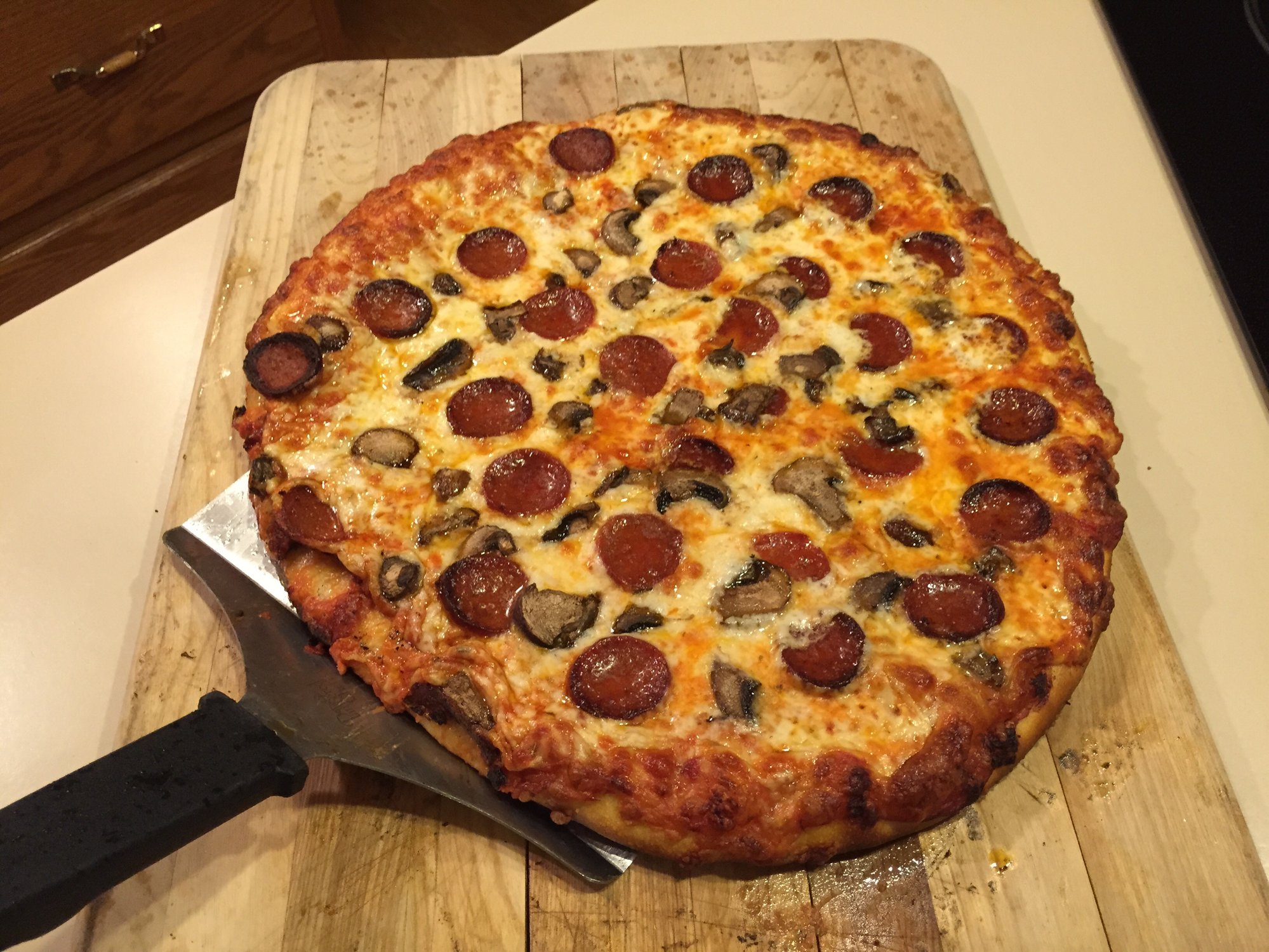 Same old Same old! Pepperoni and Mushroom cooked well done at 500 for 16 minutes spinning several times.