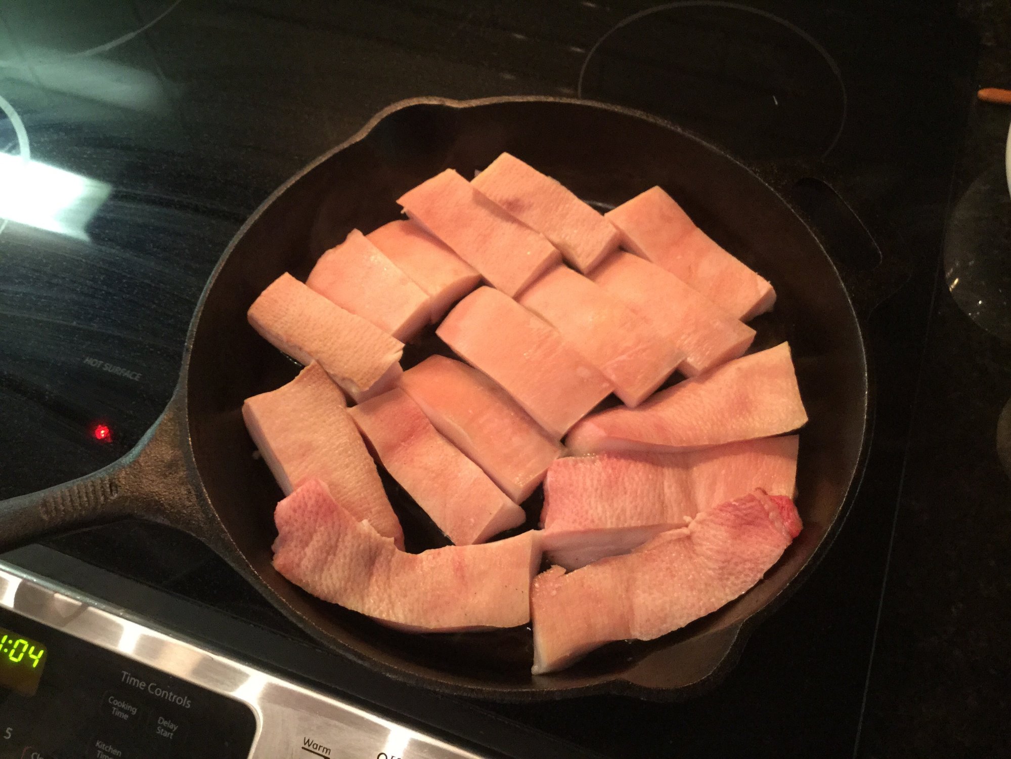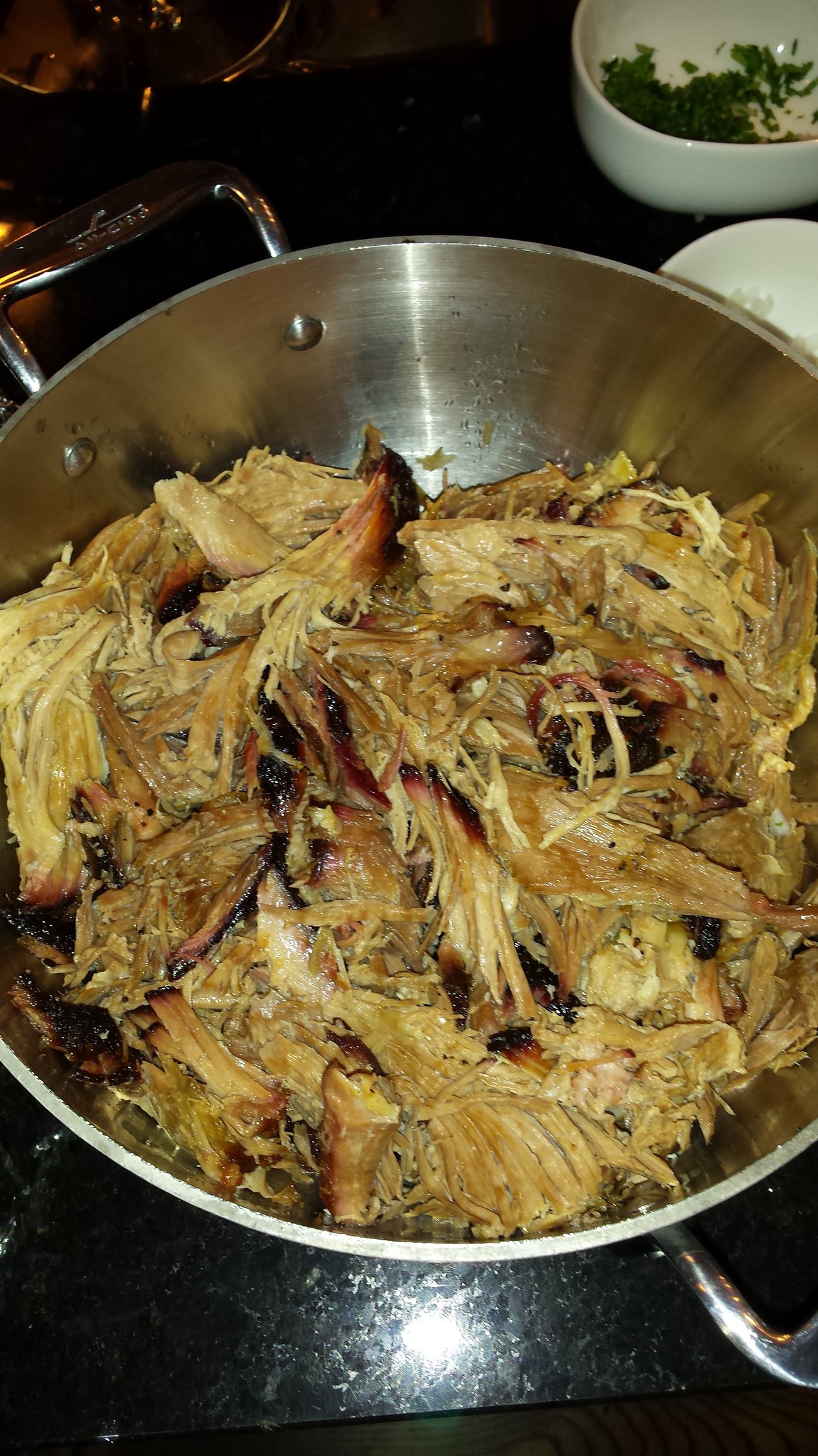 Pulled pork tacos for dinner with MsStone and Rock#3, home from SF. Some fat cap in the skillet rendering. The rest is becoming lardo, and I will launch another thread for that.