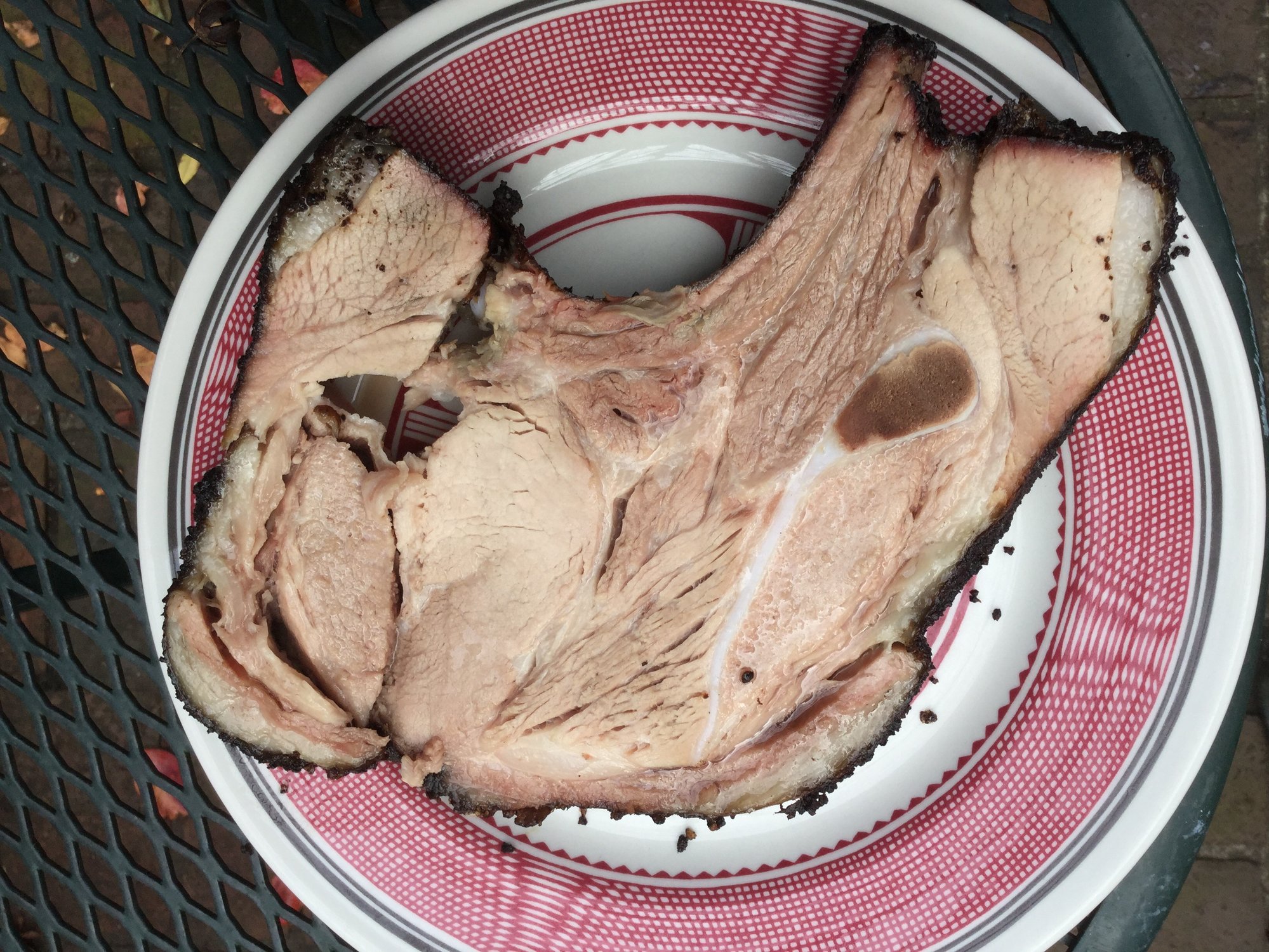 I hustled led over for a reload, and saw a great opportunity. The end of this butt still had a pork chop on it, which looked juuuust done. I sliced it off and boy howdy!