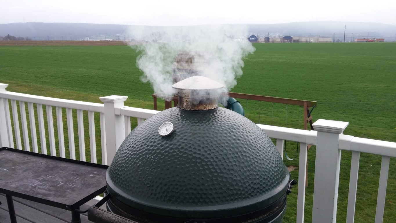 After lunch, got stuff cleaned up and then re-filled the XL with lump and cherry & oak wood. Thought this made for a cool shot of bad smoke.