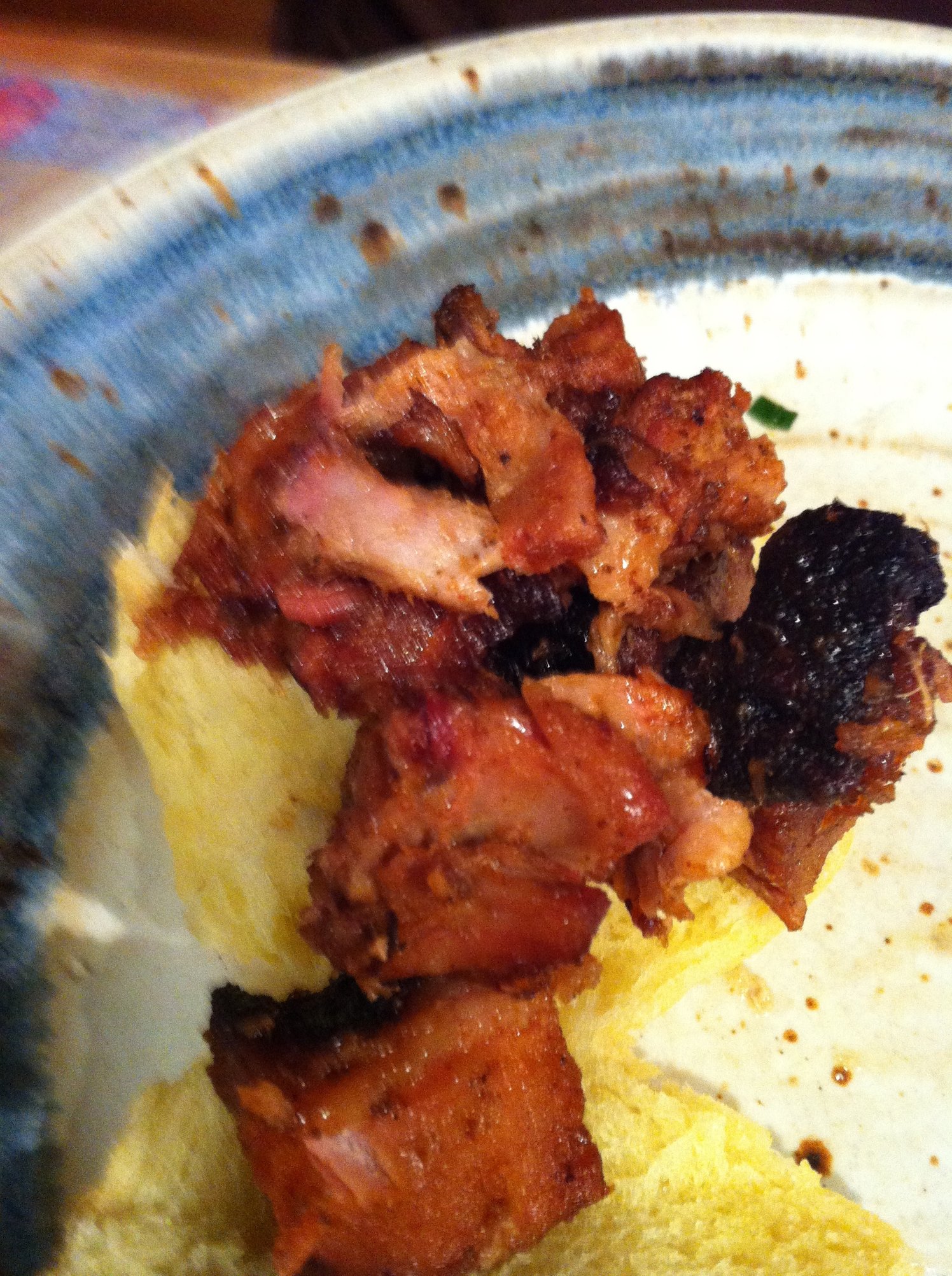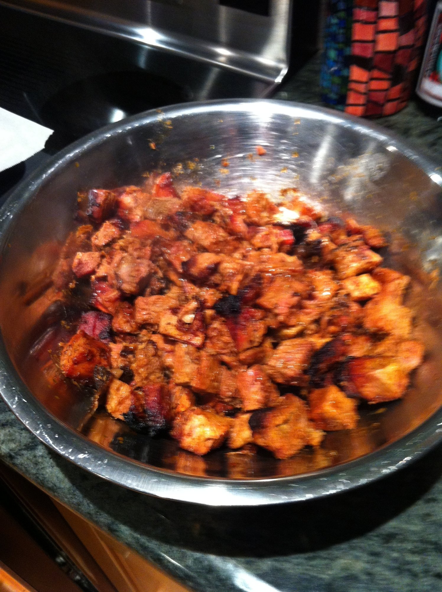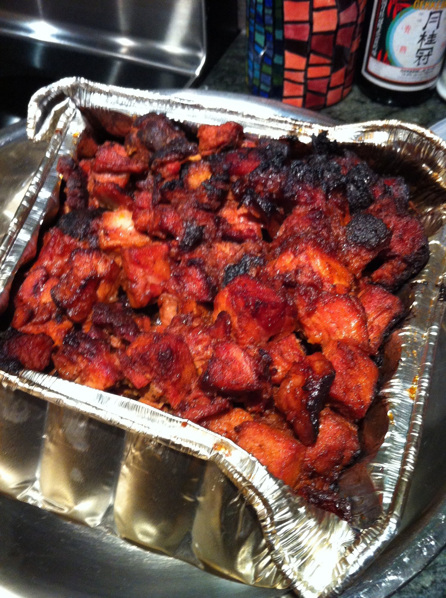 The end product was delicious...tender carmalized morsels of pork...albeit a touch on the dry side. I think next time I'll be a bit more careful after saucing. I was trying to carmalize the sauce throughout, which dried out the top layer, while over cooking the bottom layer. I think a single layer of pork would have been better at the very end.
