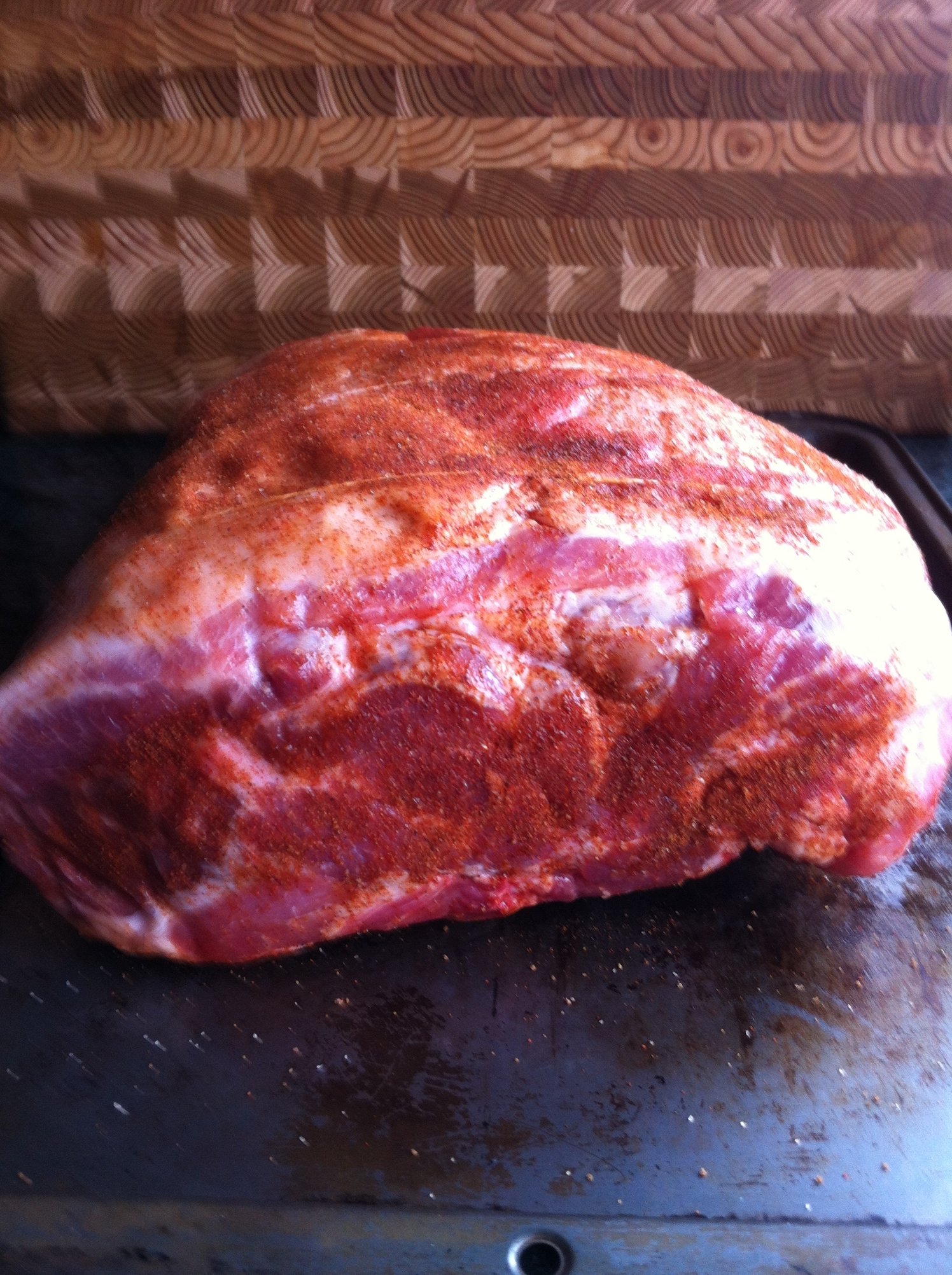 Started with a fresh boneless pork butt. Seasoned it up (sparingly) with some homemade rub.