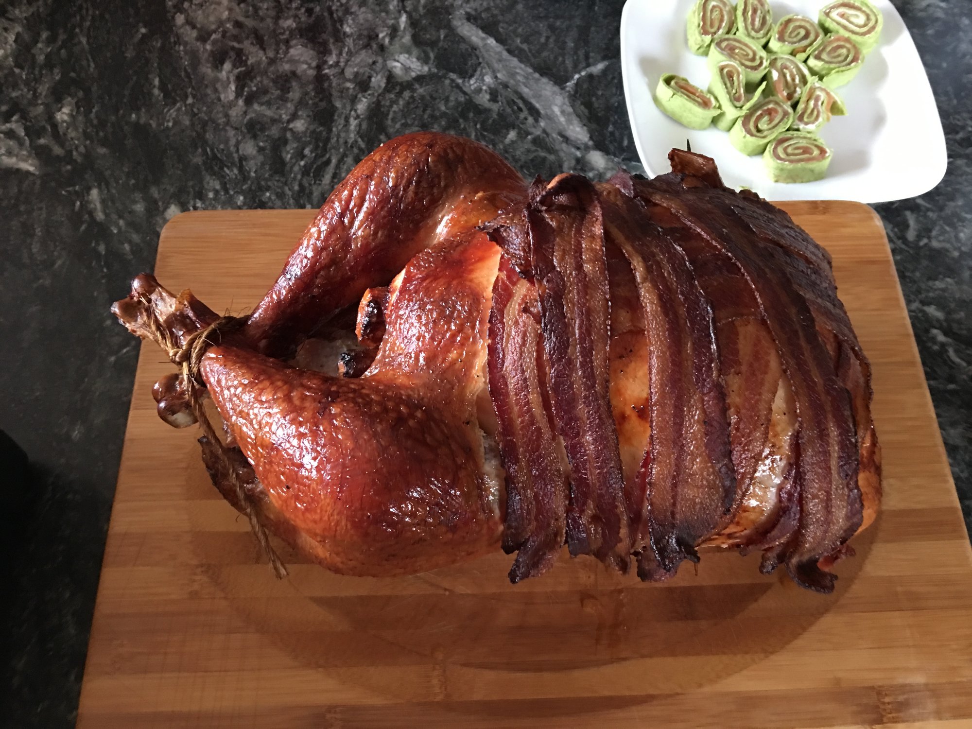 Christmas turkey. Turned out amazing. Meat was injected, a very light pecan smoke...so tender it melted in your mouth.
