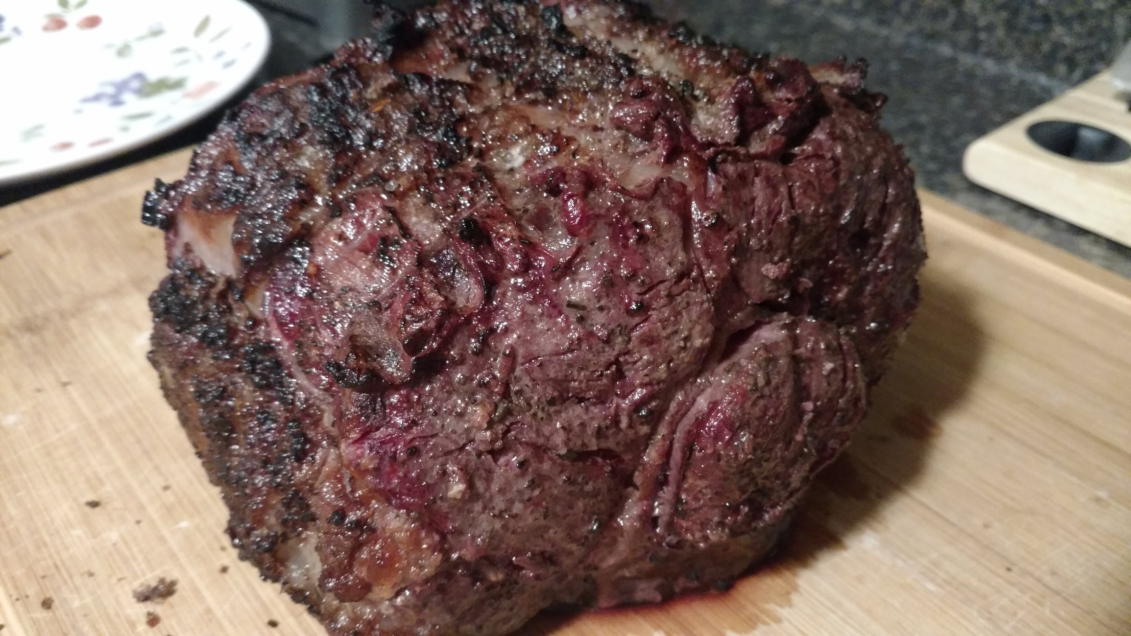 I made the prime rib the day after Christmas. I over cooked the roast a bit but it was still good. 250* indirect and then I seared it with the torch because it's easy. Made some au gratin potatoes and steamed broccoli with it. All the pics are sorta out of order but close enough.