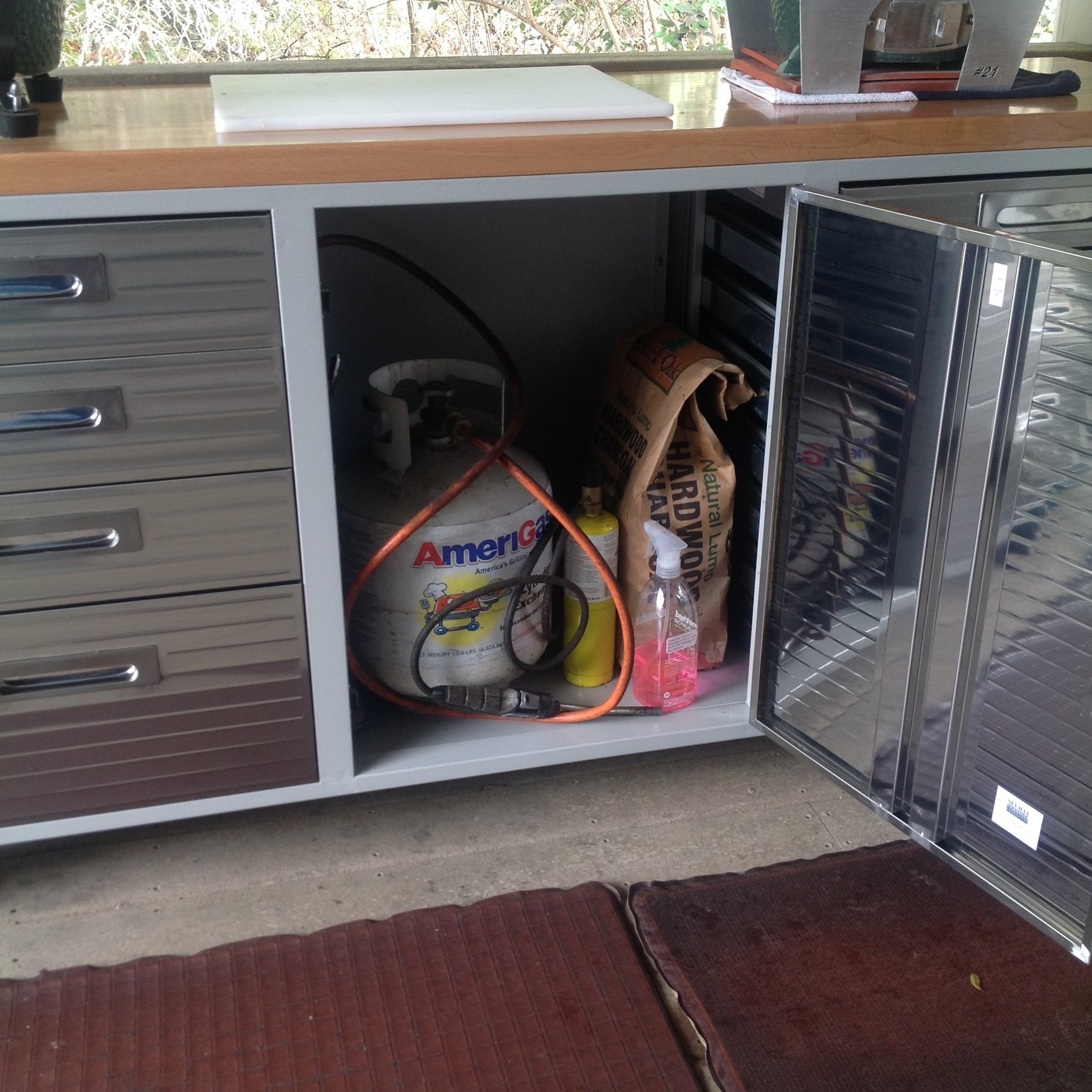 A Rubbermaid horizontal storage shed for charcoal and wood. The rest of our stuff is all over the house and garage. I'm about to buy a large plastic shelving unit from Costco for $25 and convert a large walk-in storage closet into the Egg closet.XL BGE & 36" Blackstone