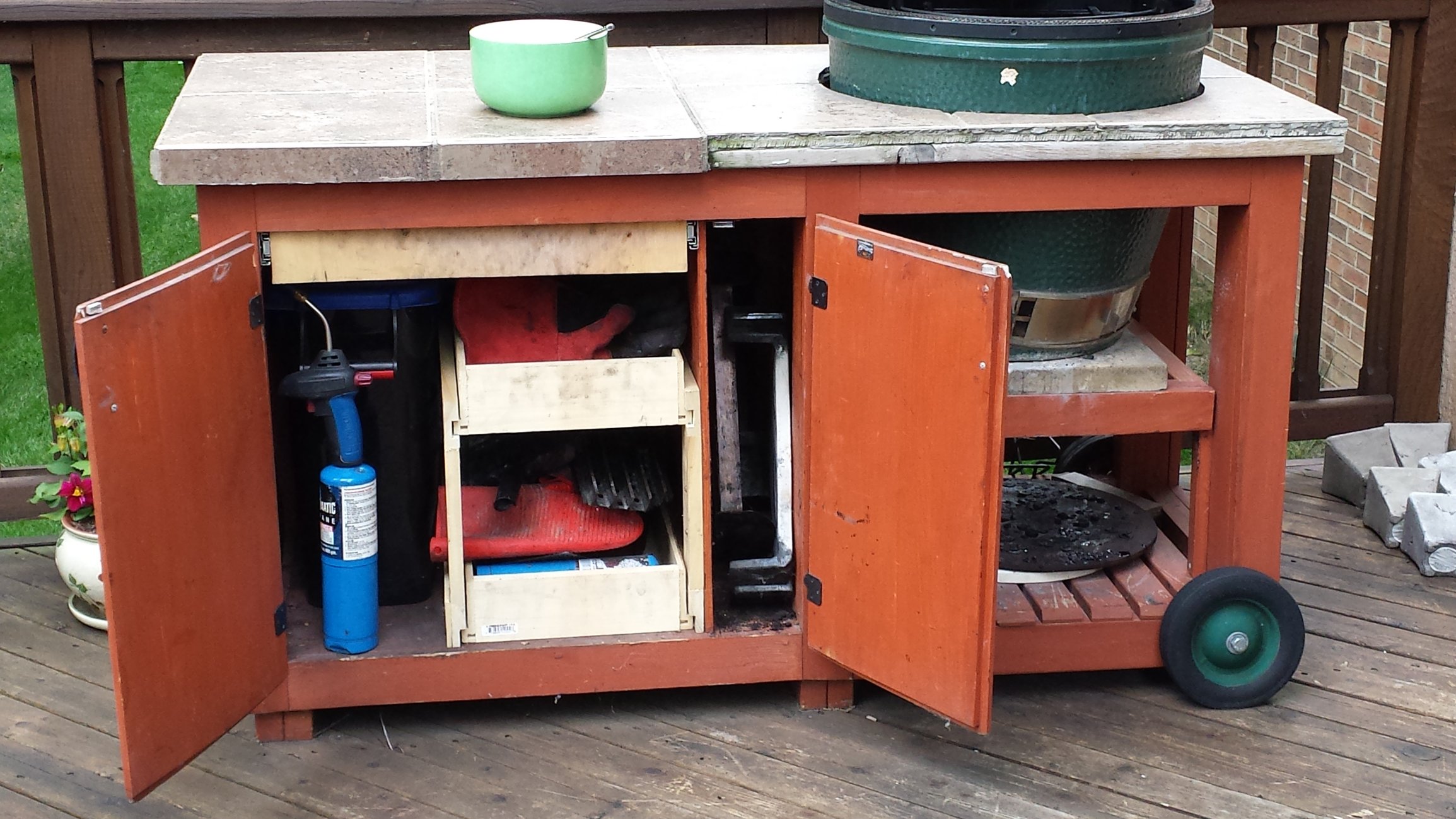 I have been able to store everything I need in it including charcoal, smoking woods, Woo2, platesetter, pizza stone, gloves, torch and more. Everything has stayed high and dry so far. It is also lockable if that is something you need.Greenwood, IN | XL BGE | Weber Genesis | Blackstone 28 | bunch of accessories
