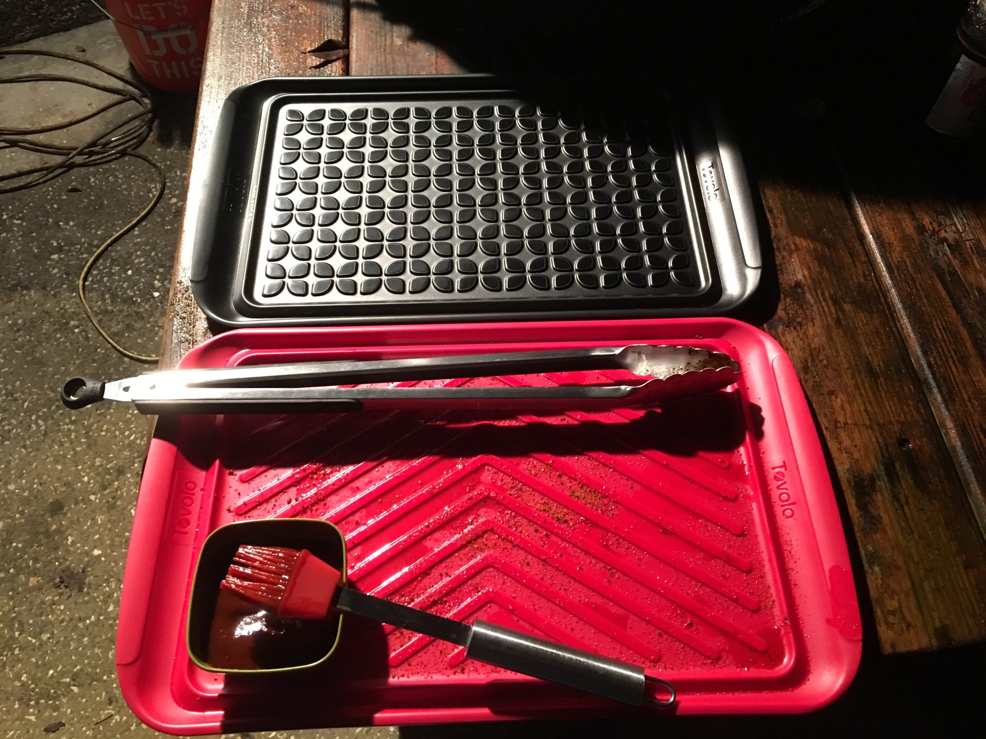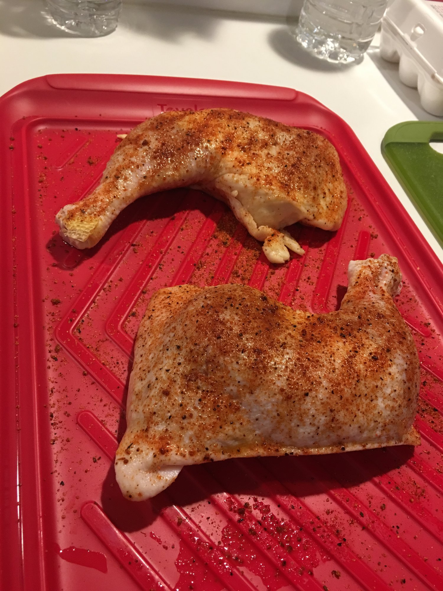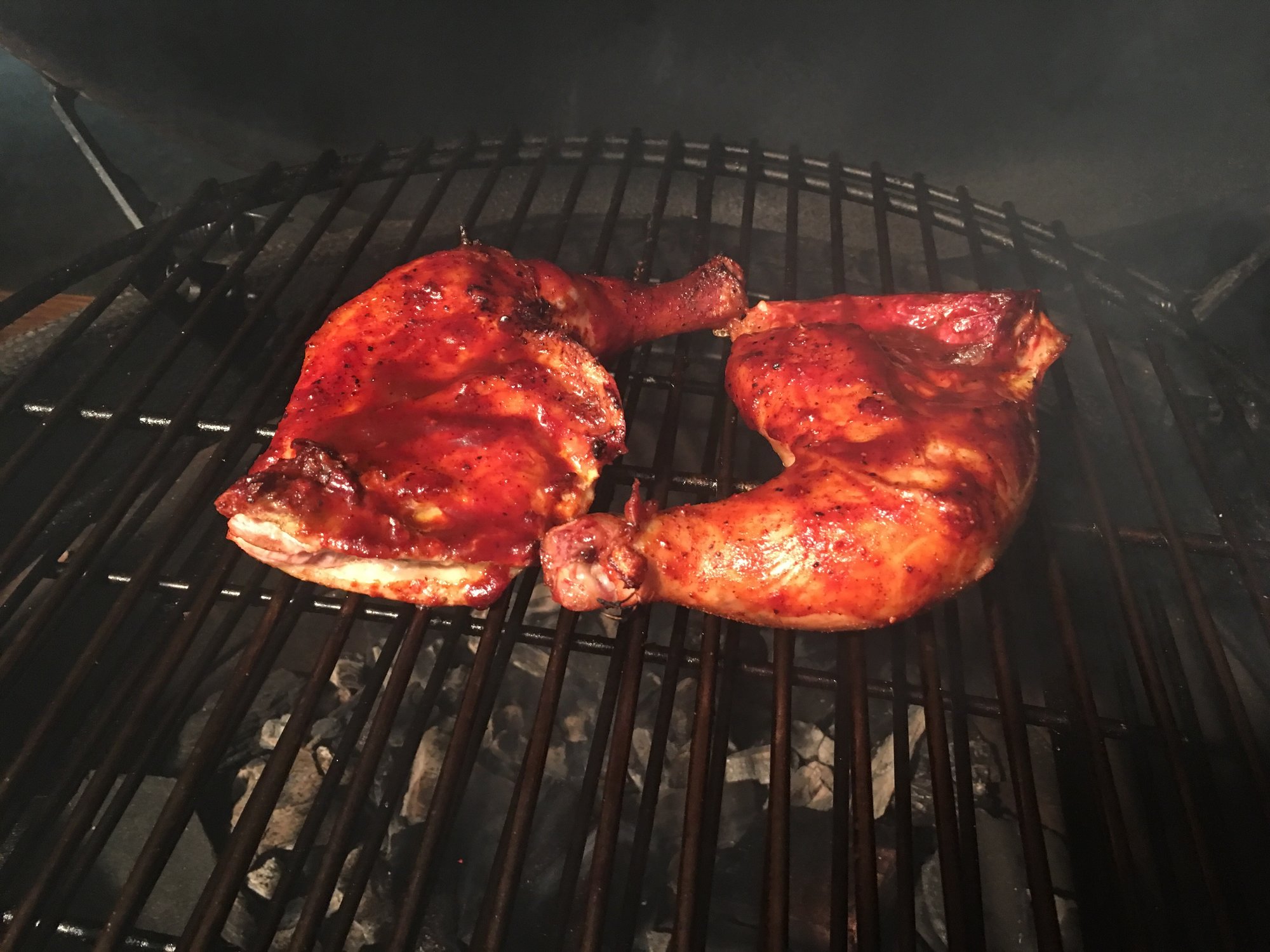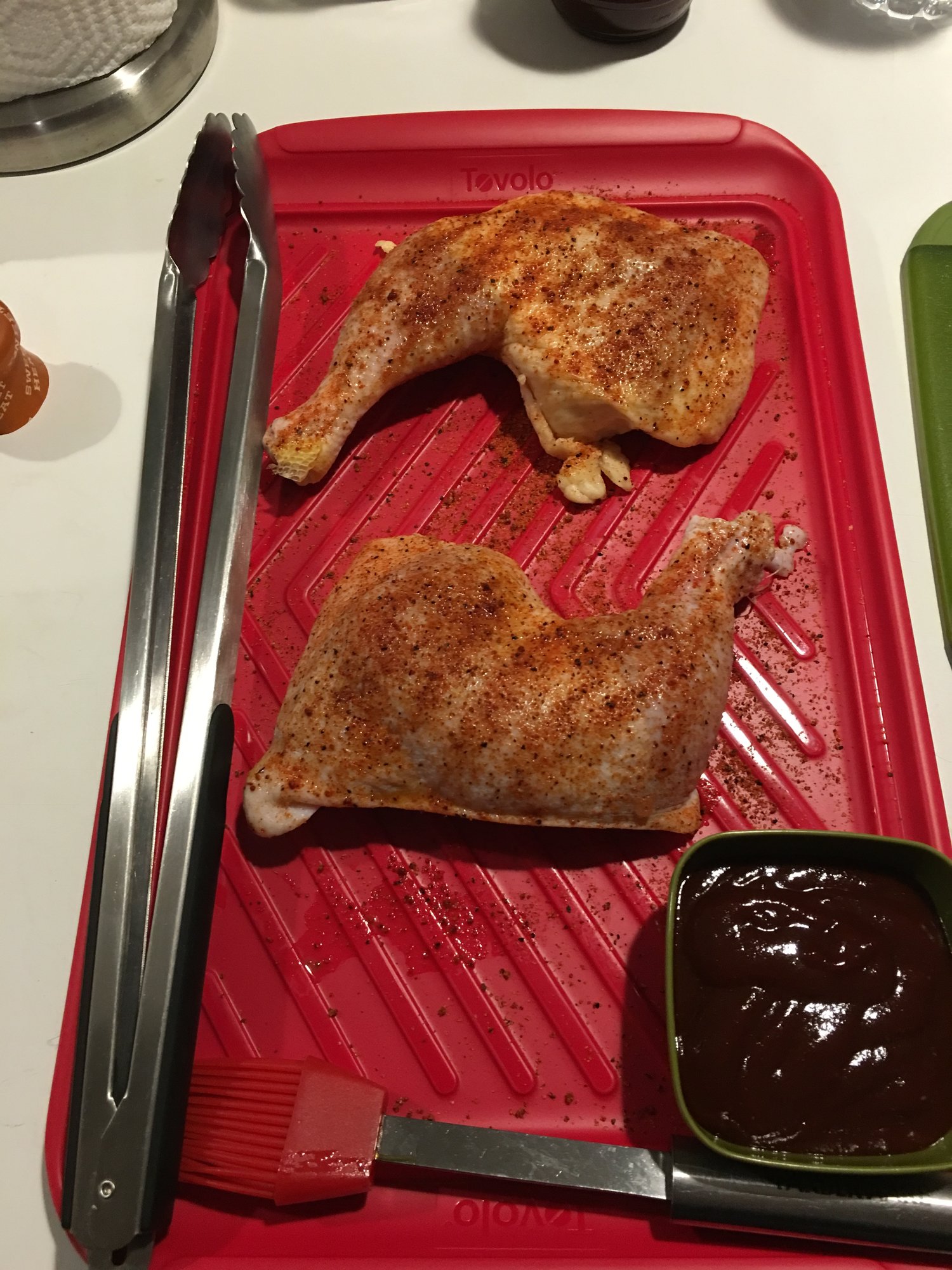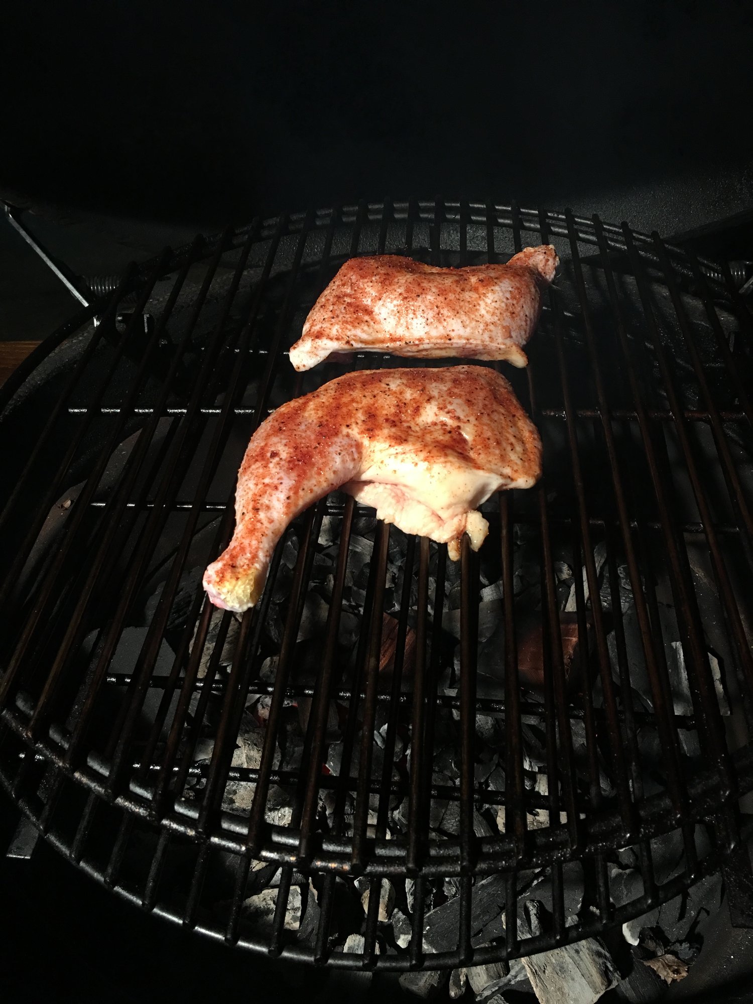 boring I know, but chicken quarters hitting it direct 375 with a little cherry. And a coors light.  Plow boys rub, and some sides getting dressed on the boos block