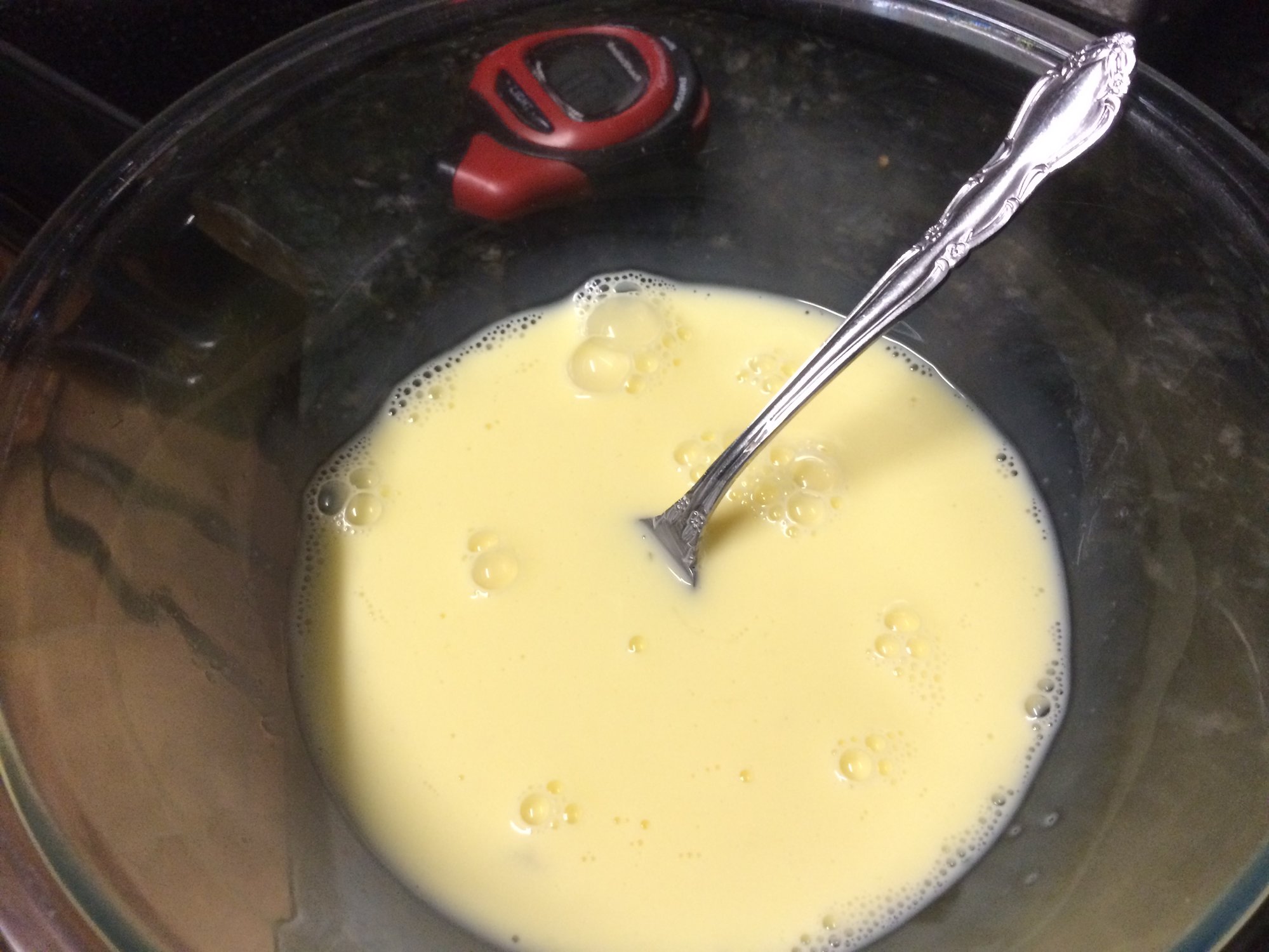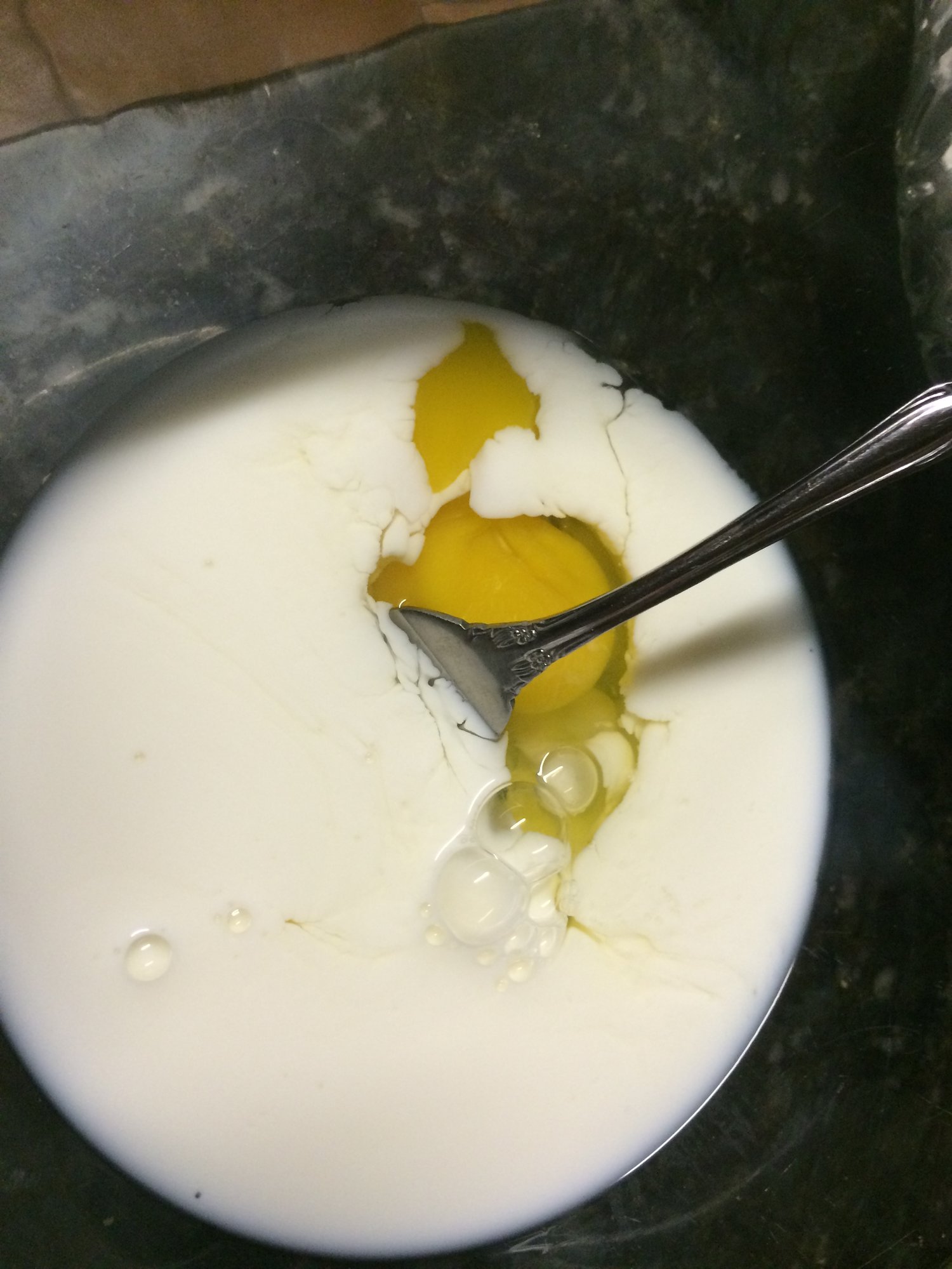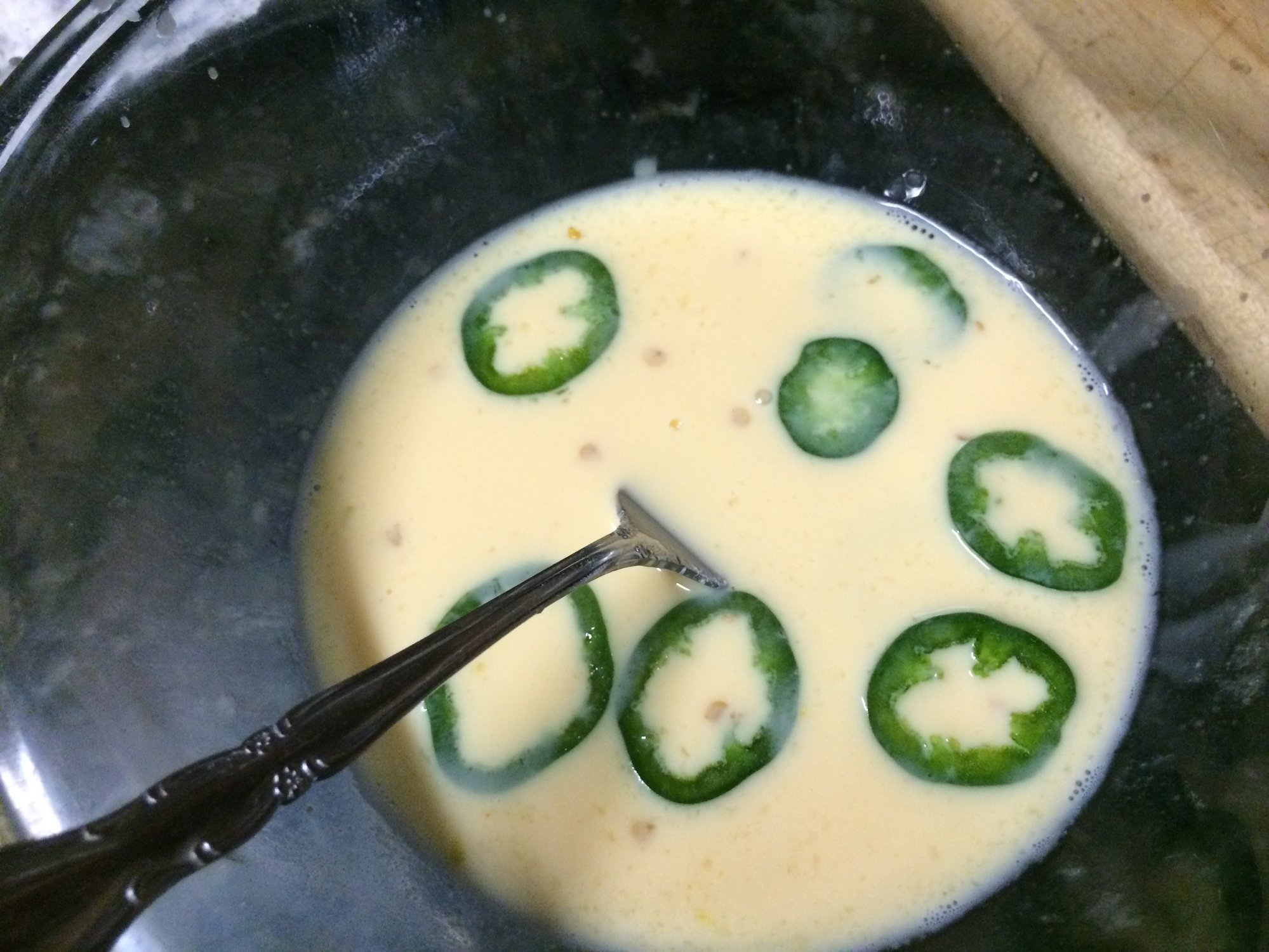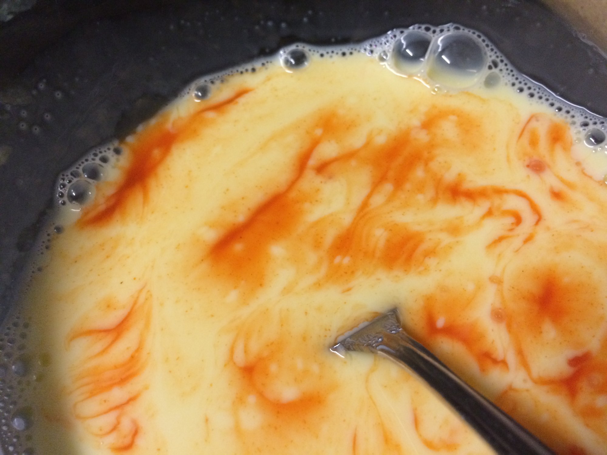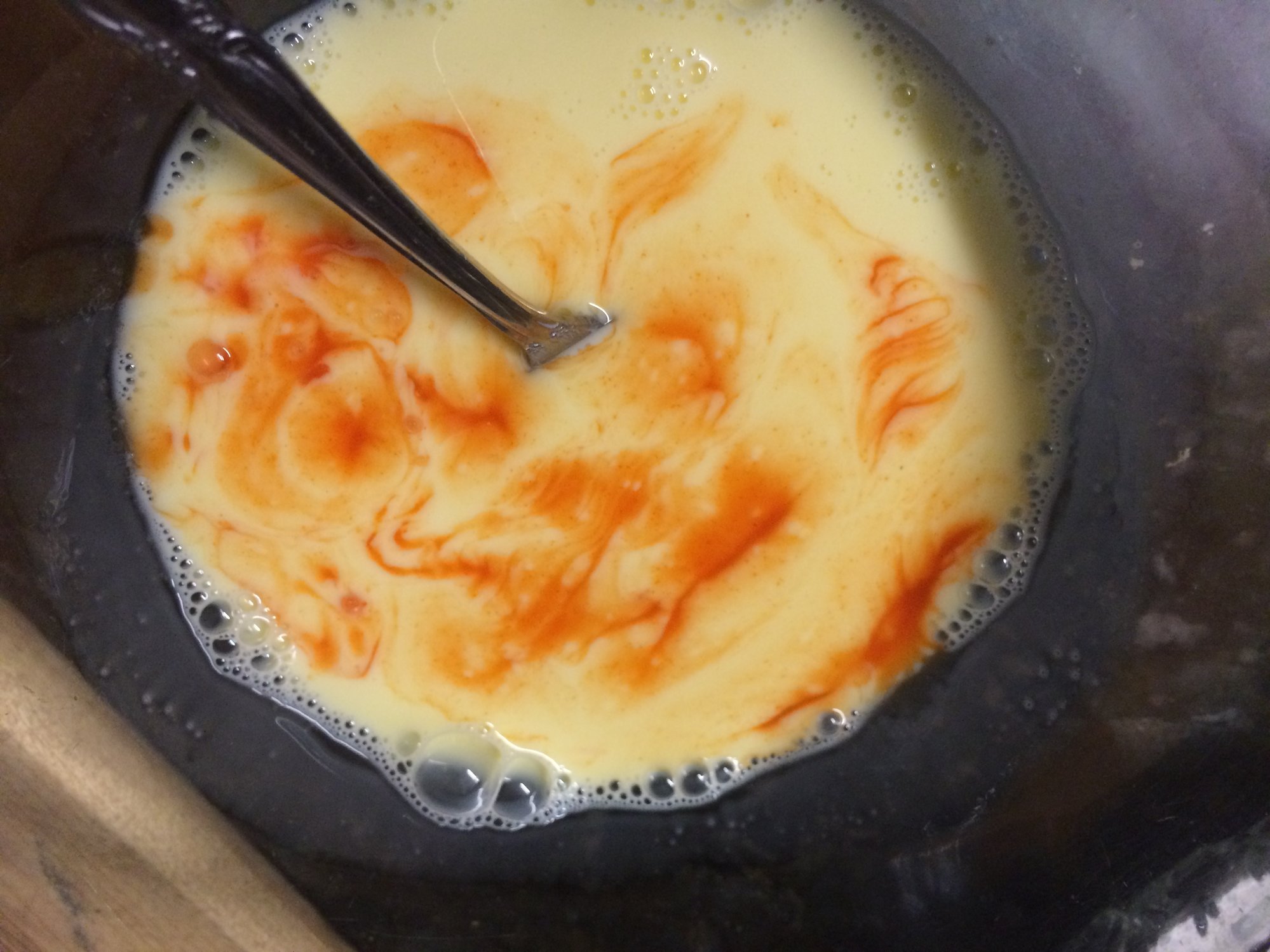 A hot wash of 2 eggs, 1/2 cup of whole milk and 4 tablespoons of hot sauce.