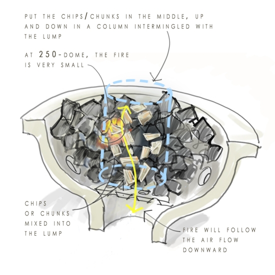 i add my chips or hickory bark (shagbark) all around IN the lump (not on top), because the fire is small and travels around.   if i have small chunks, i usually add them in afe places nestled into the lump, and after lighting, will put some wood directly into the hot coals.