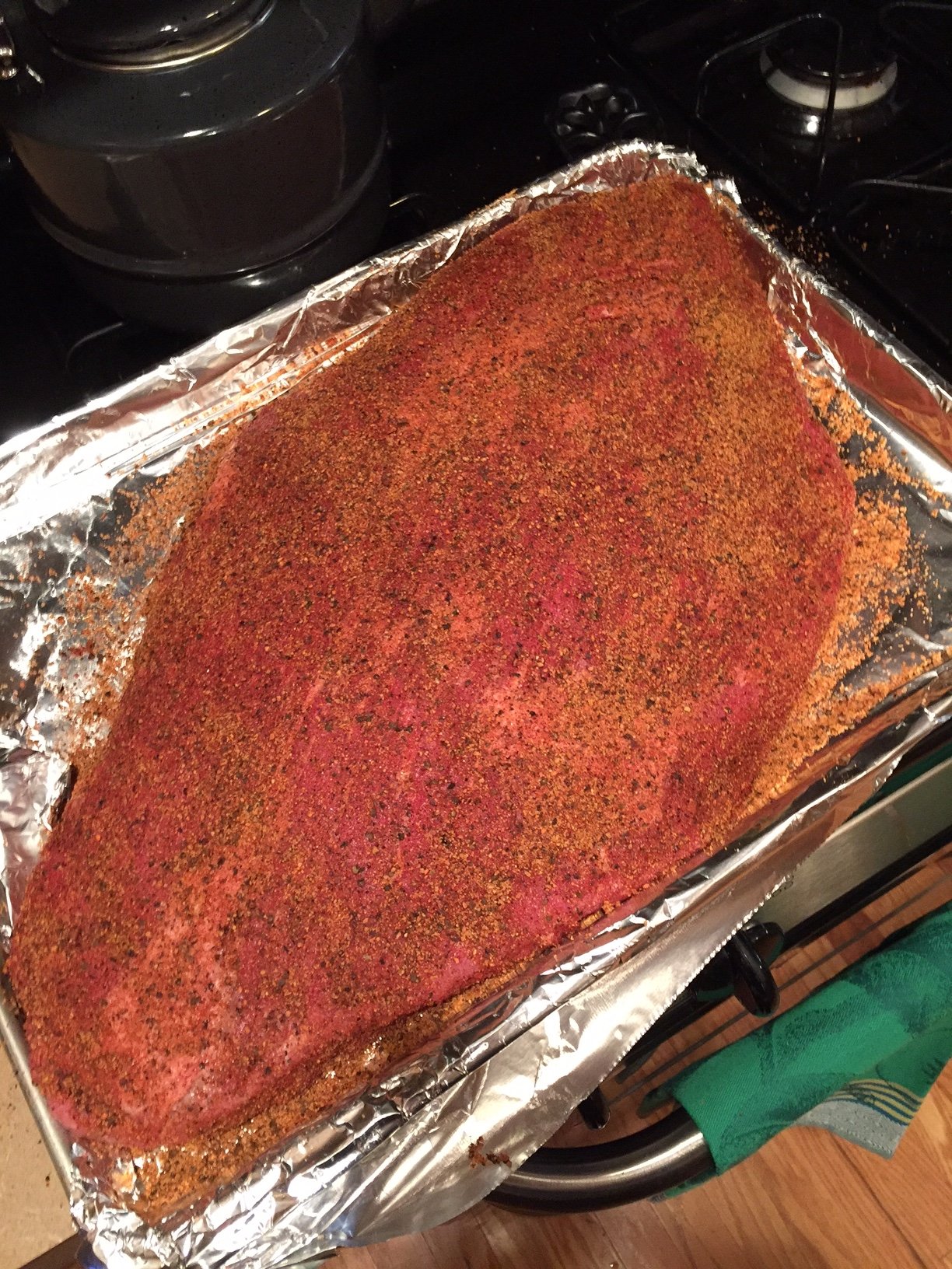 Been with my egg for just under a year. With the nice weather in Chicago this weekend, I decided to try my first brisket. I went with a 7 lb flat from my local butcher. It came trimmed, although had a small fat cap on it. I rubbed all sides down with "Bull ****" rub. Got the egg rev'd up to 225-250 then placed it on the grate, indirect fat side up.