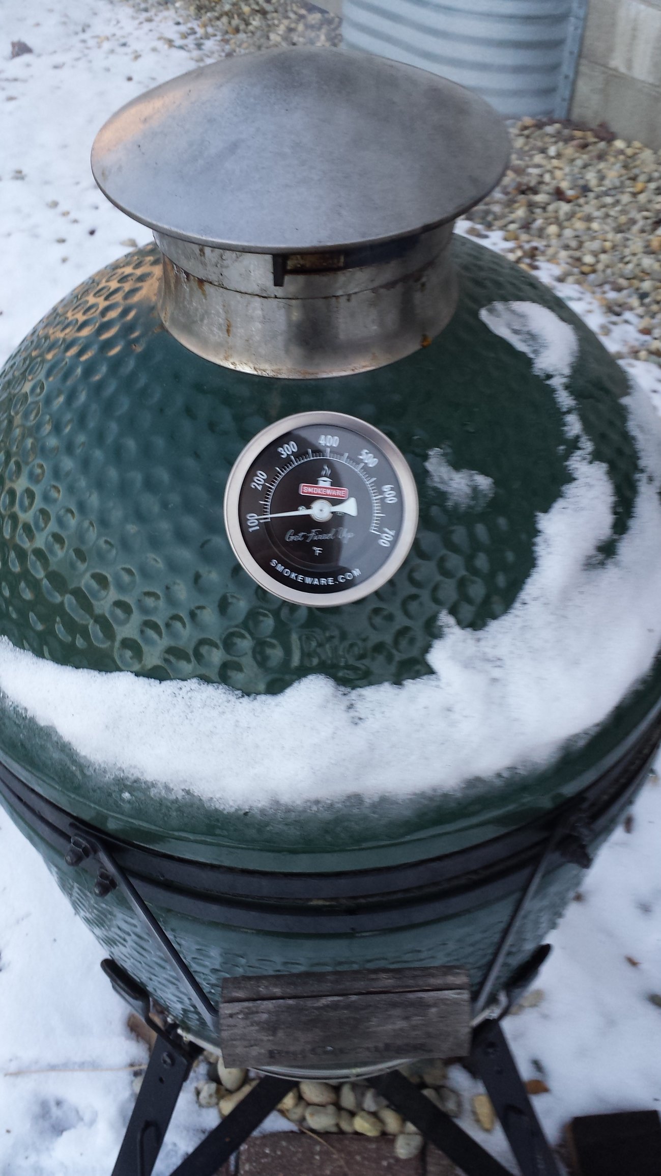After cooking all day and perhaps enjoying a few beverages I decided to pull my cap off. I also pulled the gauge and put it in the snow. After the gauge was cooled down and flames were shooting out the top of my egg I popped the gauge back in. I went inside for a few minutes and came back out. The gauge wrapped all the way and I watched it climb to "250" again. Then all hell broke lose. I'm not real sure what happened but the either the egg or the thermo made a loud pinging noise. The gauge dropped back down to 200 and stayed solid.