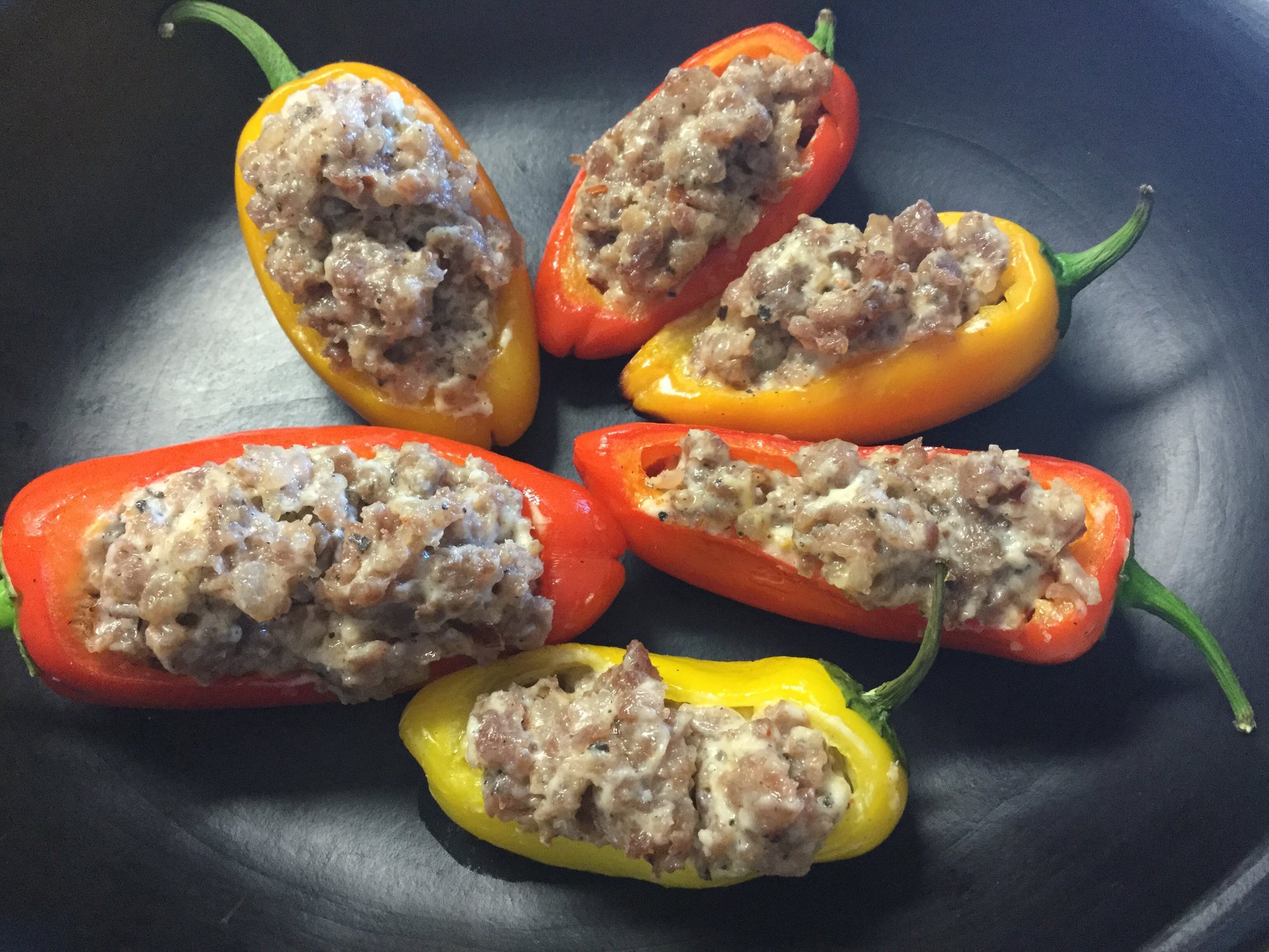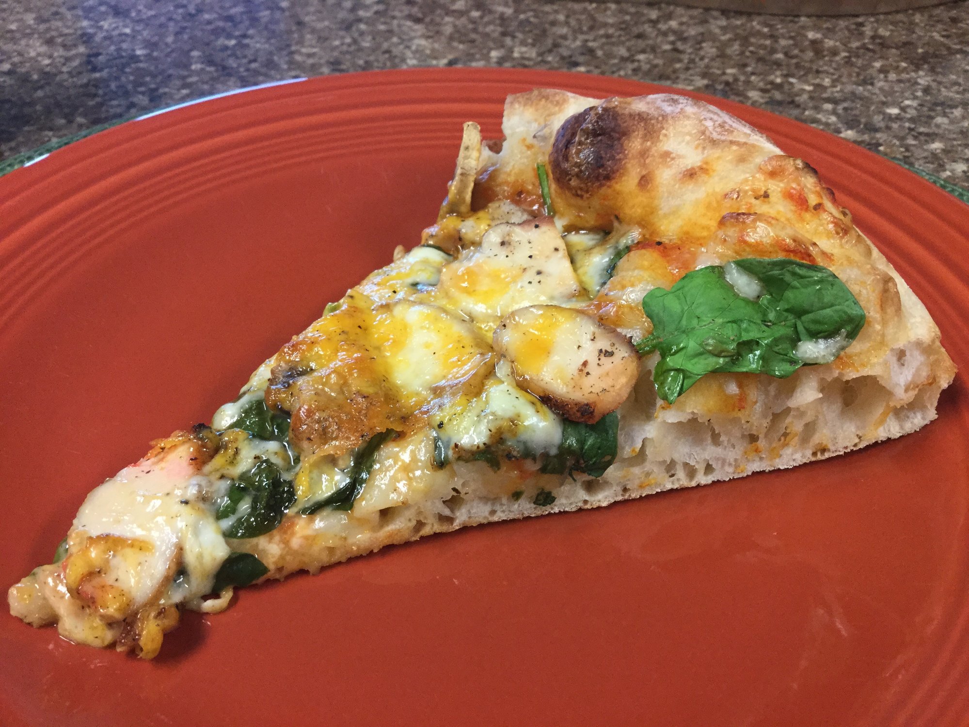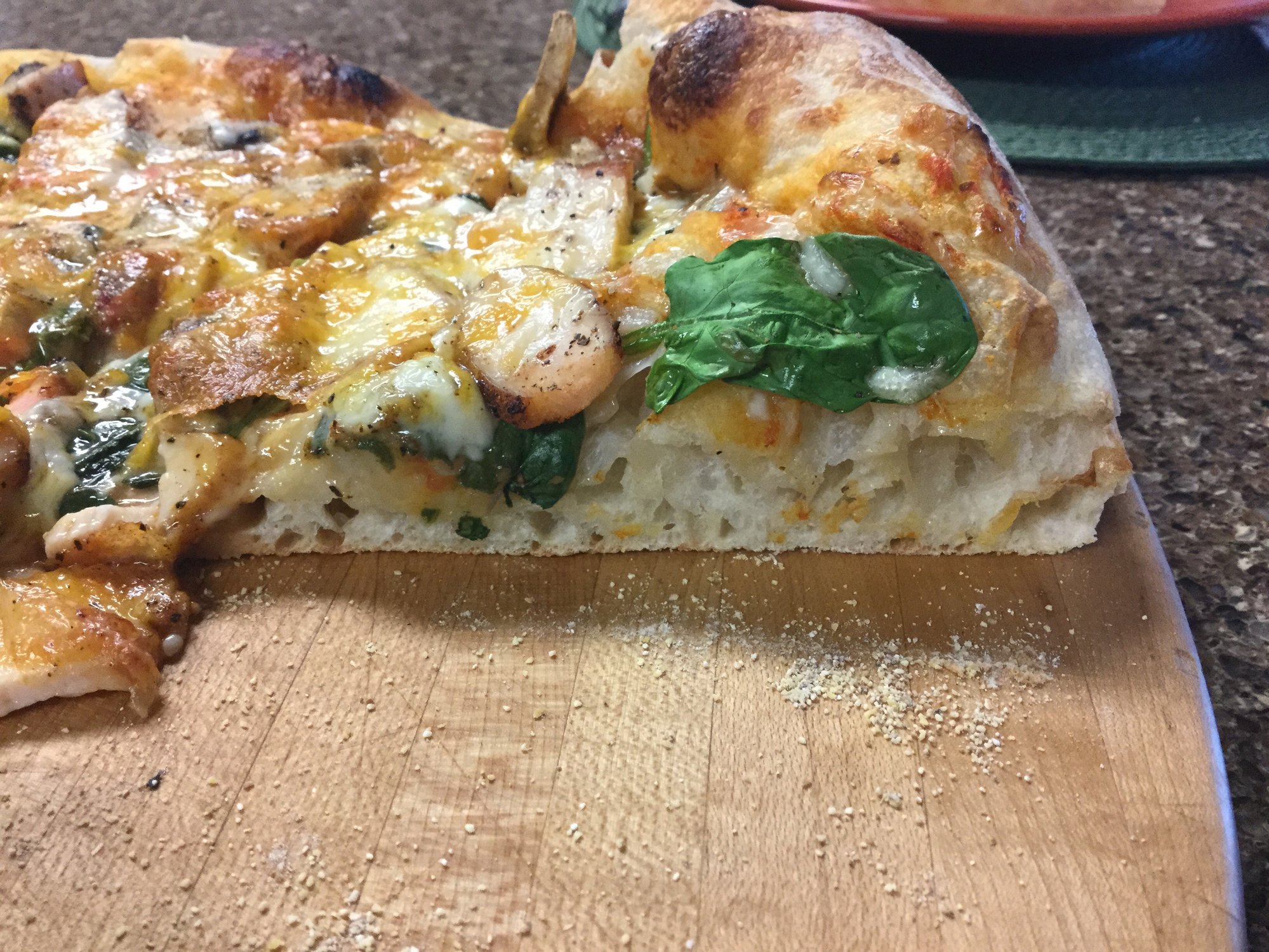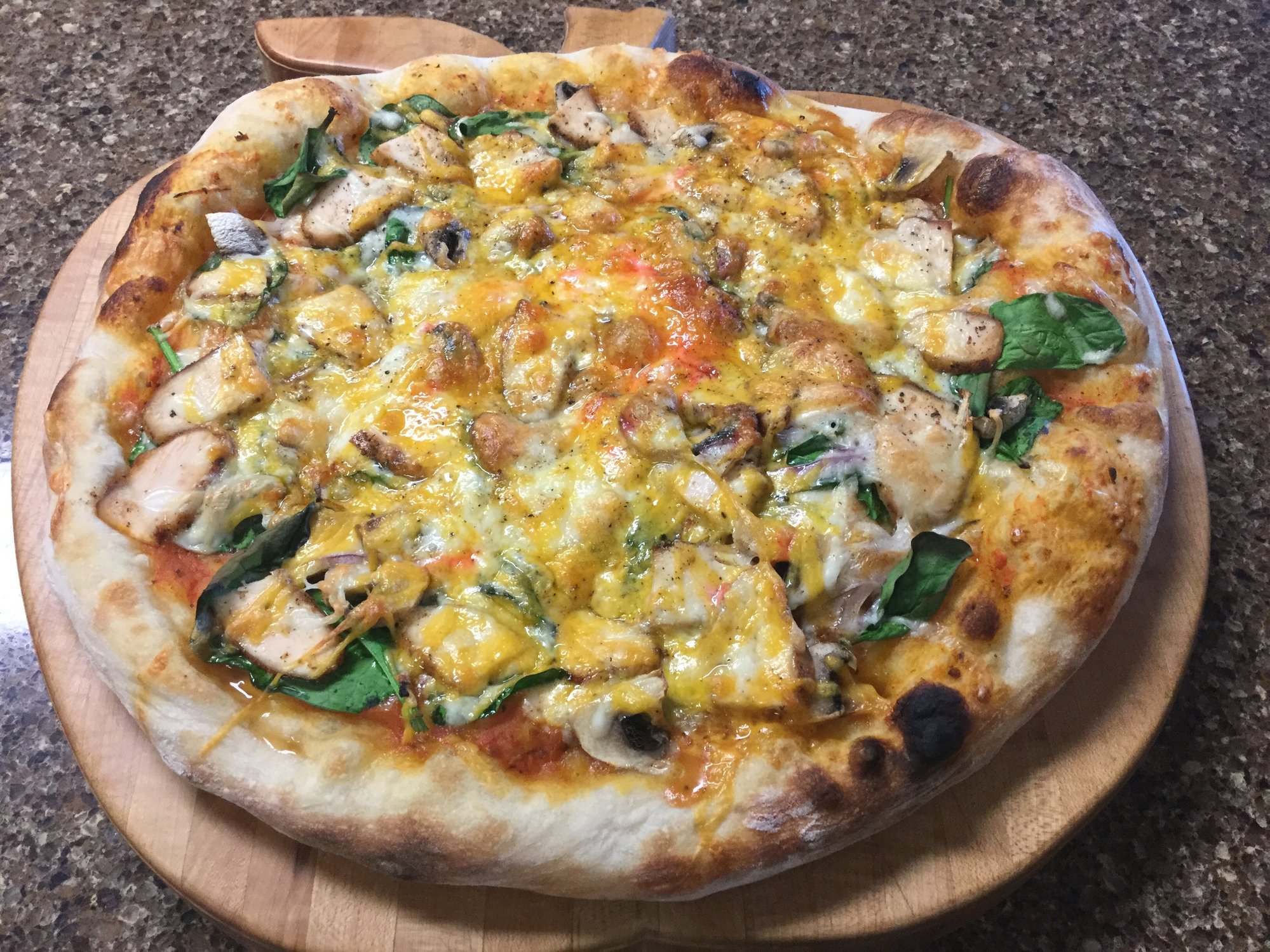 No-knead pizza dough took about 20 hours to get happy. 70% hydration with King Author bread flour. Chicken, onions, mushrooms, spinach, and cheese. Appetizers were peppers stuffed with sausage, cream cheese, and Parmesan.