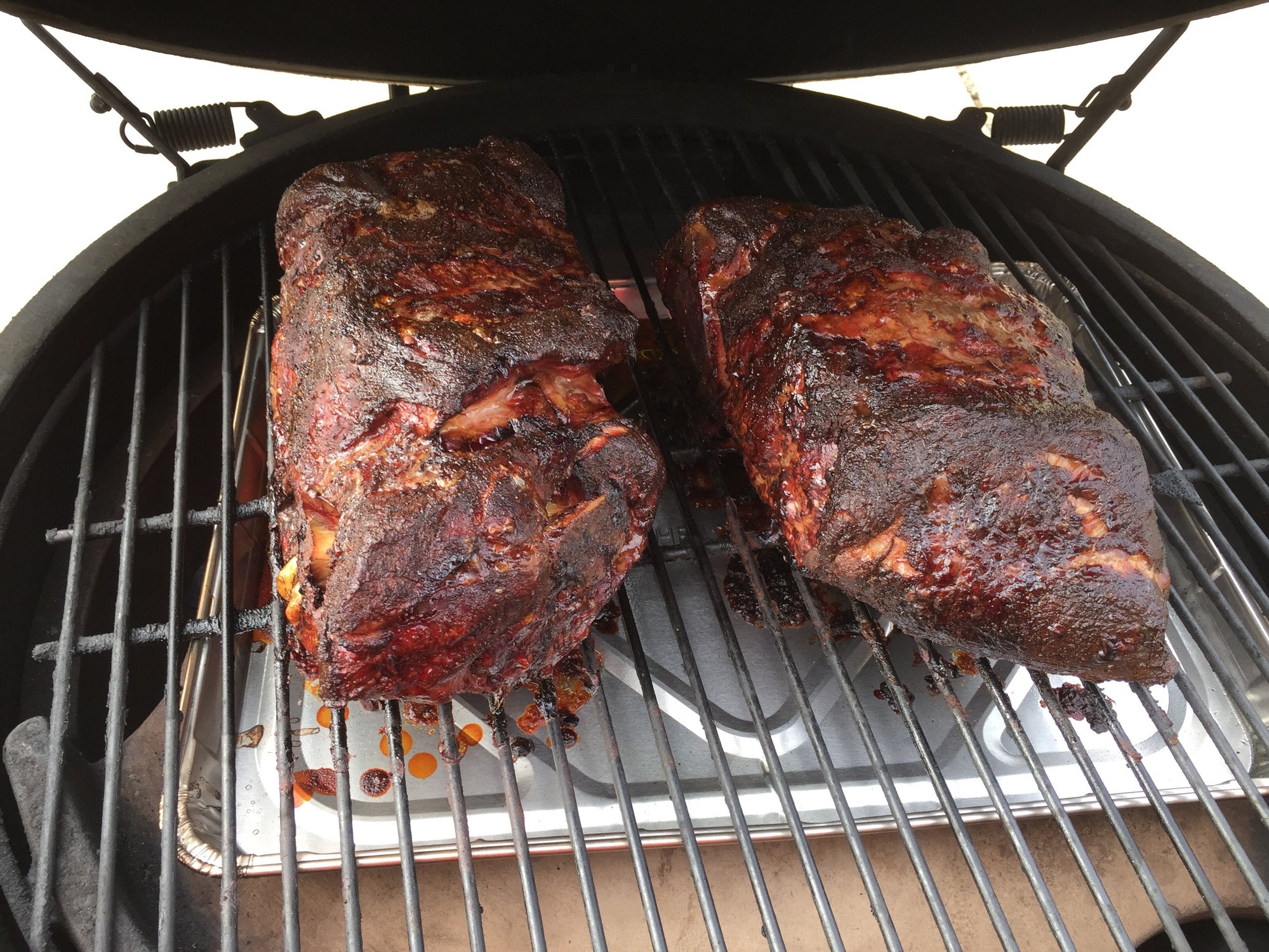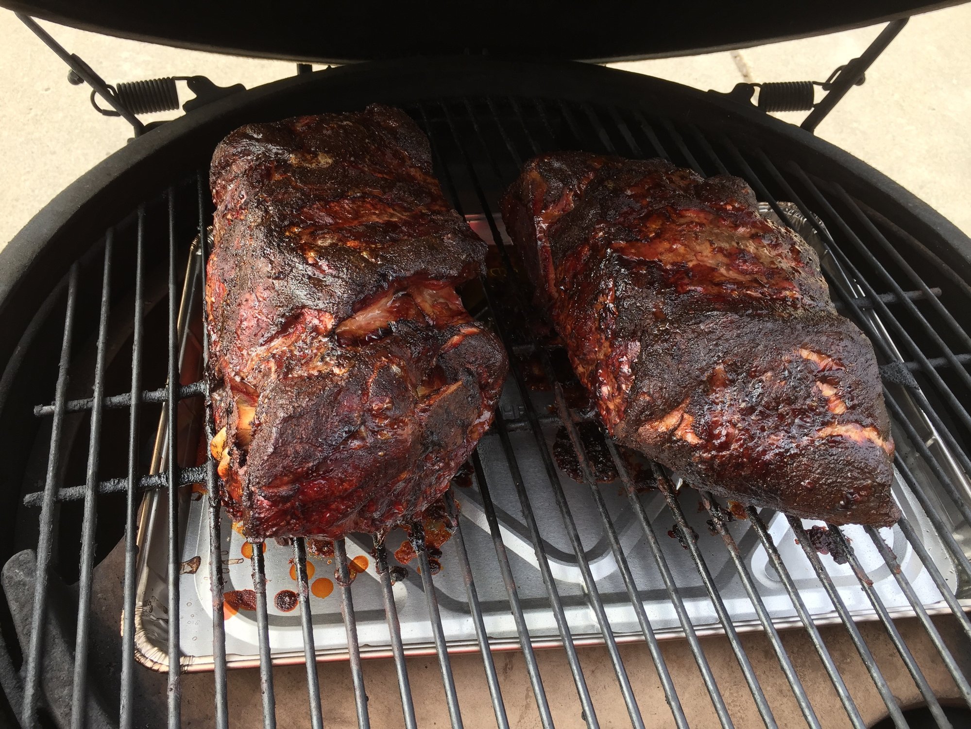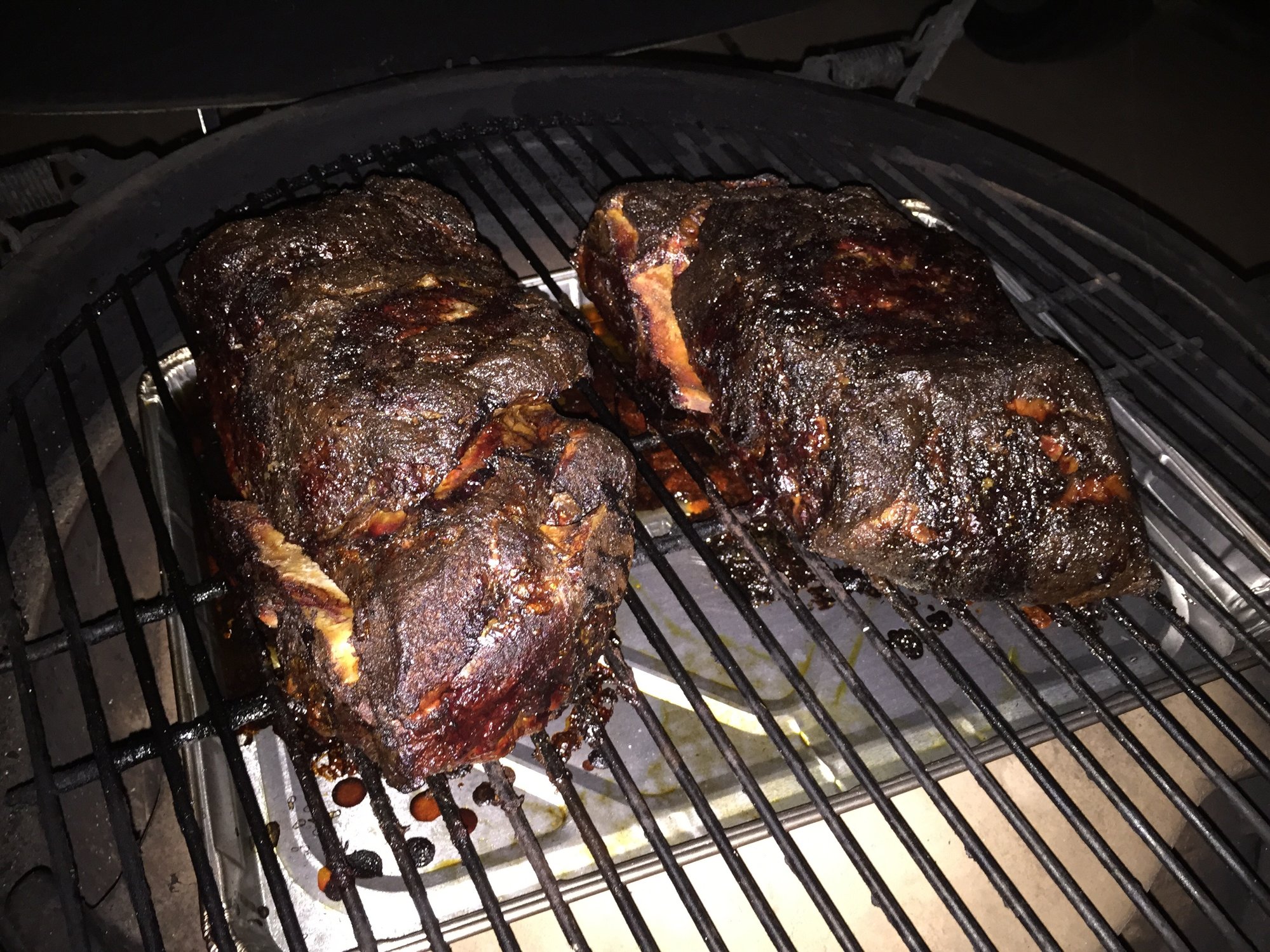 1 seven pounder on the right, 1 seven and 1/2 pounder on the left slathered in mustard and rubbed with DP Dizzy Dust dialed in at 235 dome with 6 chunks of Apple through out the lump. I expected it to go 2 hours a pound, nope! I was planning on a 14 hour cook that took 16/17 hours to hit my number 202/203 but I planned and had time to spare. 99 cents a pound for Great Eats. 1st pic is 9 hours 150/154 IT Charlotte, Michigan XL BGE