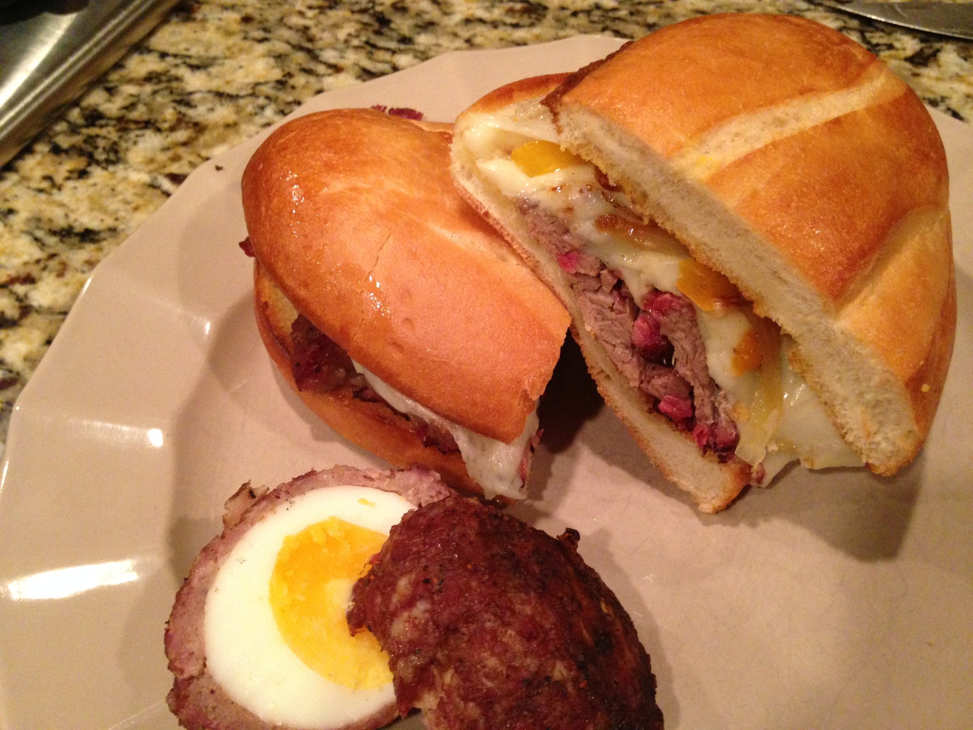 Fajita pulled beef tortas, scotch eggs, queso fundo and boiled jumbo shrimp. Pictures in any order.