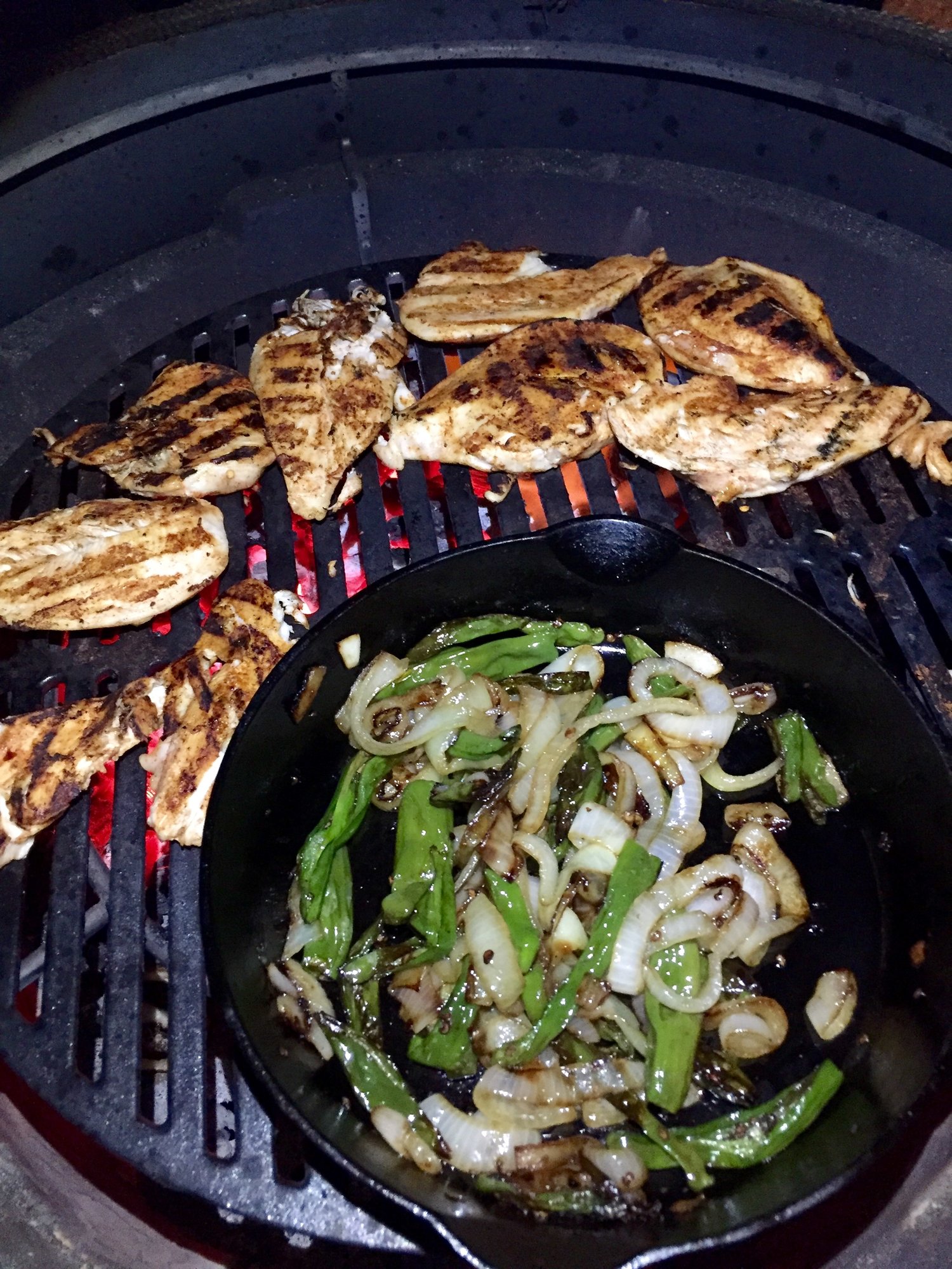 chicken breasts split and heavy coating of Loveless Cafe peach rub (thx @henapple) grilled hot and fast down low along with a CI pan of onions and split shishito peppers