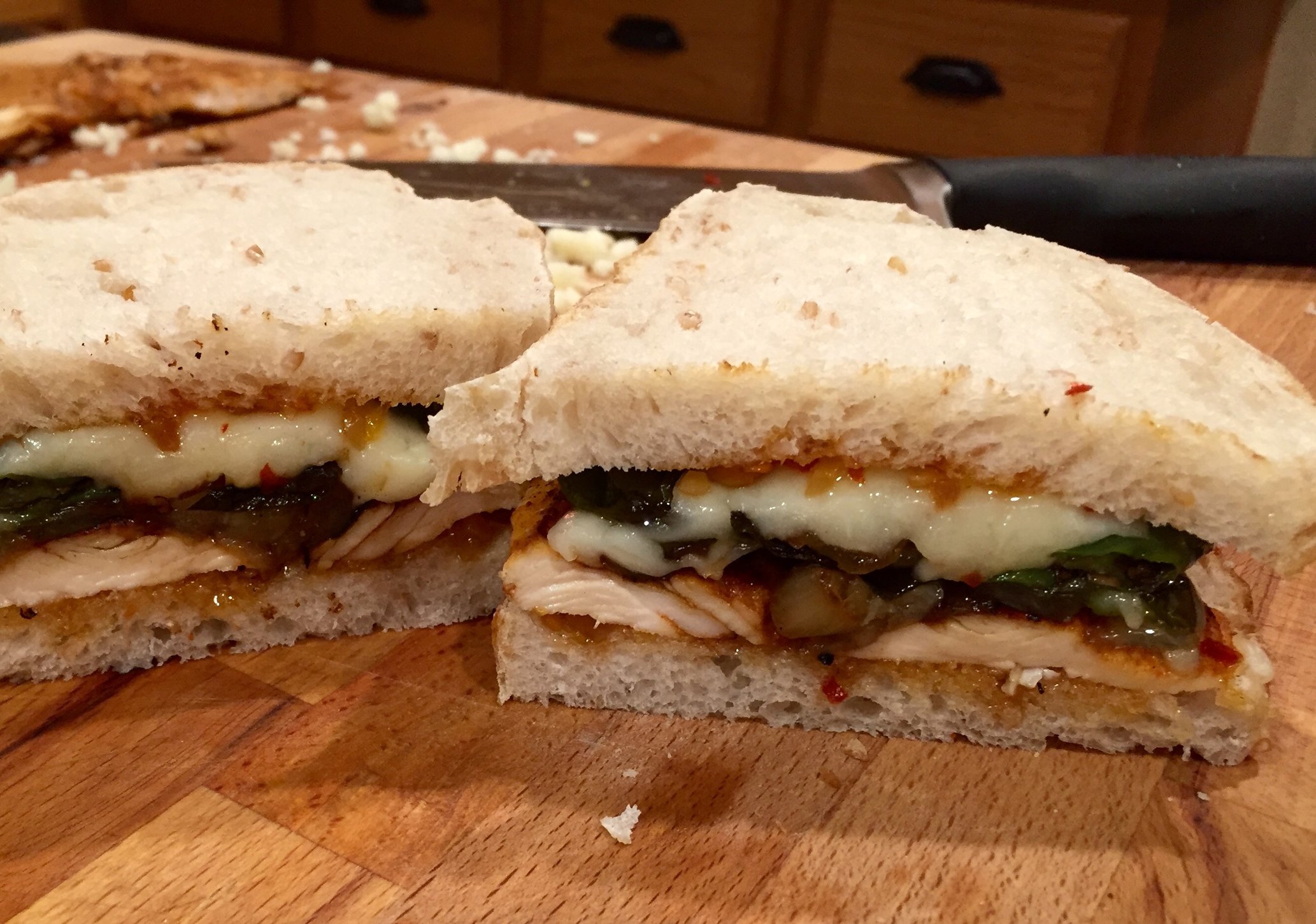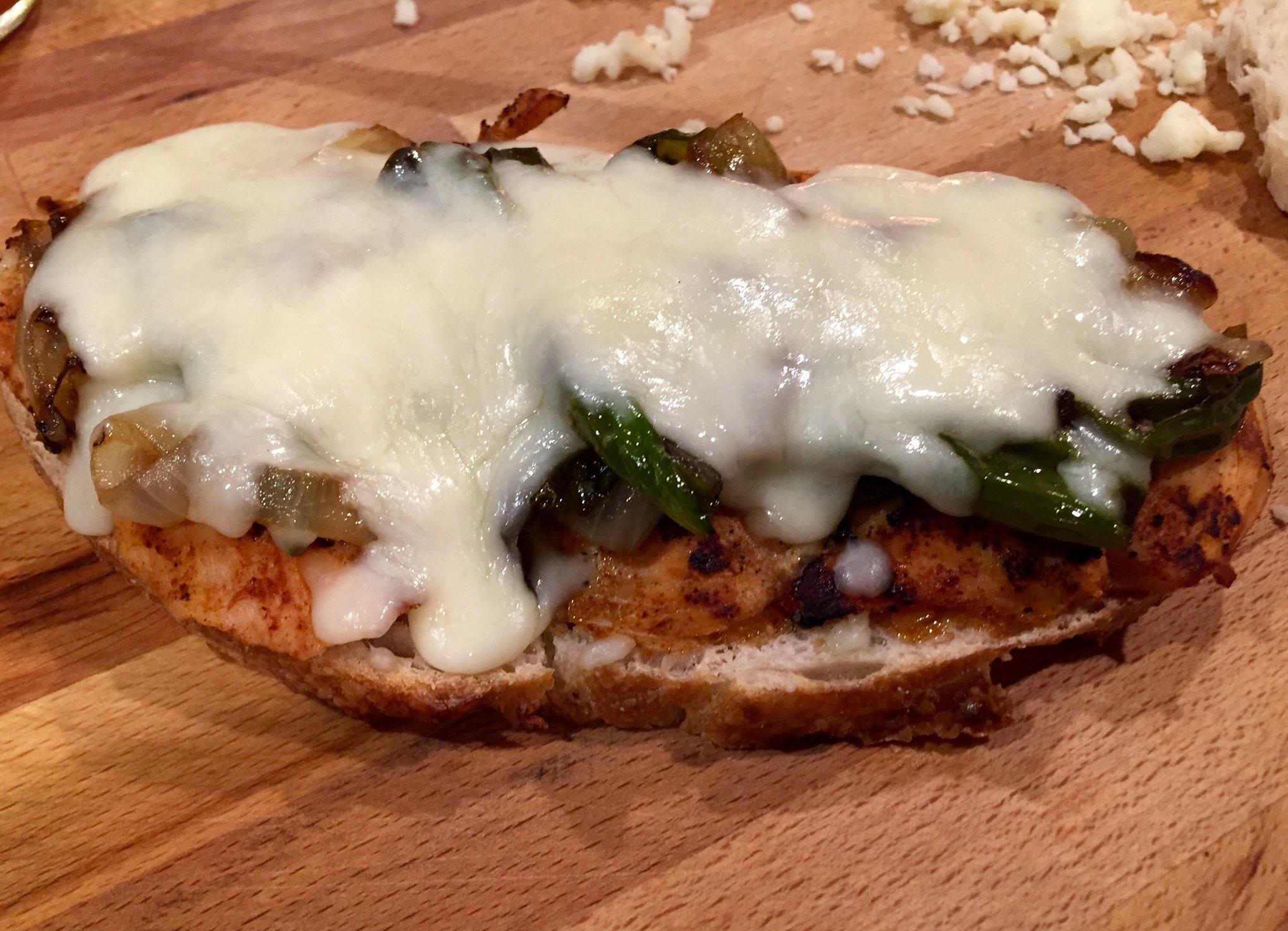 Chicken and onion/peppers piled high on sourdough coated with a mixture of peach preserves and TJs Hot and Sweet Chili Jam, then a melty blanket of mozzarella.