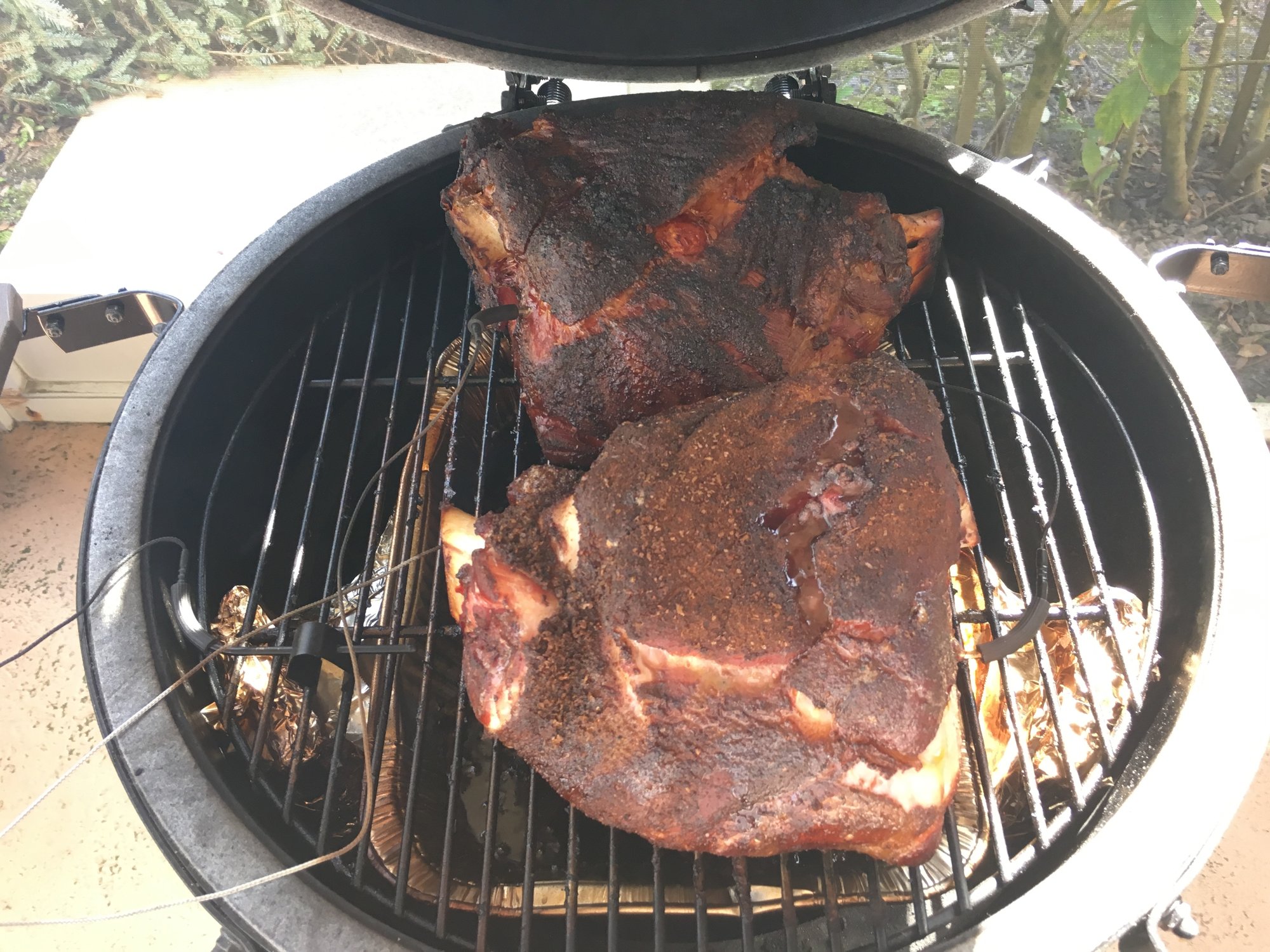 • No they dont want the skin. I dont know why they selected the picnic.I always get the Boston butt. Anyhow, heres an update. The big one was making me nervous so instead of risking not being done, I turbo'd it overnight at 340. Internal temp was at 175 when I woke up. I had to reload the egg an hour after I was up (apparently lump burns fast at 340), put it back on with the 7lb one and here is a shot just before taking the 10lb (the one in the back) off. It was at 205 everywhere. Now waiting on the 7lb. Looking good so far. Thanks for all the advice.