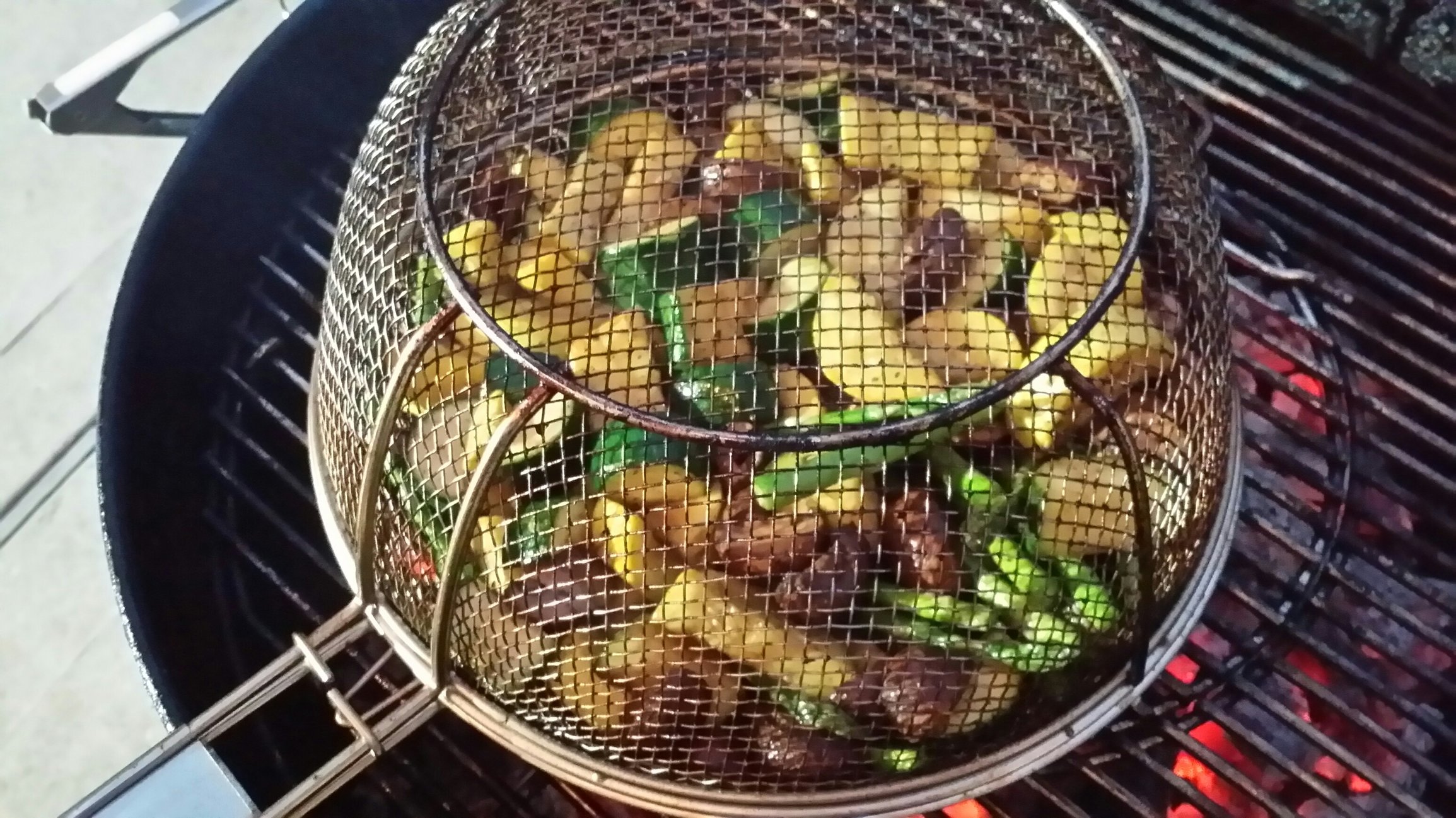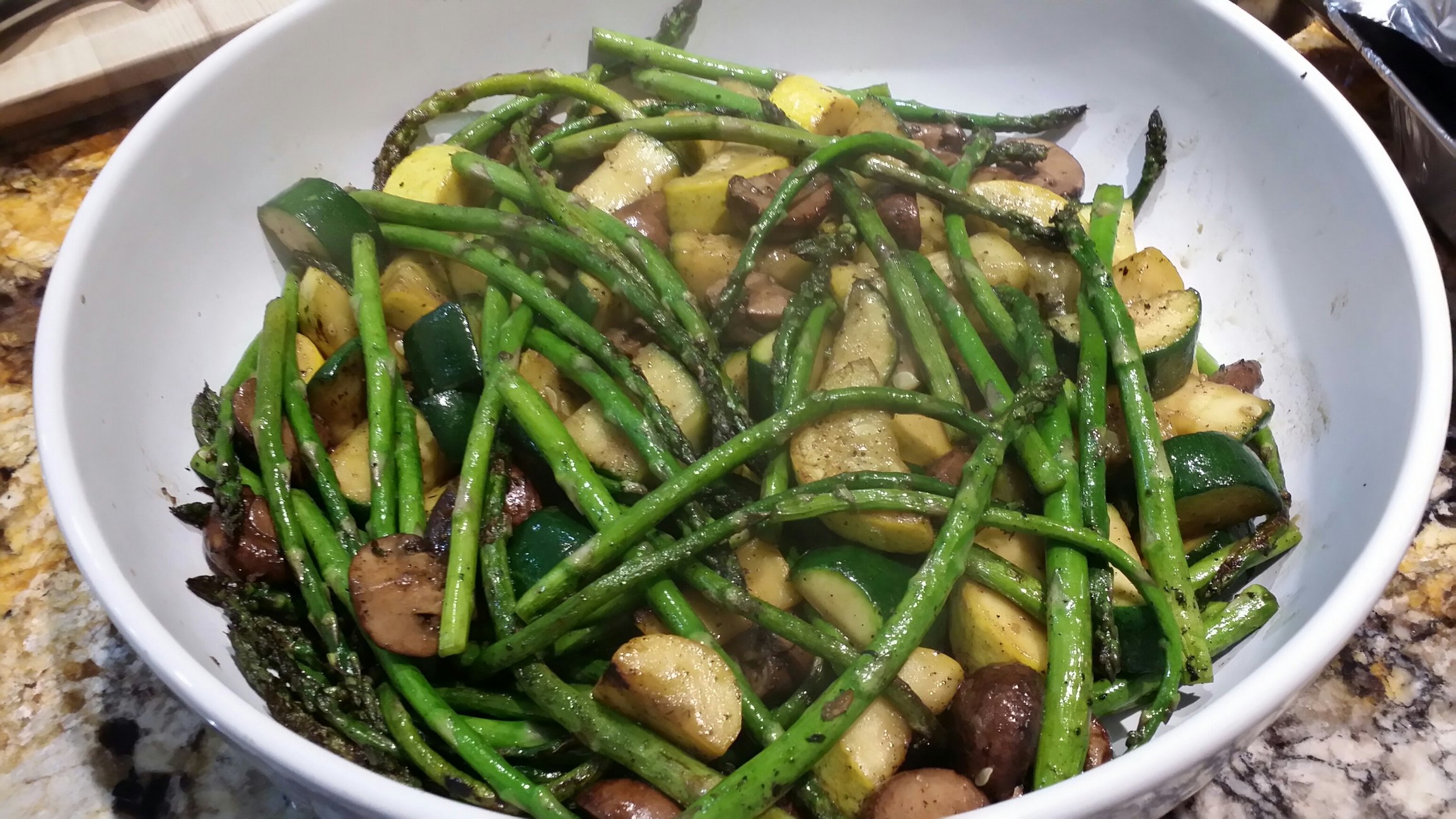 I do marinated mushrooms first, added the zucchini, squash and cooked a little longer, then added the asparagus last because it was thin. larger asparagus can be cut in half to cook faster and better fit basket. Veggies just had olive oil, salt and pepper.