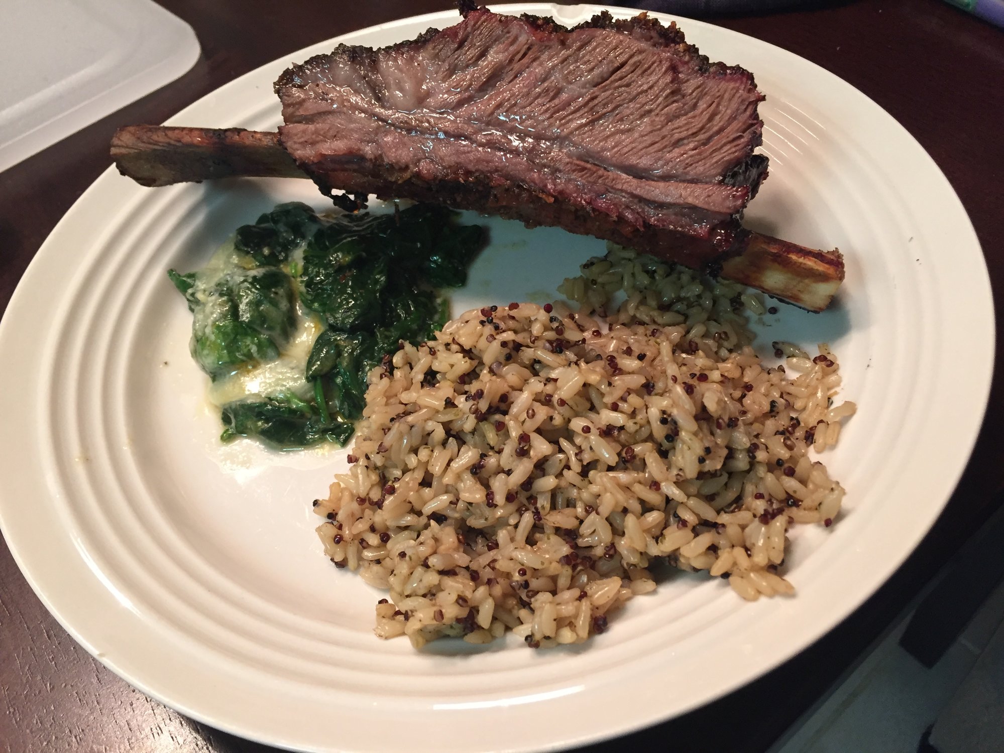 And here's the money shot guys... Thanks to everyone who helped me on this first beef rib experience. We plated with wifey's Italian spinach and garlic brown rice and quinoa mix. If I could describe the taste of these with one word, it would be RICH. Man. Are these things potent beefiness! They were delicious and wifey approved as well. Slid right off the bone, completely intact. Thanks again.