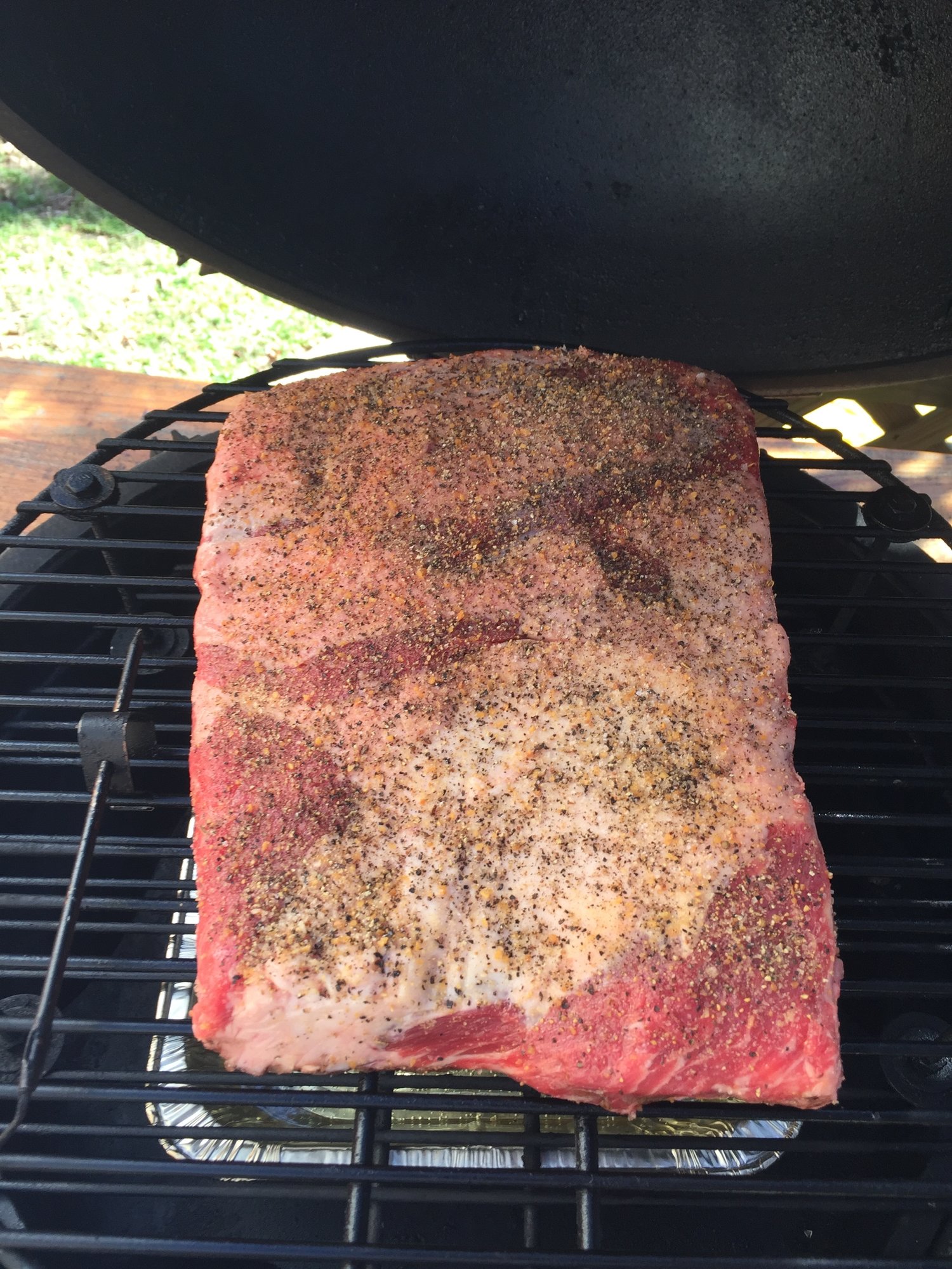 Ok folks, all setup. I went with my normal brisket setup and rub, except doing the ribs on the top rack. Water pan below with a beer dumped in for the hell of it. Rub is thin layer of EVO, then granulated garlic, a light sprinkling of Montreal steak, Himalayn pink salt and fresh ground black pepper. Since I got a bit of a late start, I'm going to let them ride about 275.