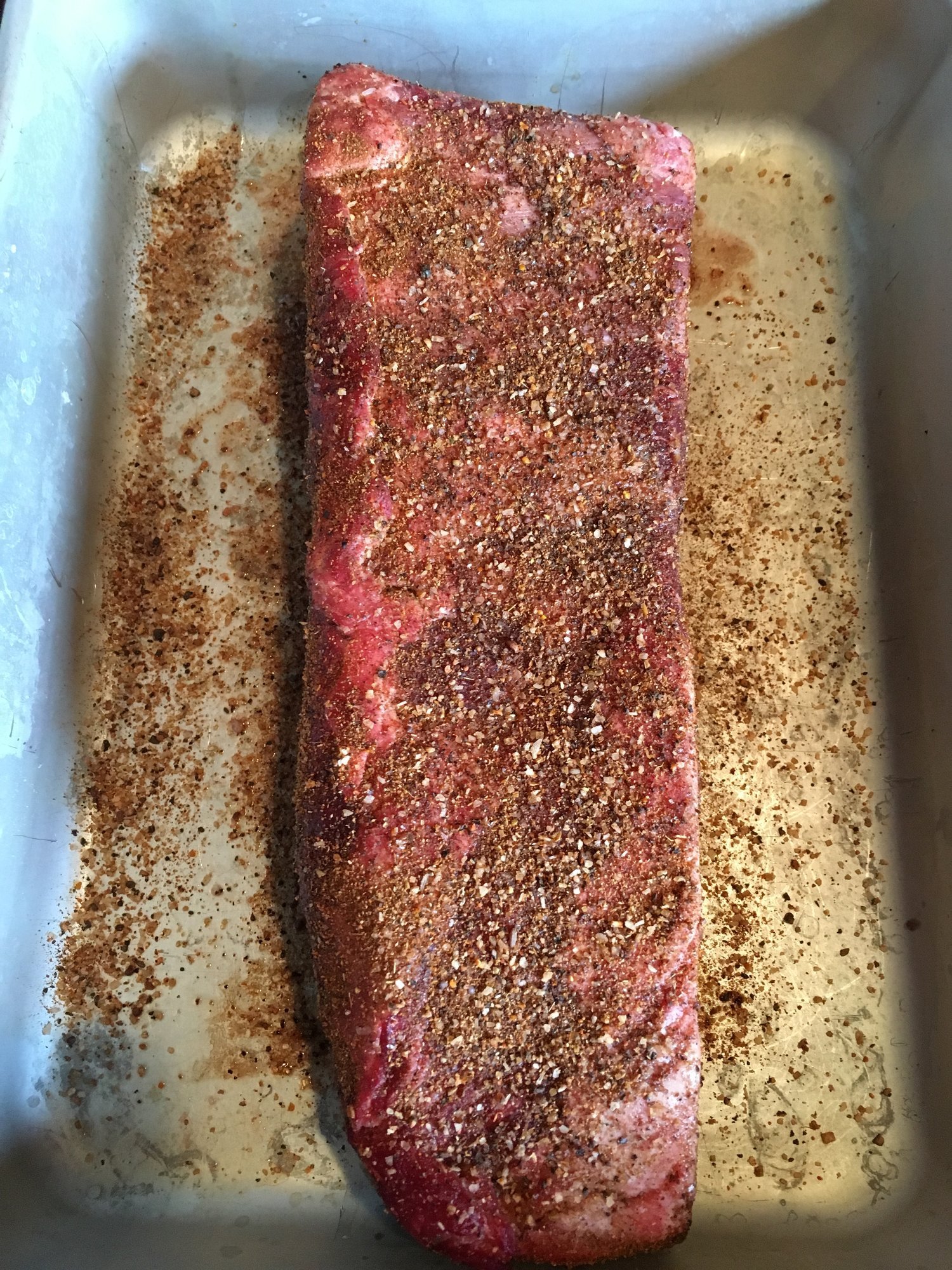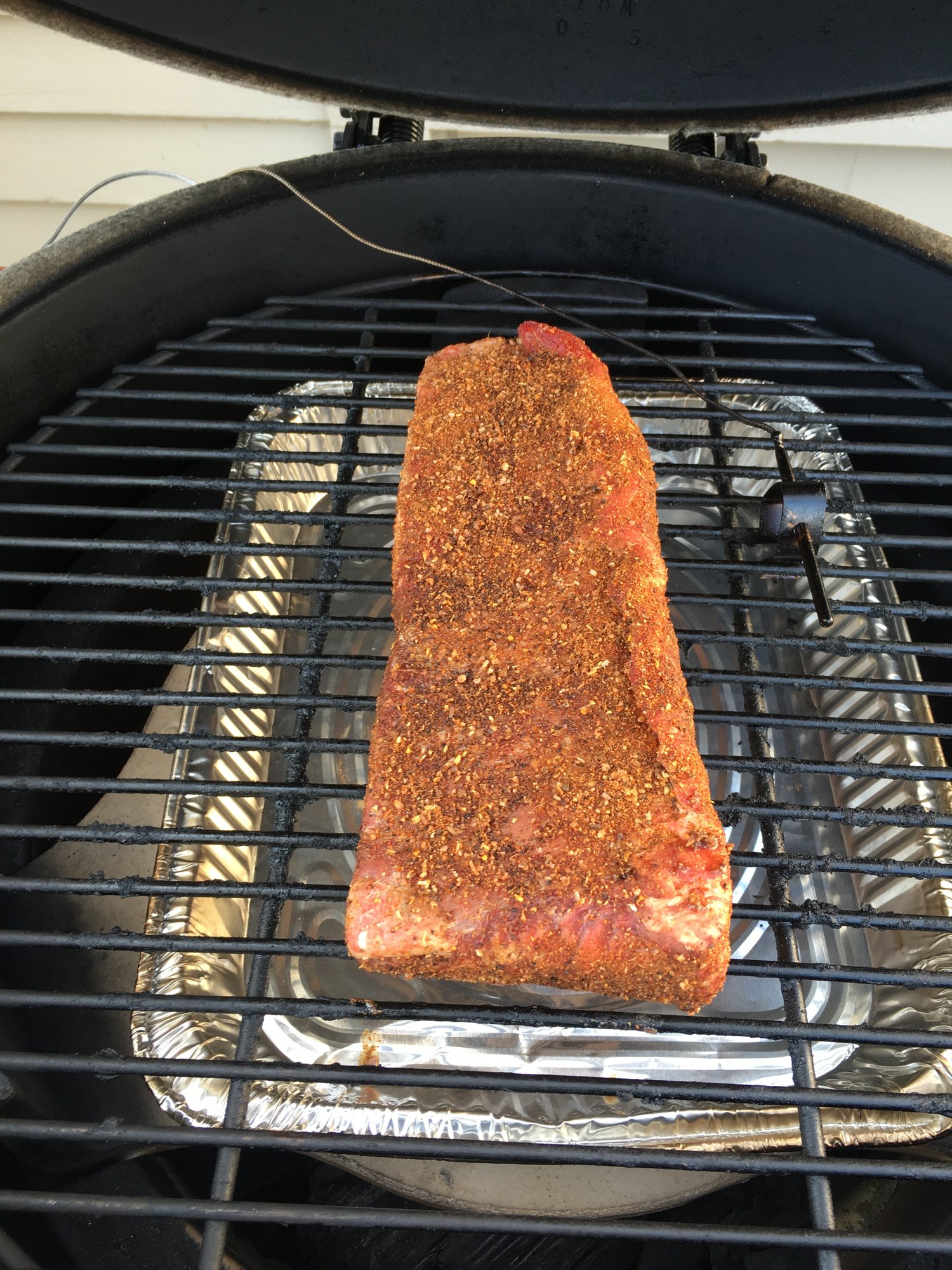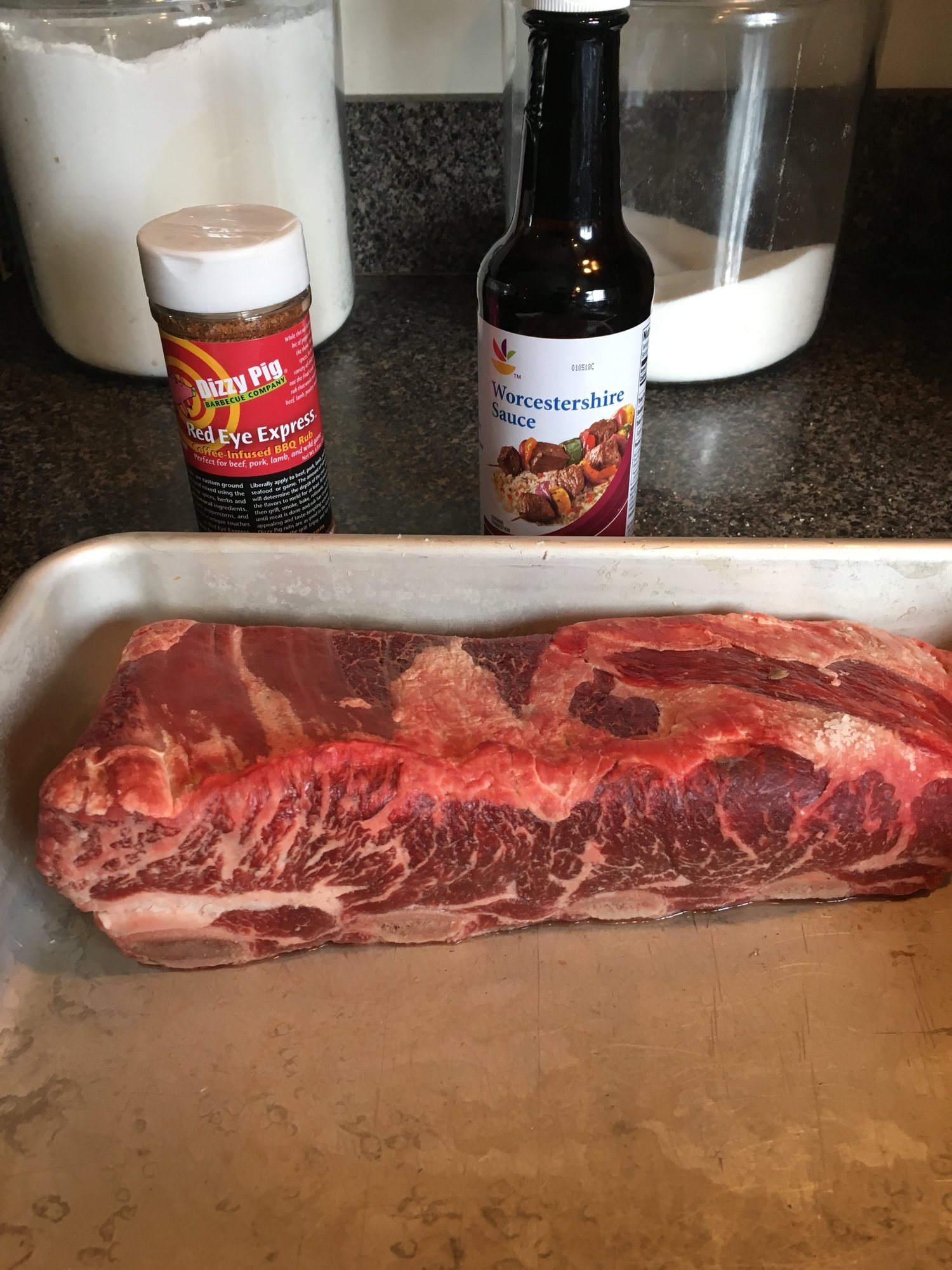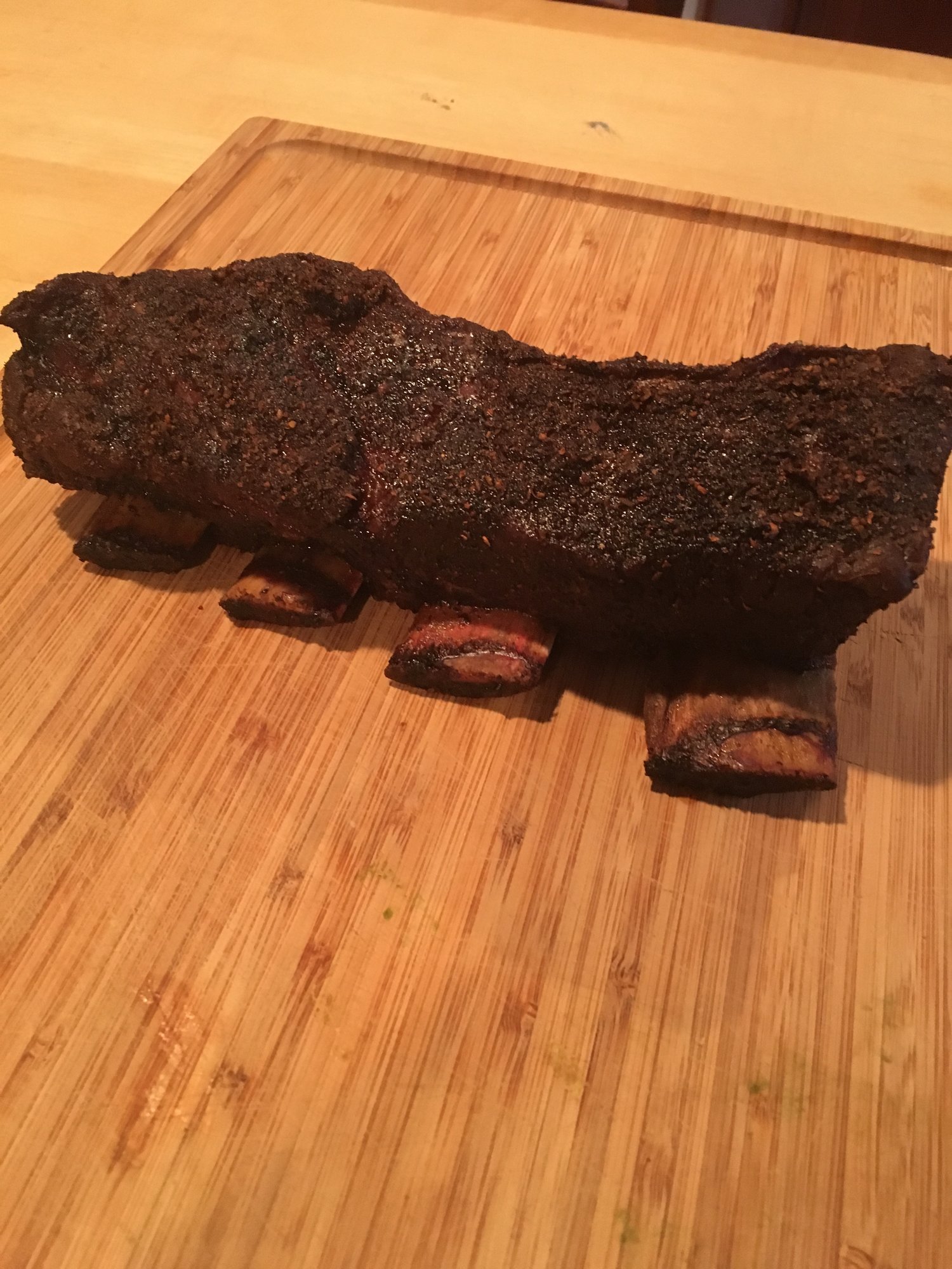 Went with a 2.5 pounder that I salted the night before.  Used DP's Redeye express with a Worcester slather.  Mixed hickory chunks into the charcoal and let it go at 250 degrees for 6 hours on the nose (indirect with an air gapped drip pan).  A very fun cook and those ribs were super rich and tasty.  I probably left them on there a bit too long, but I wasn't hearing any complaints from anyone.