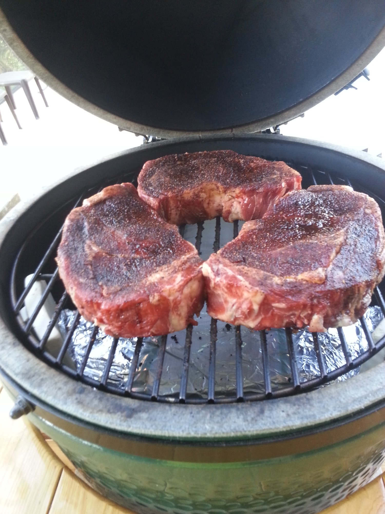 Thank you for the speedy responses. The steaks are on indirect at about 275-300. They are rubbed with Lane's Ancho Expresso, a rub that my wife and I really like.