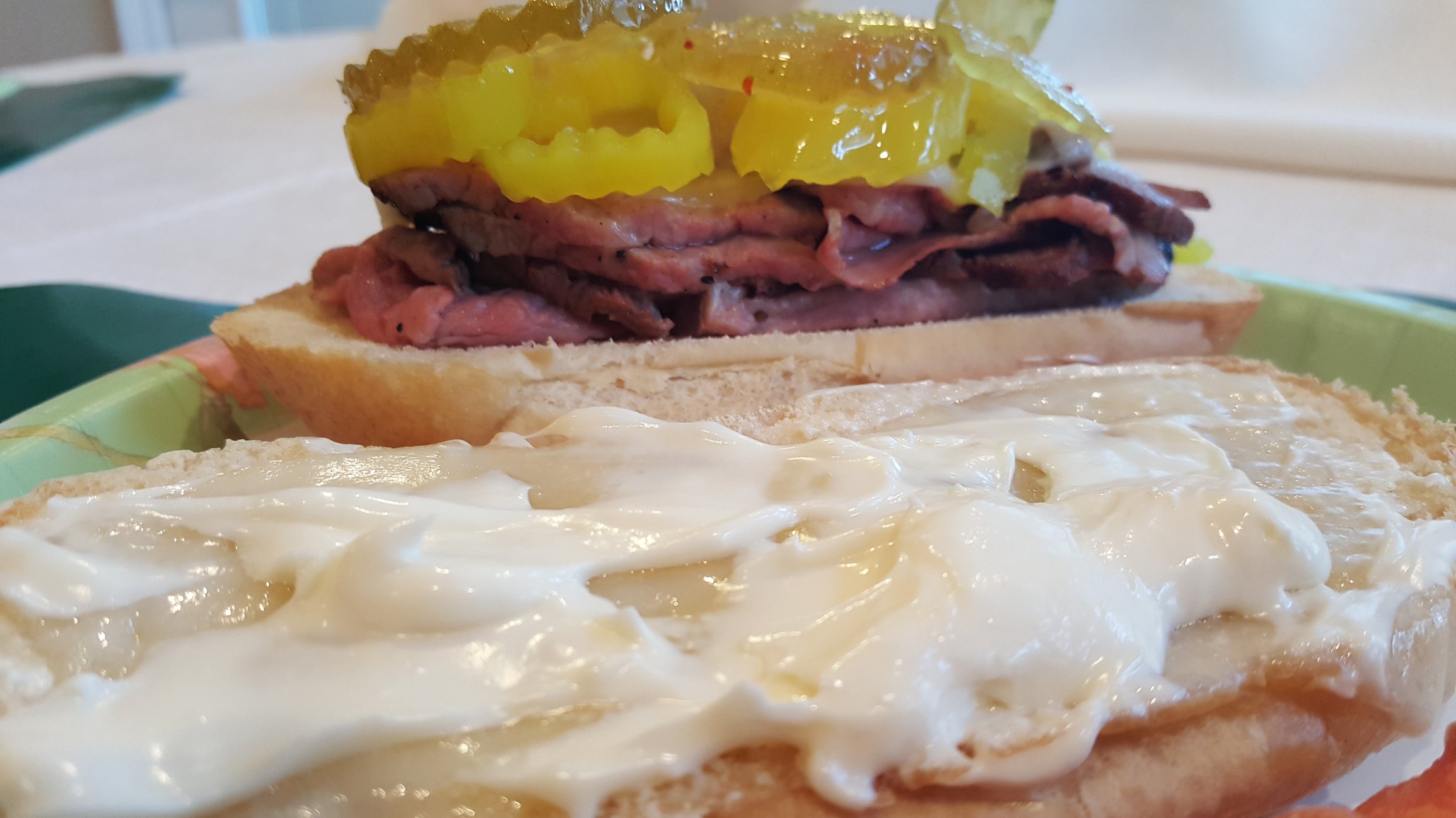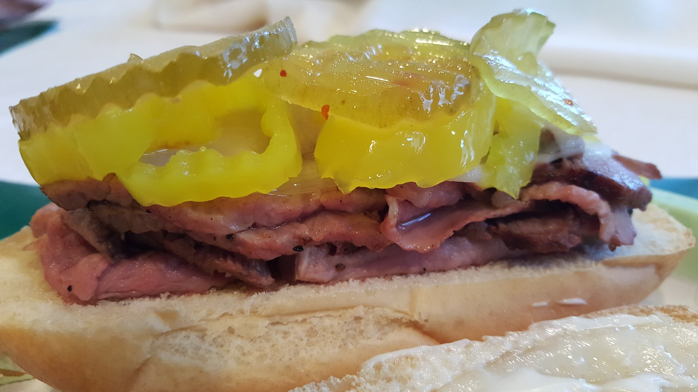 Tri-tip and filet... Sliced thin... Sv warmed. Dukes, peppers and gator pickles.