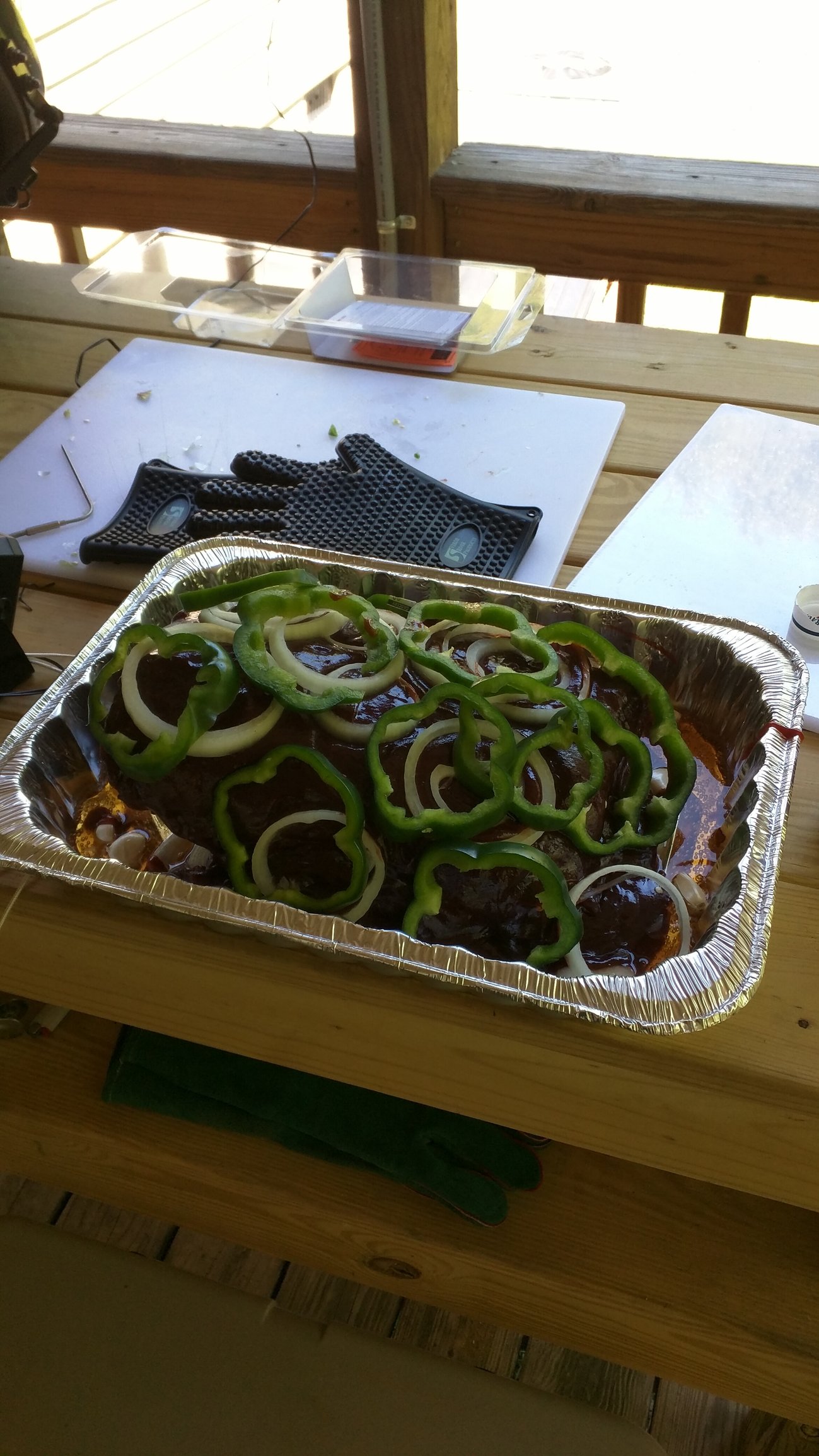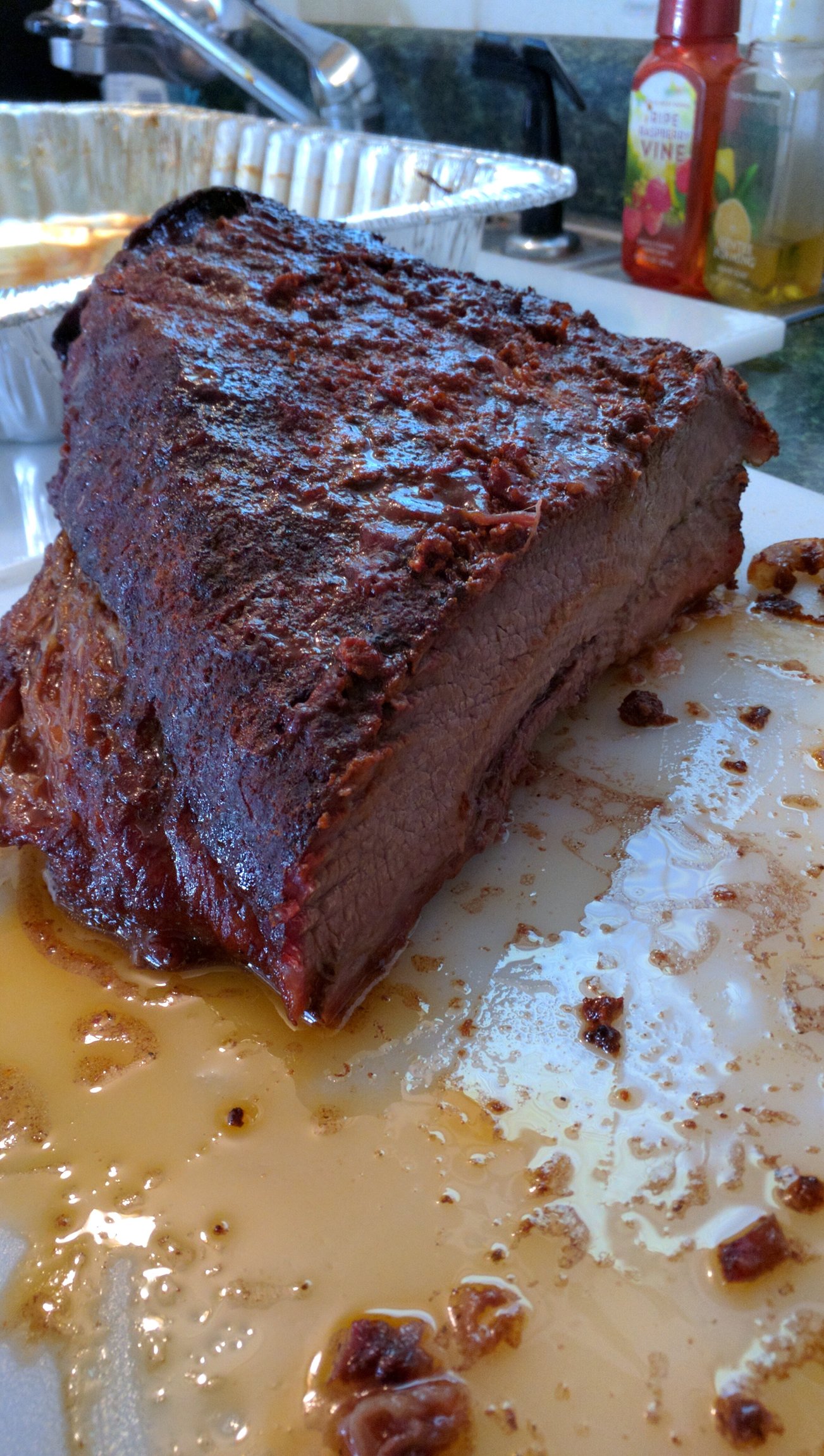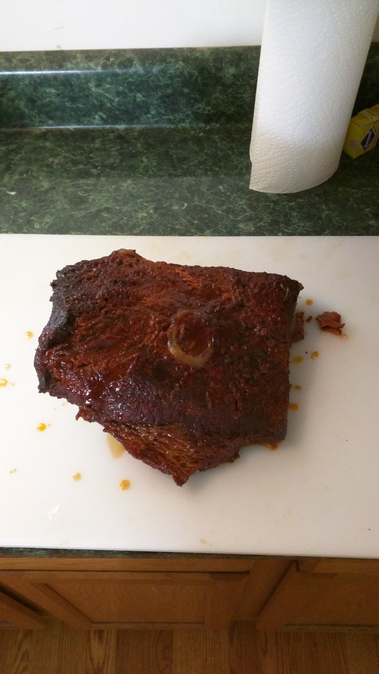 Finally got to cook my Brisket today and use my flameboss for the first time. The recipe I used was to cook the Brisket until it got to 160° internal. Pull it off and sit it in a roasting pan with sliced onions, a smashed garlic clove, and a half bottle off beer all on the bottom side.  Then smother the Brisket with a whole bottle of sweet baby Ray's BBQ sauce and place some sliced onions and bell peppers on top. Last but not least wrap the pan with foil and put it back on the grill until it's done. The final product was pretty darn tasty! I removed the Brisket from the pan and poured the bbq juices in another bowl. I sliced it against the grain then put it back in the pan and poured some of the juices over it along with a few onions and bell peppers too. It wasn't quite what I was personally expecting but every one else had a fit over it saying it was the best Brisket they've ever tasted.  There were no leftovers whatsoever! Lol
