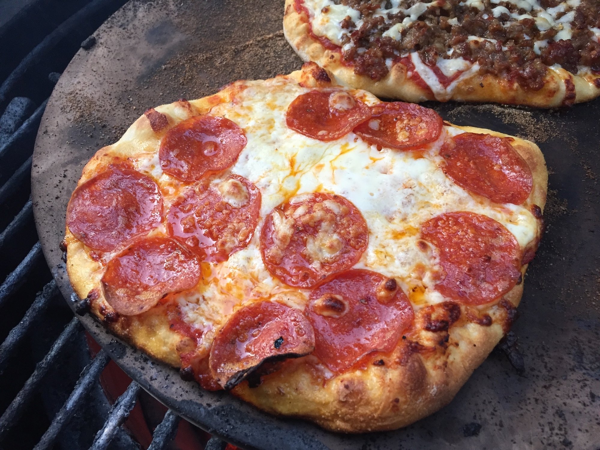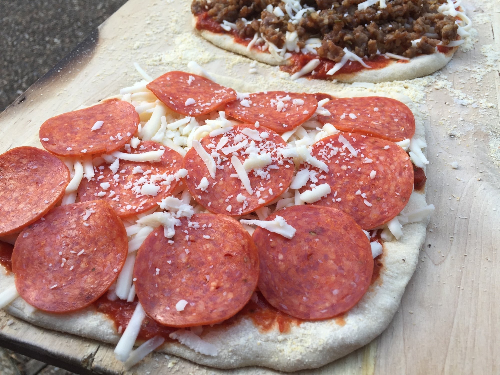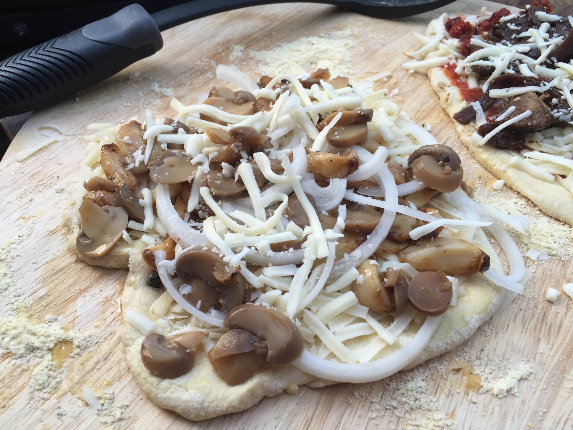 Had just one dough ball, so she say make four!  Yes, ma'am!  Four small pies. Sausage, pepperoni, left over red wine reduction onions and mushrooms, and roasted garlic, onion and mushroom. Only two finished pics, she started chewing too fast!  Happy wife, happy life!