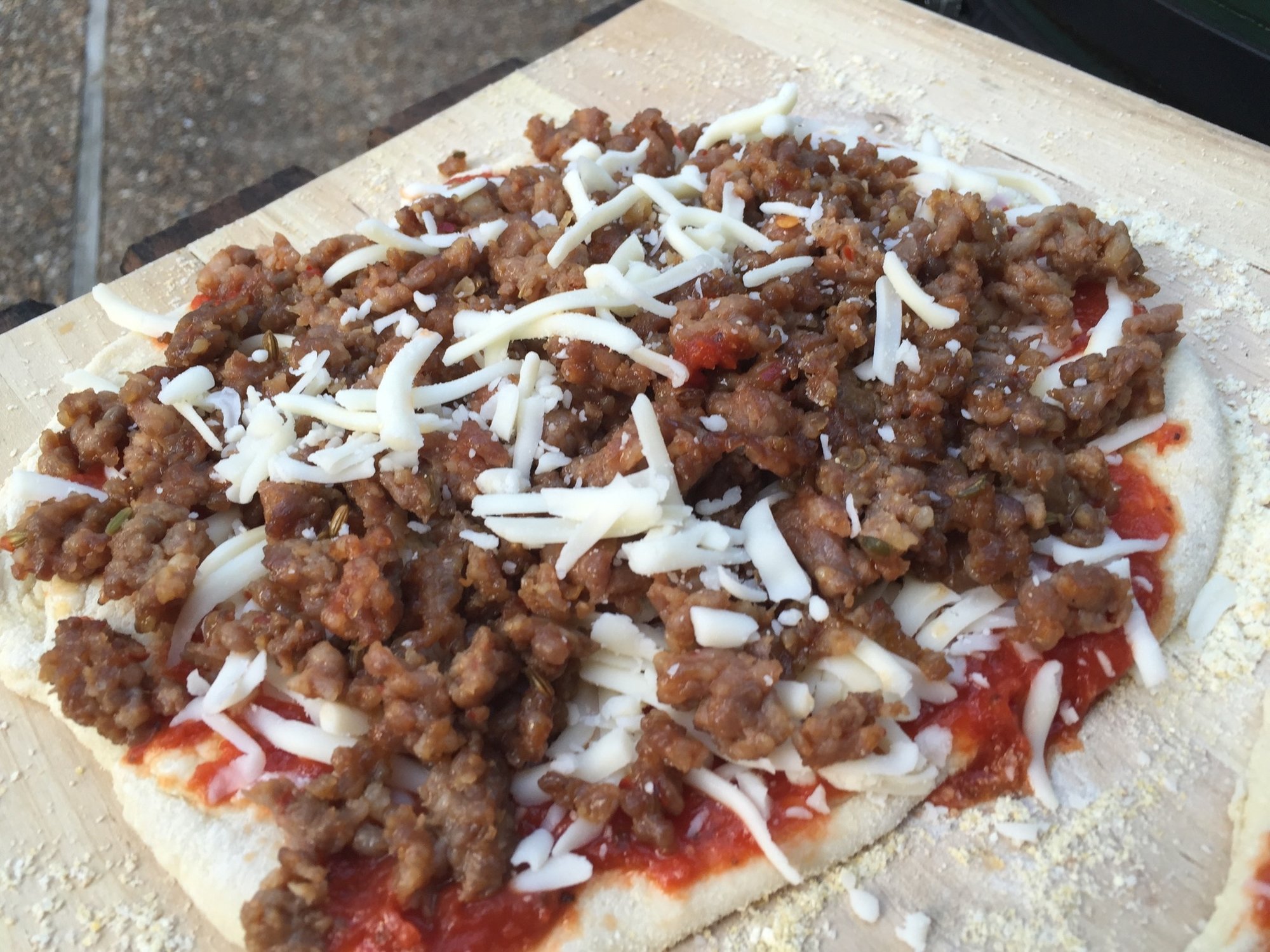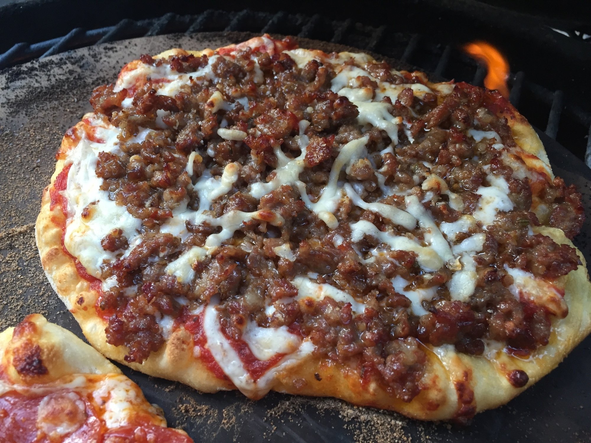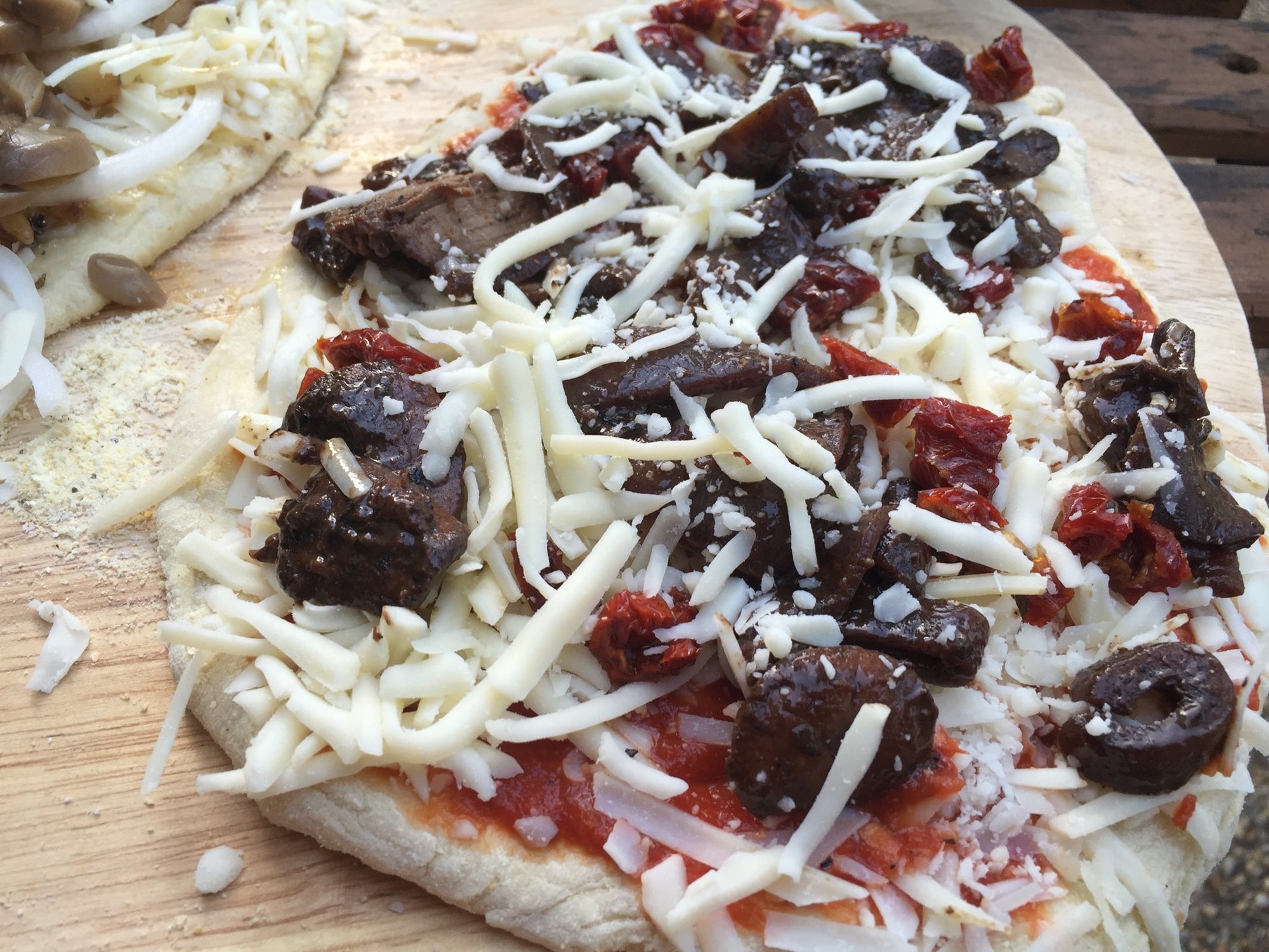 Had just one dough ball, so she say make four!  Yes, ma'am!  Four small pies. Sausage, pepperoni, left over red wine reduction onions and mushrooms, and roasted garlic, onion and mushroom. Only two finished pics, she started chewing too fast!  Happy wife, happy life!