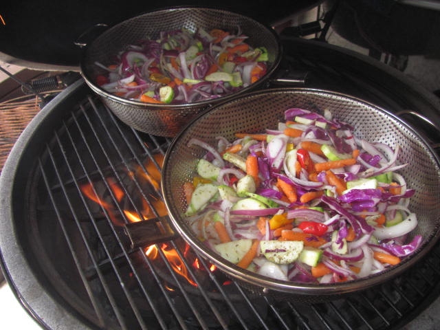 These are red and white onions, baby carrots, zucchini,  and red cabbage.  Generally speaking veggies take longer to cook than you would think, but for these baskets we just want them a little soft and smoked.  Cook them too hard and they are mushy, and besides we will microwave them hot for meals during the week.  Once cut I toss them with PAM and salt.  I cook them direct about 15 minutes at 350 to 400  spraying them with PAM and tossing them every 5 minutes.  Don't over do them, you want them a little soft and warm but no more.