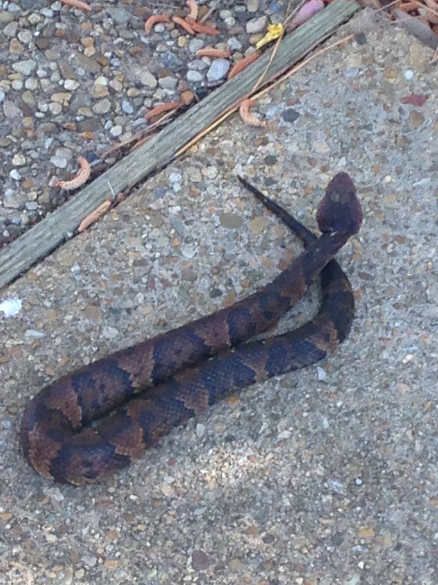 I was wondering that too but I went and looked again. I'm pretty sure it's not a cotton mouth or copperhead. These look a lot like copperheads but they aren't venomous. cotton mouths are black (at least down here anyway). copperheads have a very distinct pattern that these snakes emulate- another way to freak you out. I'm pretty sure it's a hognose but I'm no expert.Ag83 said:
