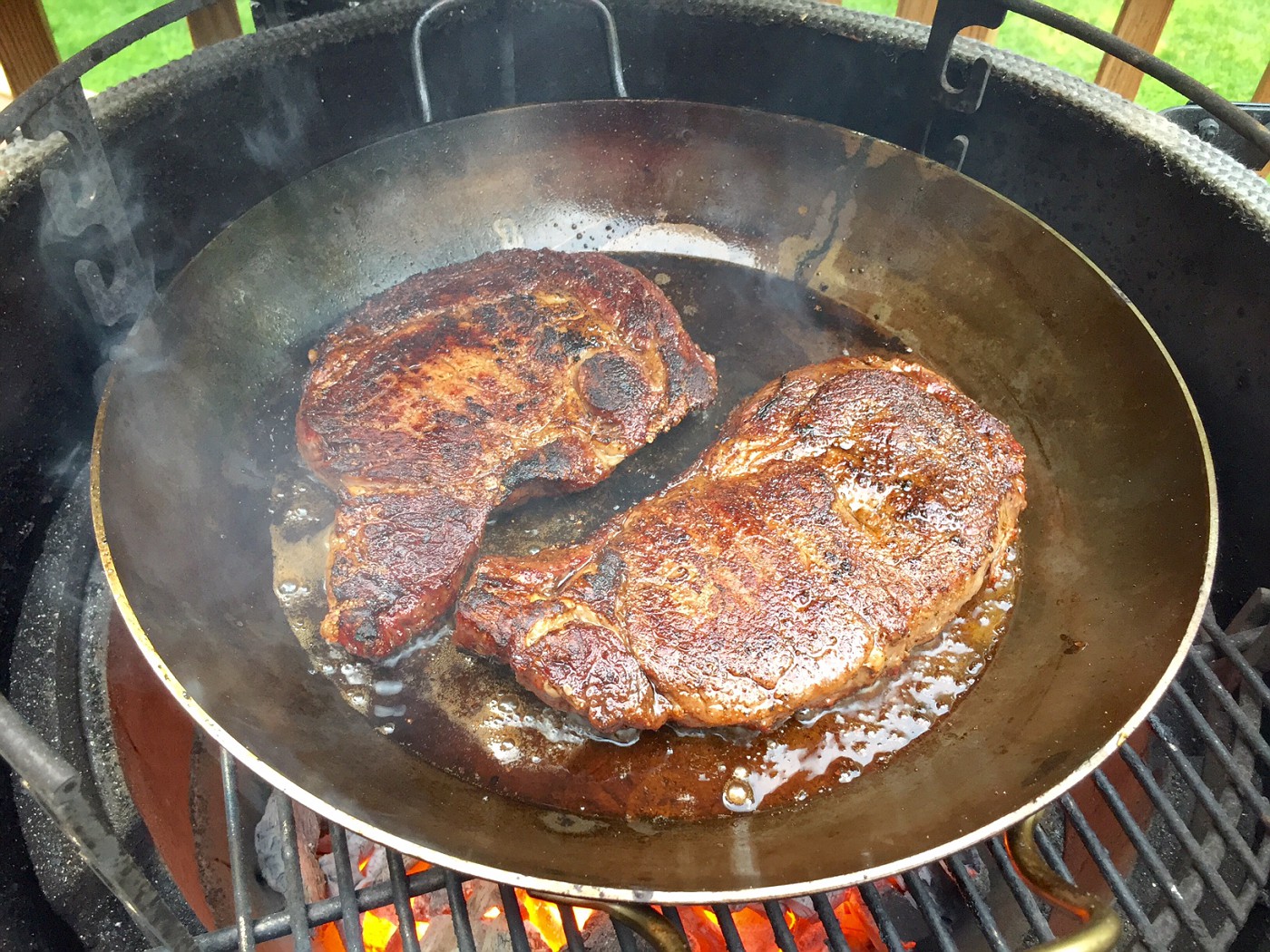 Dropped the grate, cranked the heat, put my thick carbon steel pan on the grill and let everything get plenty hot.