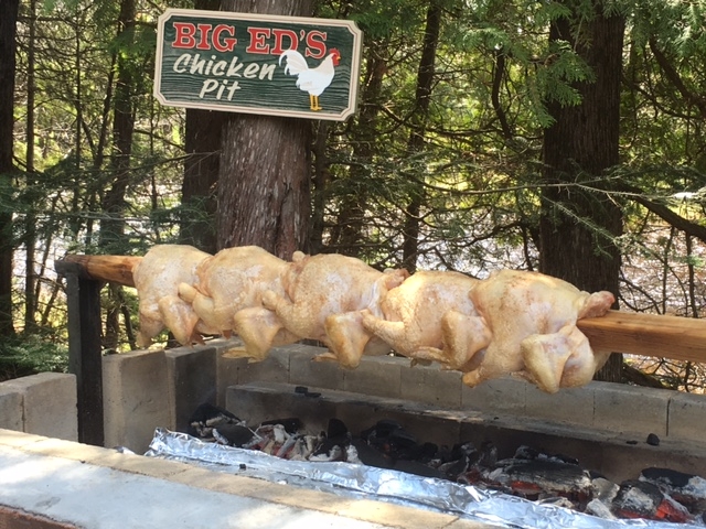 We have a log cabin about 12 miles out of town right on a river.  Really is a pretty nice spot.  The pit was built 20 years ago by my father in law and a friend who is a mason for his 70th birthday party.  My in laws are all Croation and thought Croation chicken would be great for the party.  It was a real hit and still doing it 20 years later.  My father in laws nick name is "Big Eddy", thus the name on the sign.  He will be 90 in August and planning on another batch of chickens.  Last Sunday's cookout was nephew and family visiting for the weekend.  We've also done prime ribs,steaks and burgers on pit.  Really a lot of fun and great conversation piece.  Most of the lawn chairs seem to end up facing the pit...   I'll post a couple more pics first chance I get and show a little more of the construction etc.