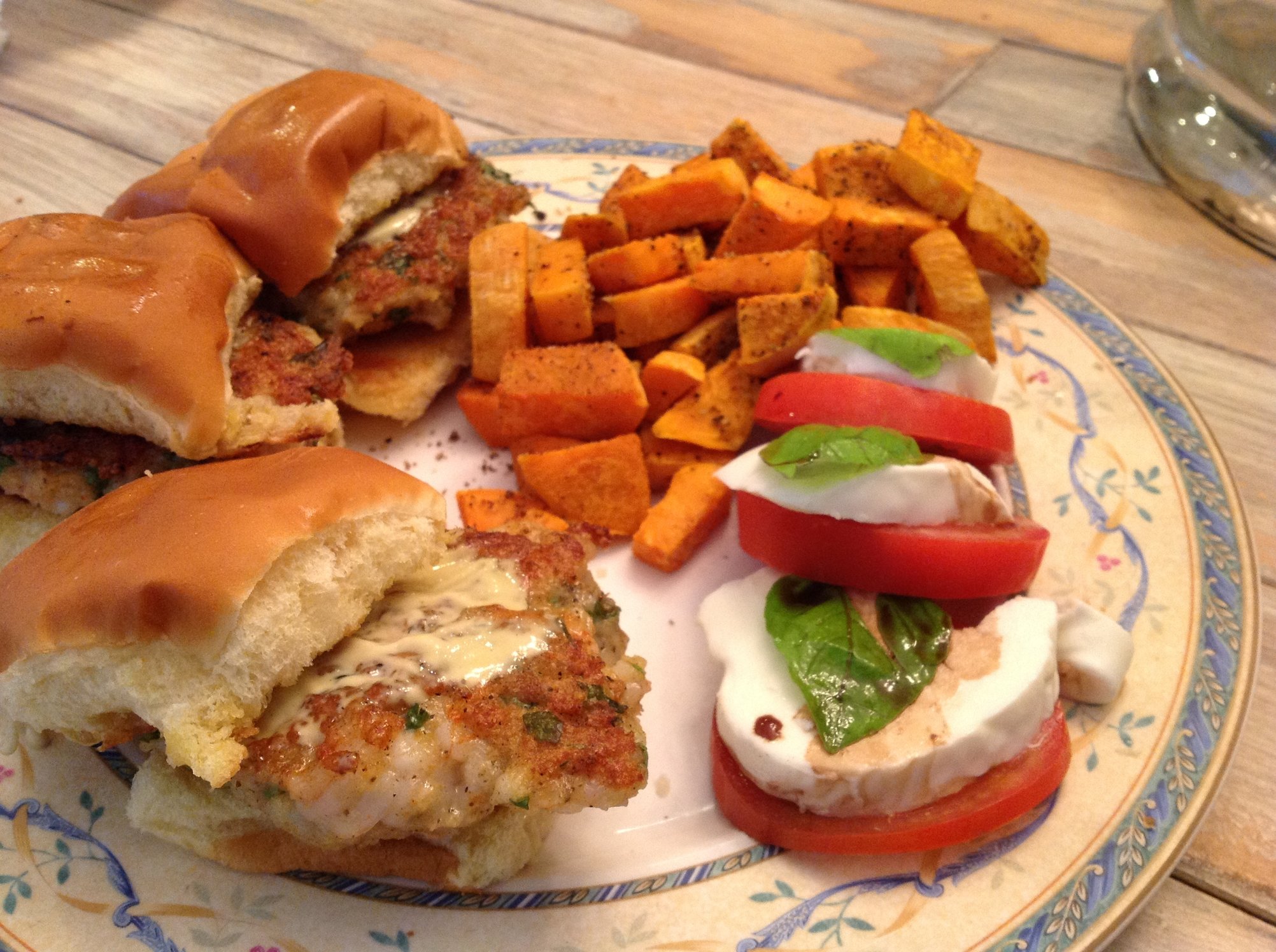 Shrimp sliders with wasabi aioli, SV sweet potatoes and caprese salad