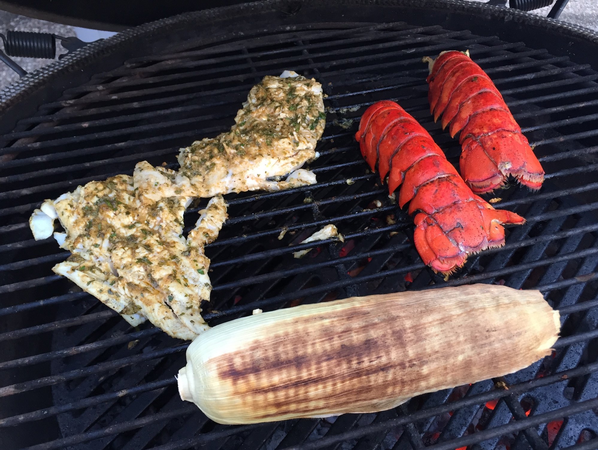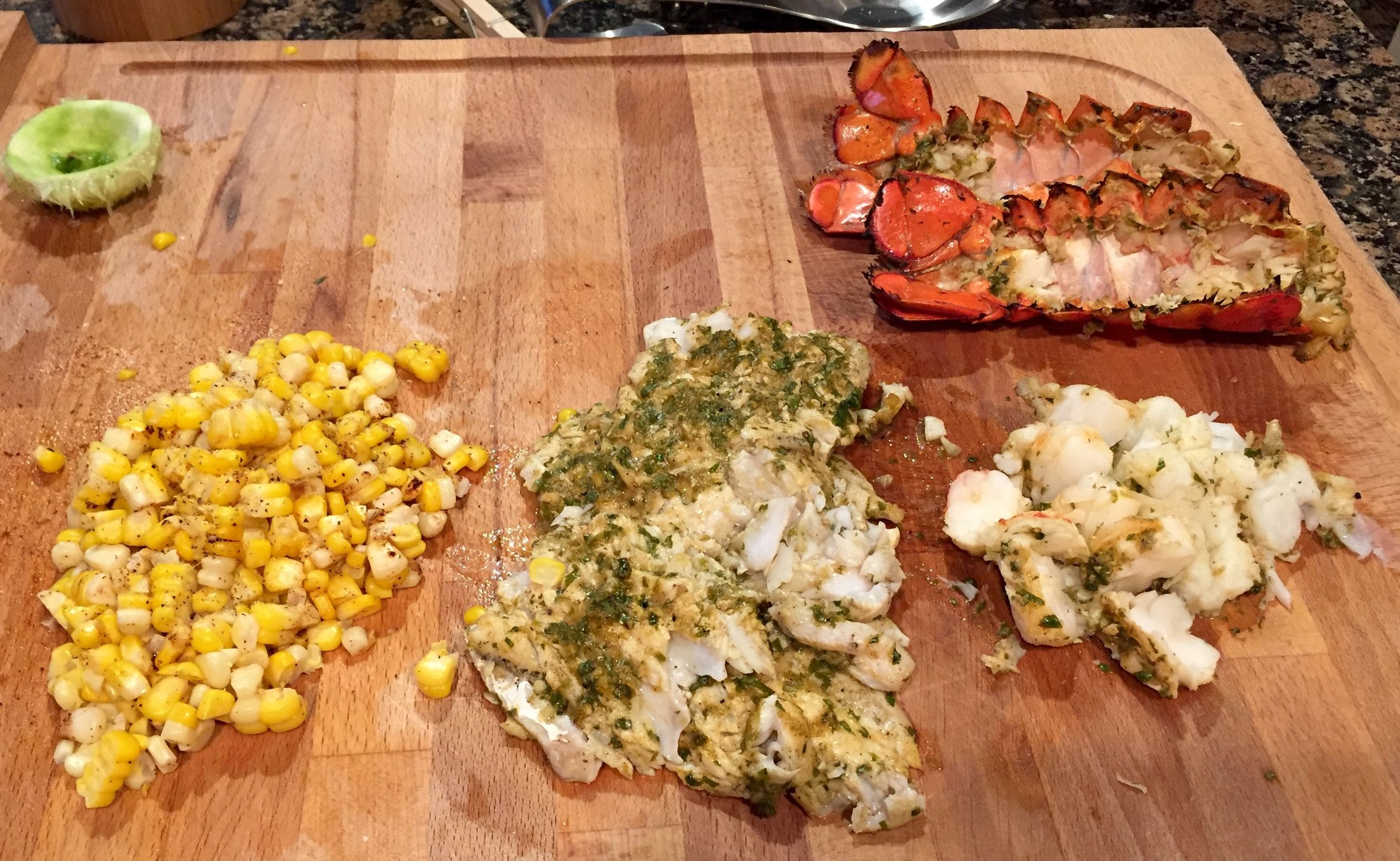 Picked up some Atlantic cod and a couple of small lobster tails for tacos. Made a paste with cilantro, garlic, evoo, a little butter, ancho powder, lime zest and lime juice for a quick marinade and baste. Also grilled up some corn that I dressed with lime juice, cracked pepper, salt and ancho chili powder.