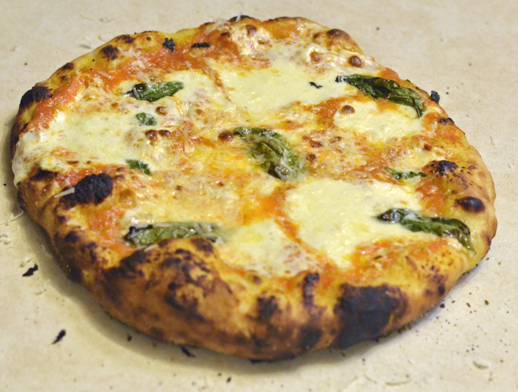 Pizza was dough made with "00" and bread flour, homemade sauce, fresh mozz, garlic oil, salt, and finished with shredded parm.