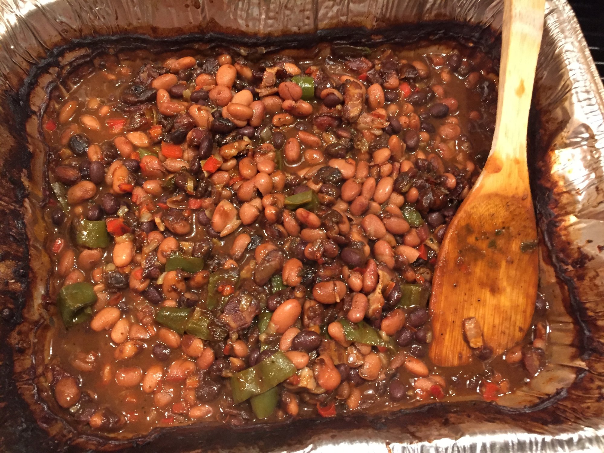 Bunch of bacon cut up and cooked. Medium onion and red bell pepper cut up and sautéed in the bacon grease. Jalapeño or two seeded and cut up into biger pieces. Half a beer. Cumin, salt, pepper, ancho chile powder, smoked paprika. That's about it, mostly just a pantry/refrigerator search. Could've used some heat, the peppers were too tame but they did grab some good smoke.THANK YOU FOR YOUR ATTENTION TO THIS MATTER -