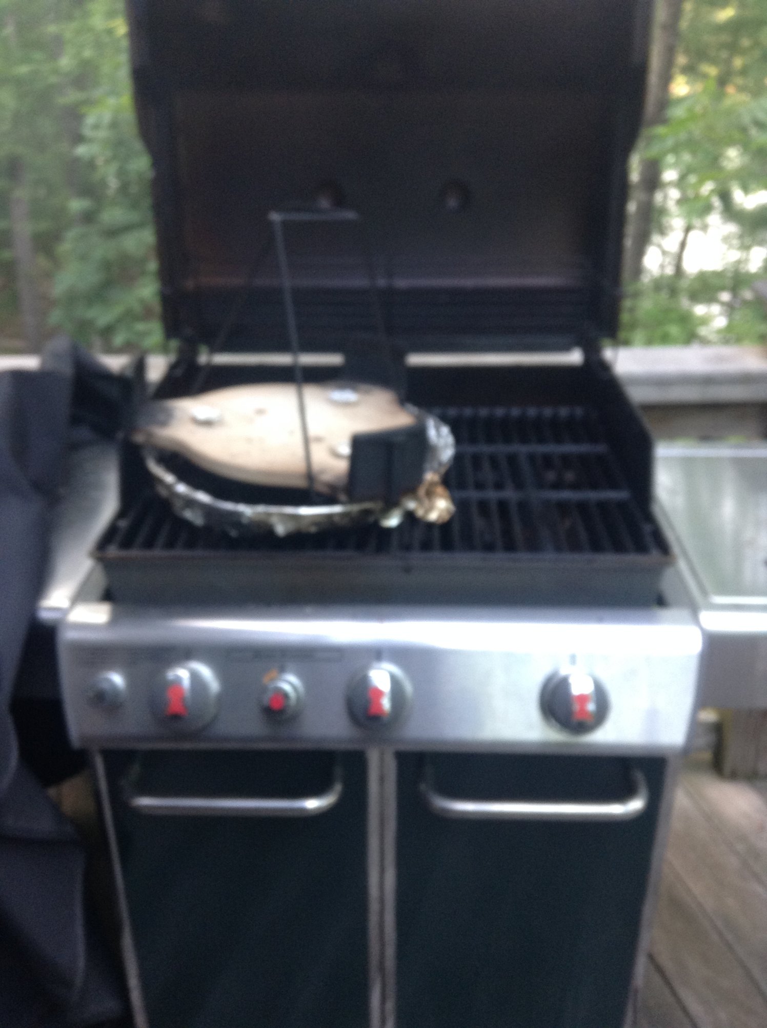 Or put it on my stainless steel prep table, I have a raised grid and place my CI skillet on the regular great and the steak on the raised great. When it gets to about 110 or so I pull everything of then put the steak on to sear each side for about 2 minutes a side and it is good medium rear.XL, WSM, Coleman Road Trip Gas GrillKansas City, Mo. -