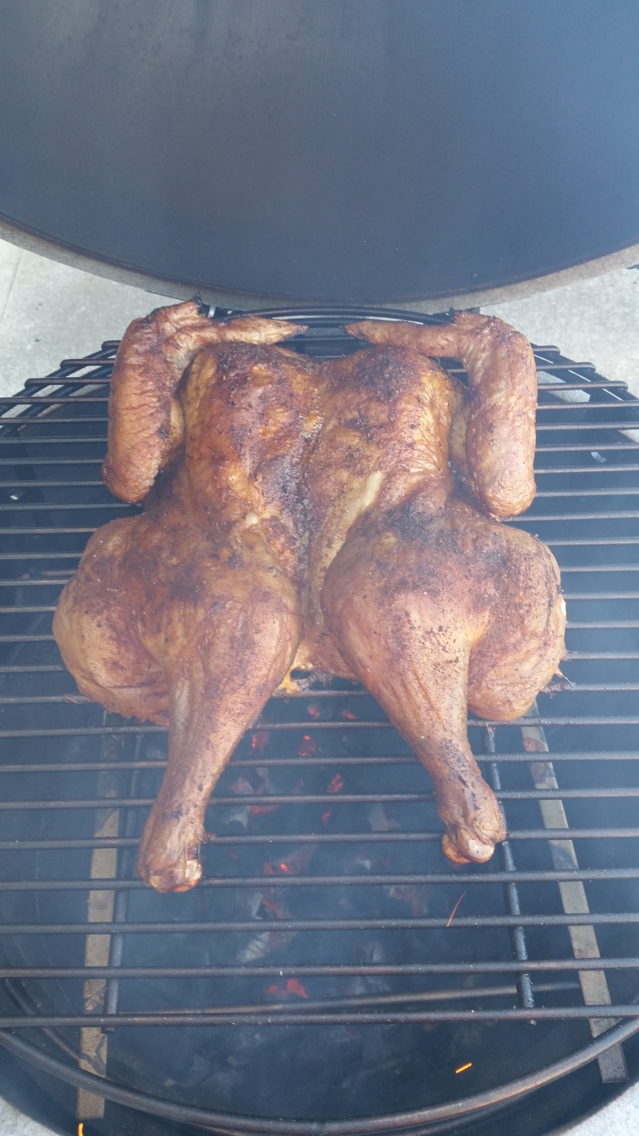 Welcome aboard! Nice yardbird there. I've found that chicken from the egg is the juiciest I've ever been able to cook. I do my spatch chickens about 375 - 400 indirect, but like most things, there are different ways to get the same or similar results. I like your teams too; I'm also a Hoosiers fan/ alum and Colts fan.Greenwood, IN | XL BGE | Weber Genesis | Blackstone 28 | bunch of accessories