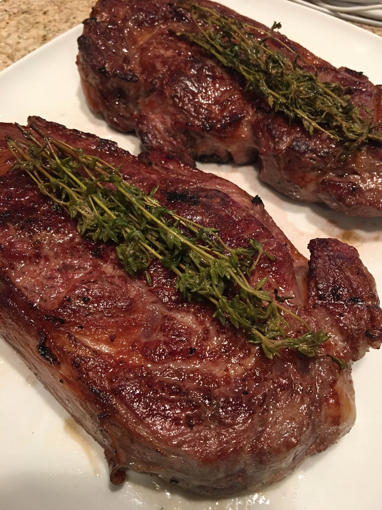 Those are great looking steaks. I use the same approach, more or less. Depending on how you like the doneness, you can raise or lower the temp of the bath. We do 127F for an hour then sear on a blast-furnace-hot MiniMax to get to MR-.NERVOUS said:Sous vide cooked for 2 hours and 30 minutes at 130 degrees F, then cast iron skillet seared at 550 degrees F for ~50 seconds per side.
