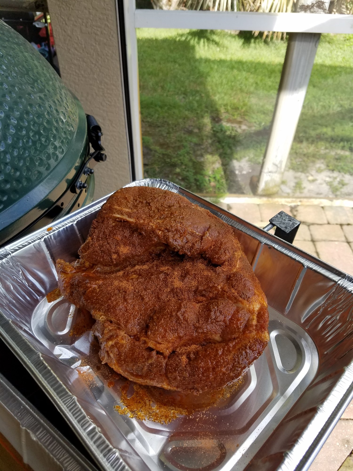 Hello everyone. I'm new to the egg I have done a lot of steaks and chicken. I've done a few racks of ribs and they came out great. Yesterday while out with the wife she informed me that she wanted to try a new taco restaurant. She order the pulled pork taco and they were OK. I stuck my foot in my mouth and told her that the Egg can make better pork. So on the way home we stopped by the store and picked up a little 4lb shoulder. I have my Guru set to 250 and this baby is going on now.