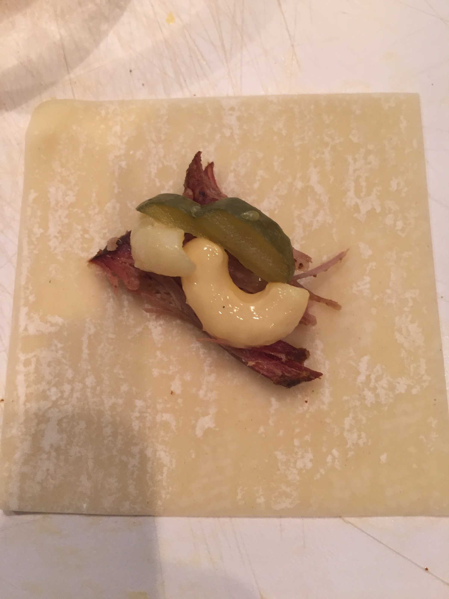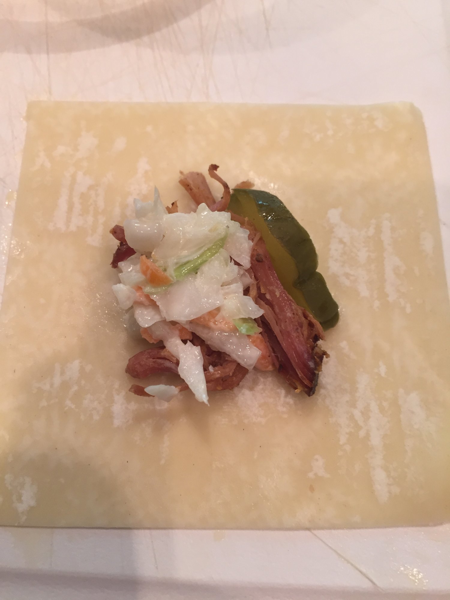 Two varieties of PP wonton. One with slaw and pickle, one with Mac & Cheese and pickle. Kept those warm in the oven while going lower in the XL for the stir fry.