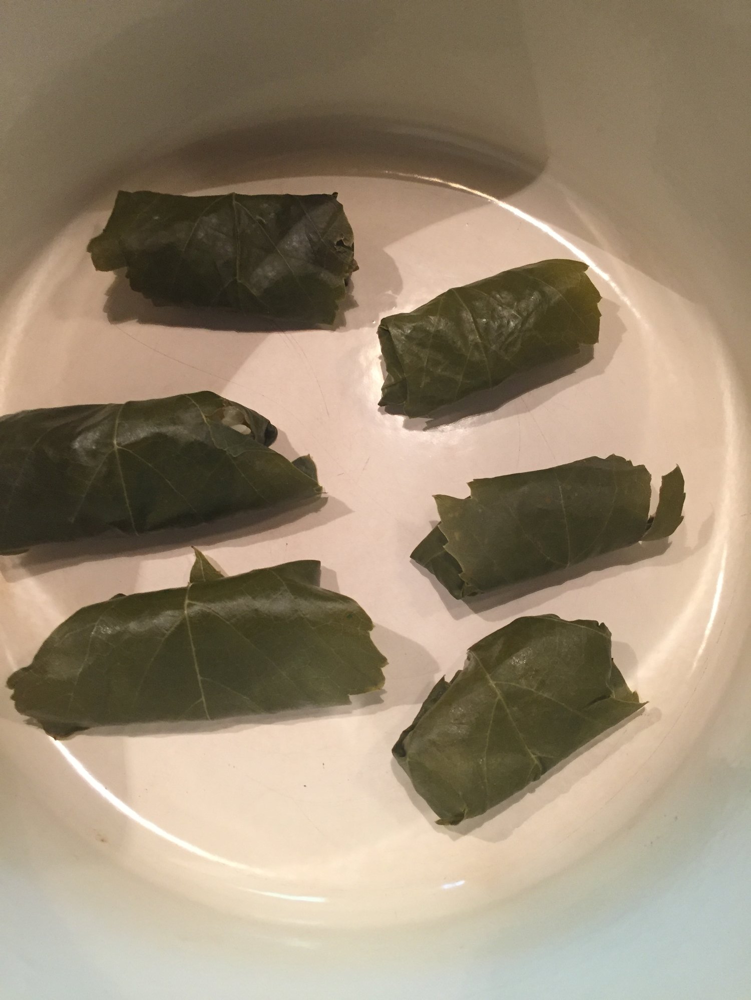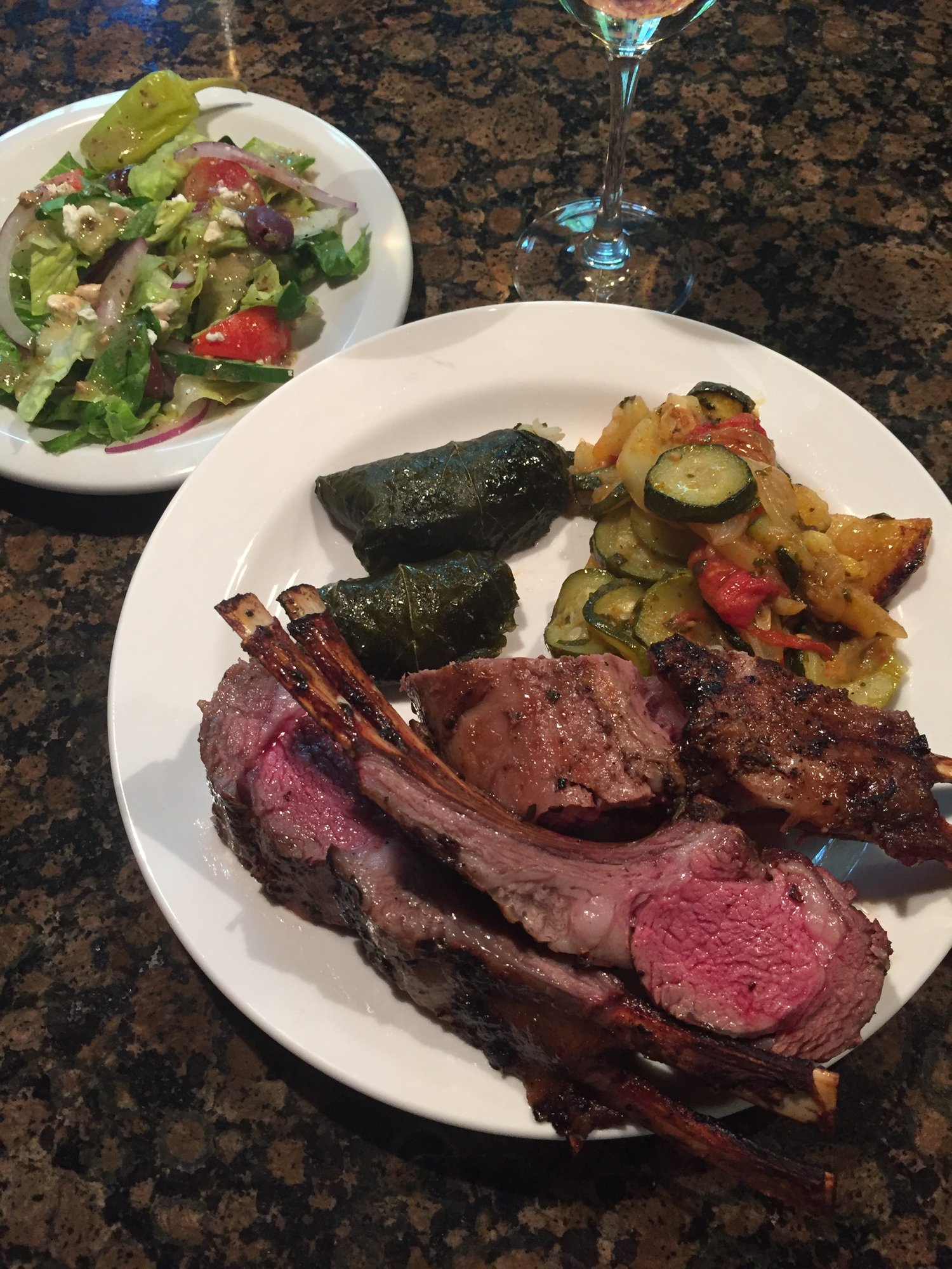 Marinated rack with oil, garlic, fresh oregano, and lemon. Stuffed grape leaves and traditional Briami. Guess I like wrapping things.