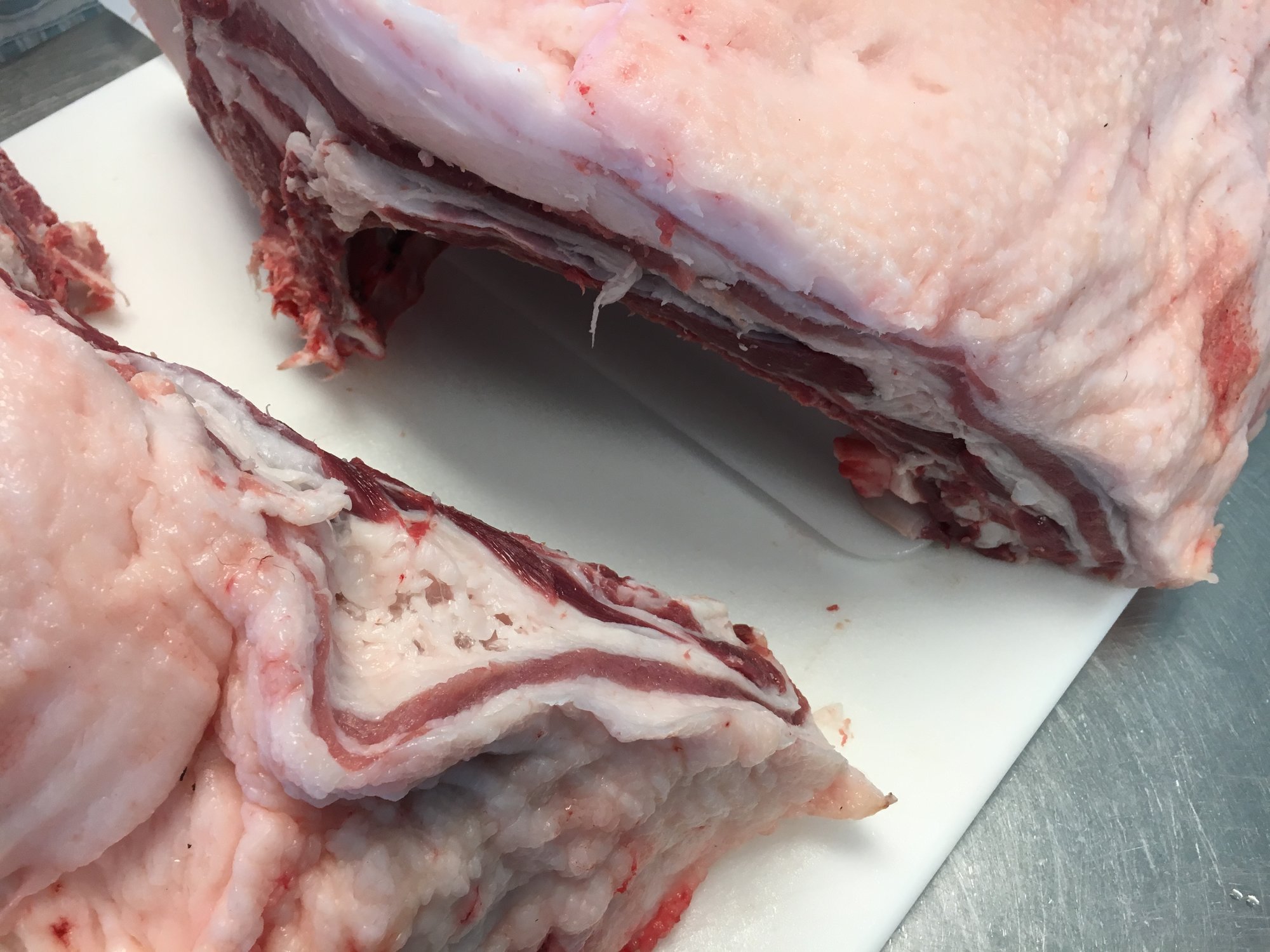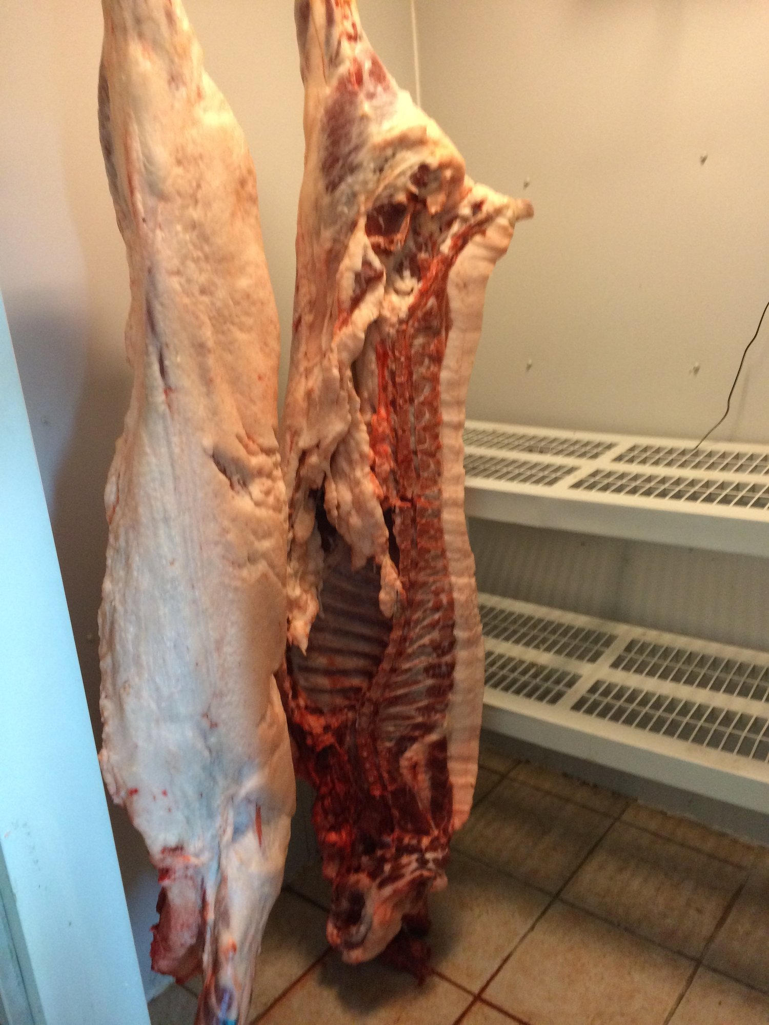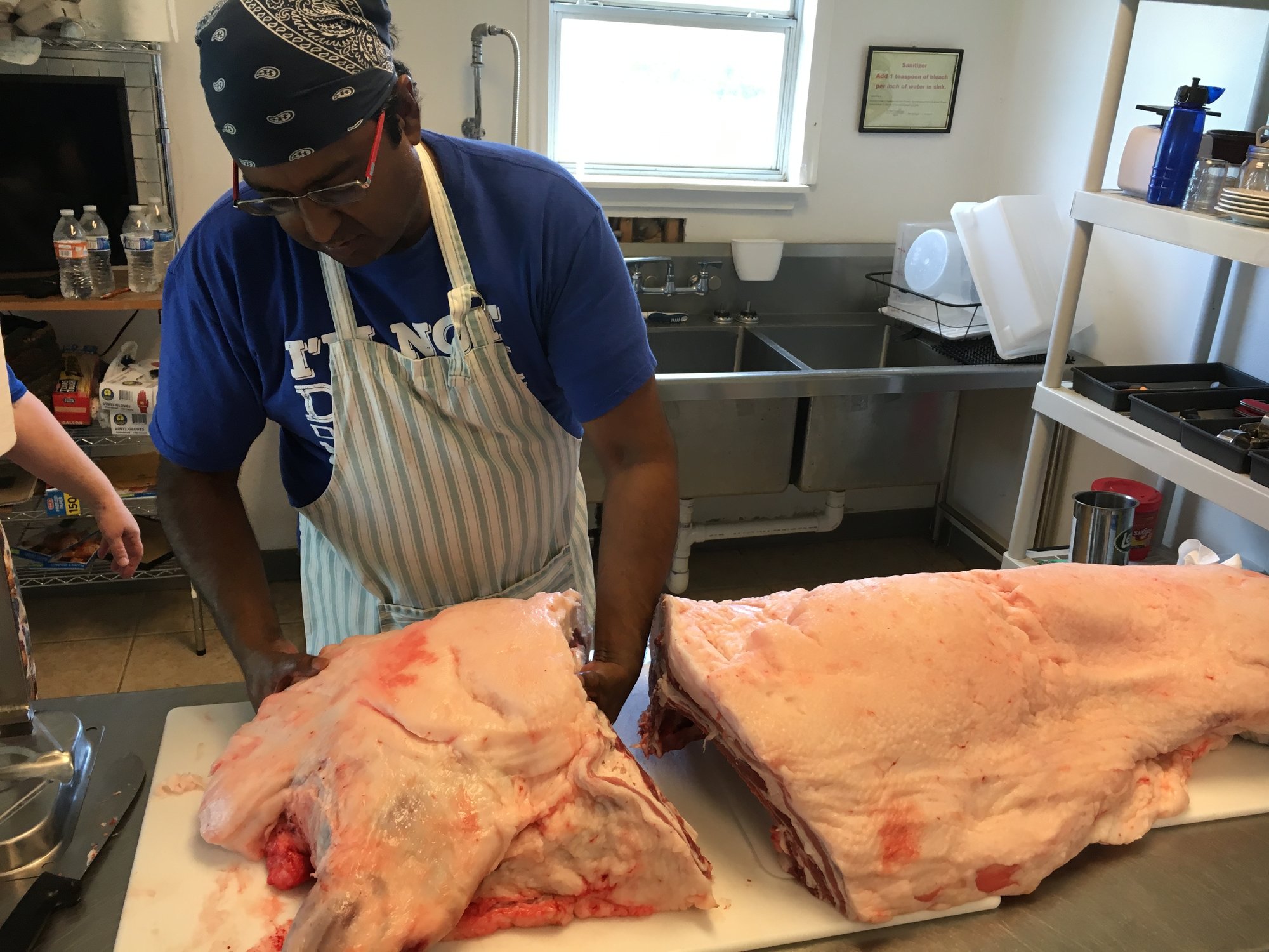 That's what greeted you at the farm when you arrived in a leisurely fashion. I arrived in a more timely manner and was greeted by an opportunity to move those hunks of pig from a truck to the cooler. Keep in mind that my son is 5'11".