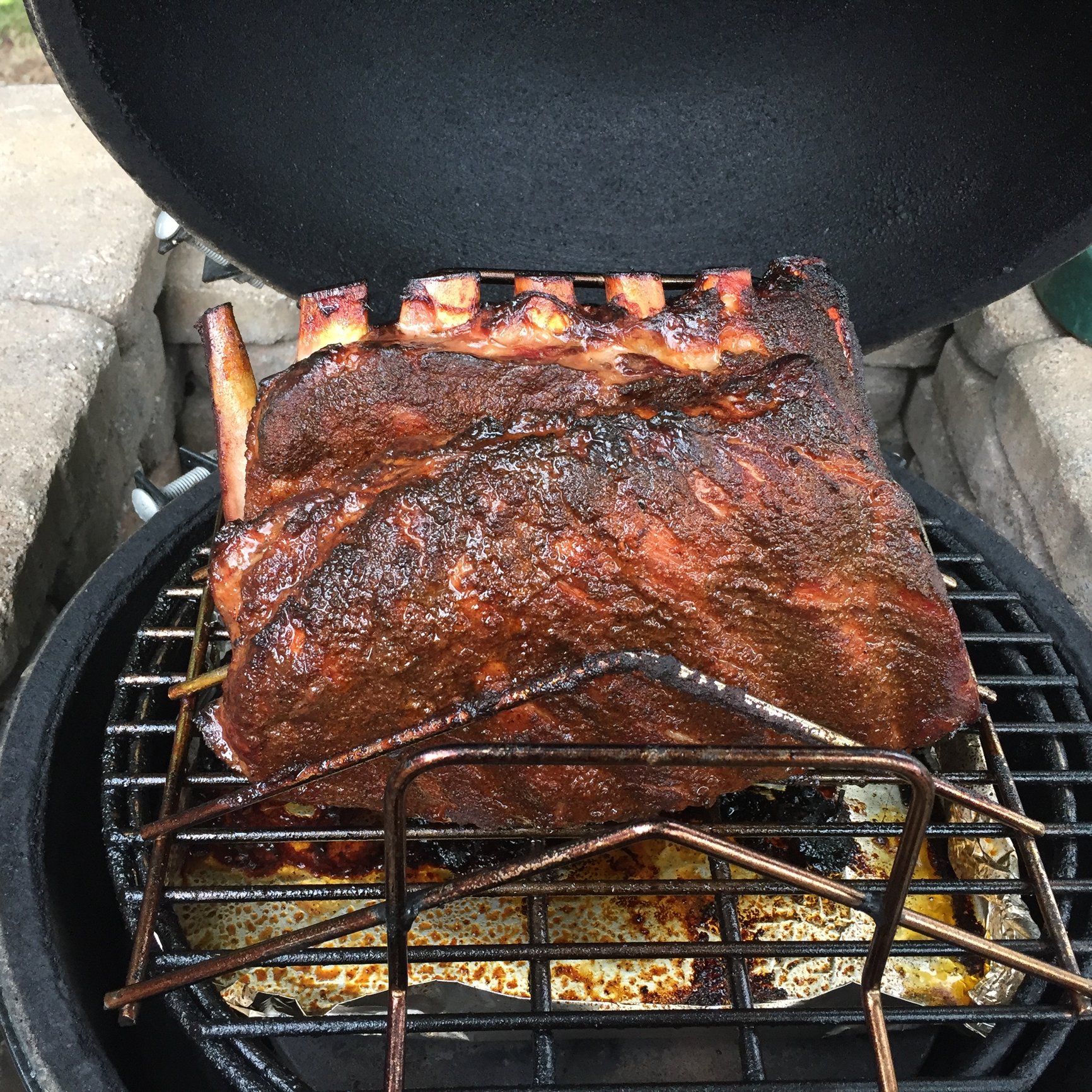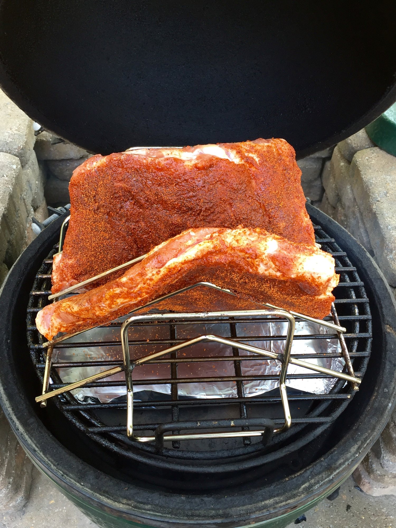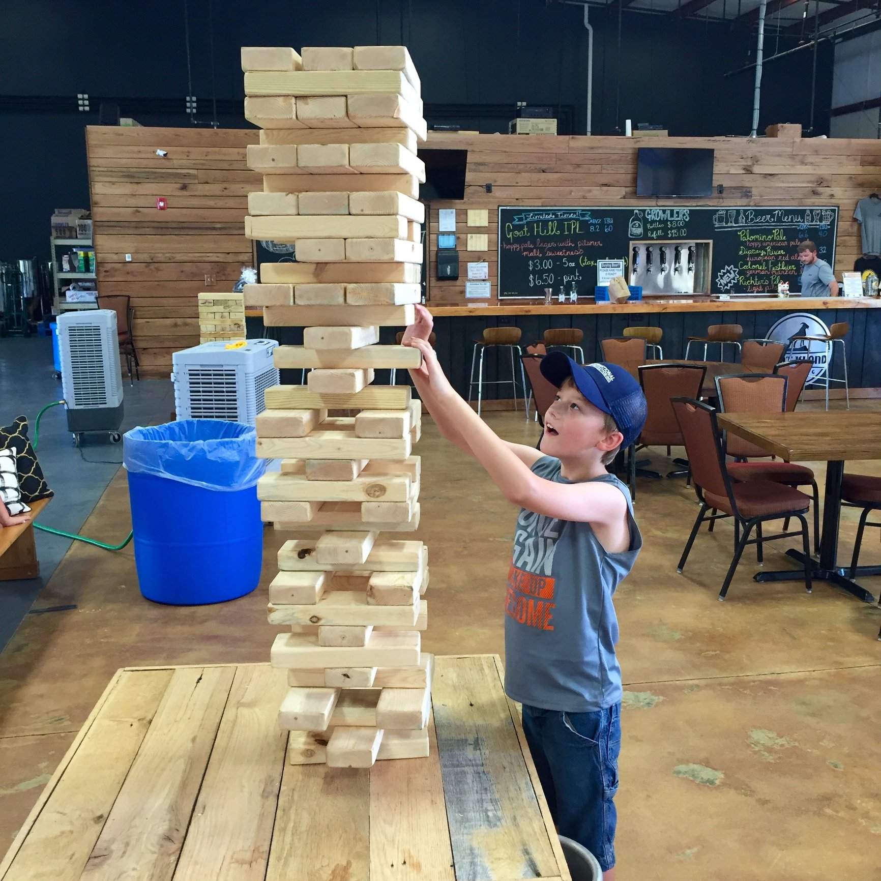 Doing some St. Louis spares on the small with 3 Little Pigs rub that I got from @Tspud1 during the exchange this year. BTW Tspud1 I have found that I really like the Country Bob's mixed with a little Frank's Red Hot hot sauce. Thanks for that. Anyway, there is a new brewery in town. It is actually the only brewery in town. Our whole county has been dry dry since Prohibition until just a few years ago when the city went wet. The county is still dry. Anyway again, I went by the new brewery (Goat Island Brewery) to get my new RTIC growler filled up. The name of the brewery comes from an island on Lewis Smith Lake which is supposed to be one of the best bass fishing lakes in the South East that is here in our county. Anyway for the third time, they have a new IPA coming out that will be released next Friday and when I asked about it they went straight to the huge stainless tanks and poured me a glass to try at no charge. I thought that was cool to be one of the first to try it. And it was great! They are having a release party next Friday night and I plan to be in attendance. Here's some pics of the ribs and one of my little guy playing a huge as version of Jenga at the brewery.