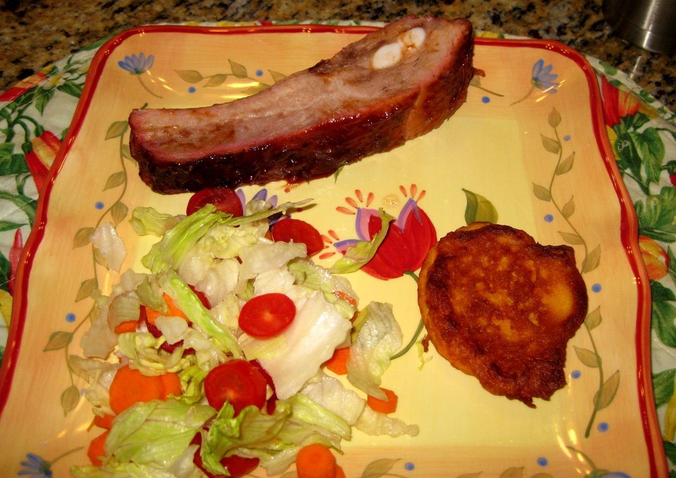 Served with a simple salad and my wife fried some sweet potato patties. Not real sure if they have an actual name, just some sweet potatoes, mashed with some butter, a bit of flour and milk added then dropped into hot oil in the cast iron. We just call them tater patties when we make them with regular potatoes, so maybe sweet tater patties this time.