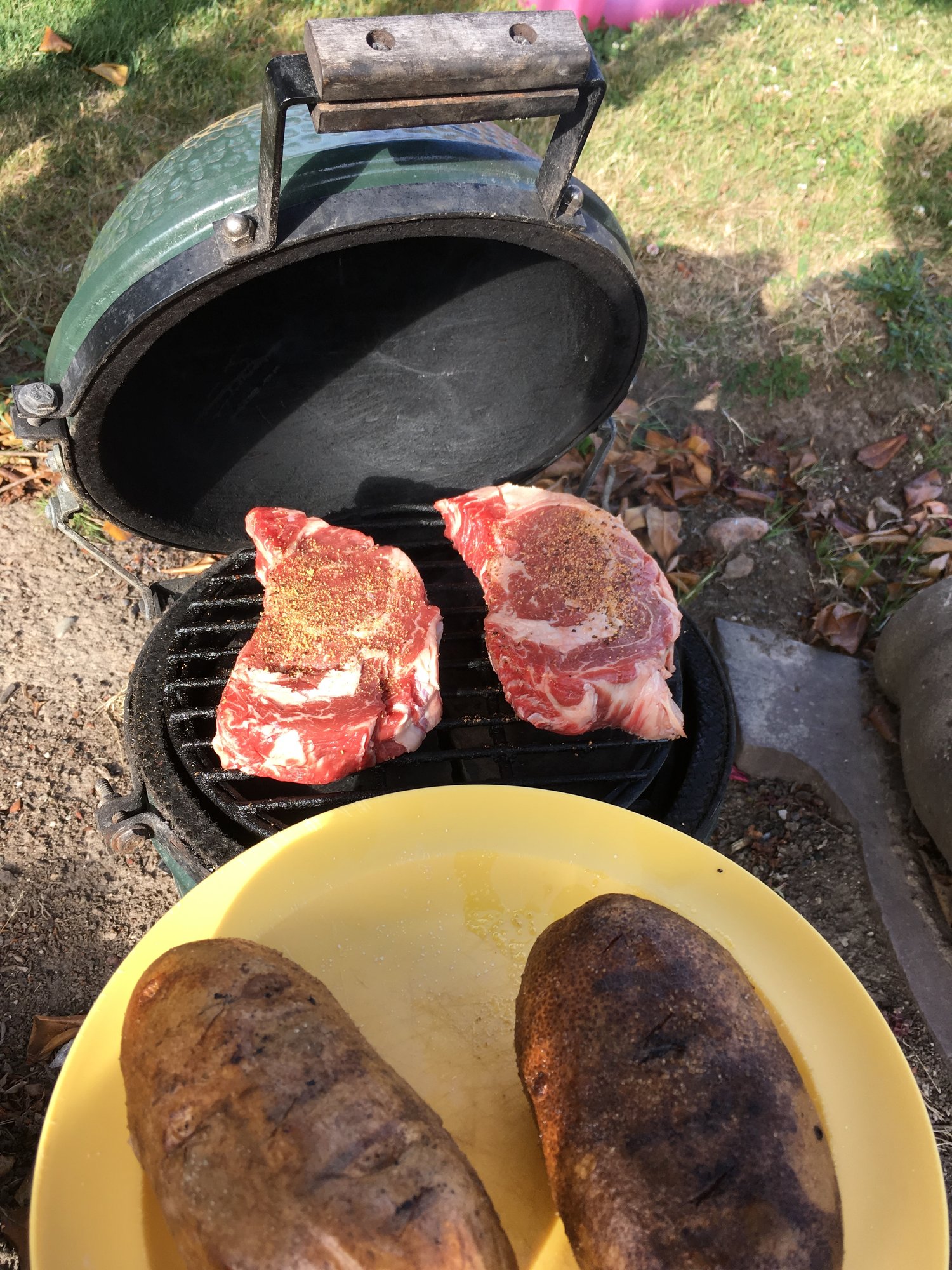 We've been doing baked potatoes on the Egg like there's no tomorrow. We love them! Both steak and spuds look spot on!------------------------------
