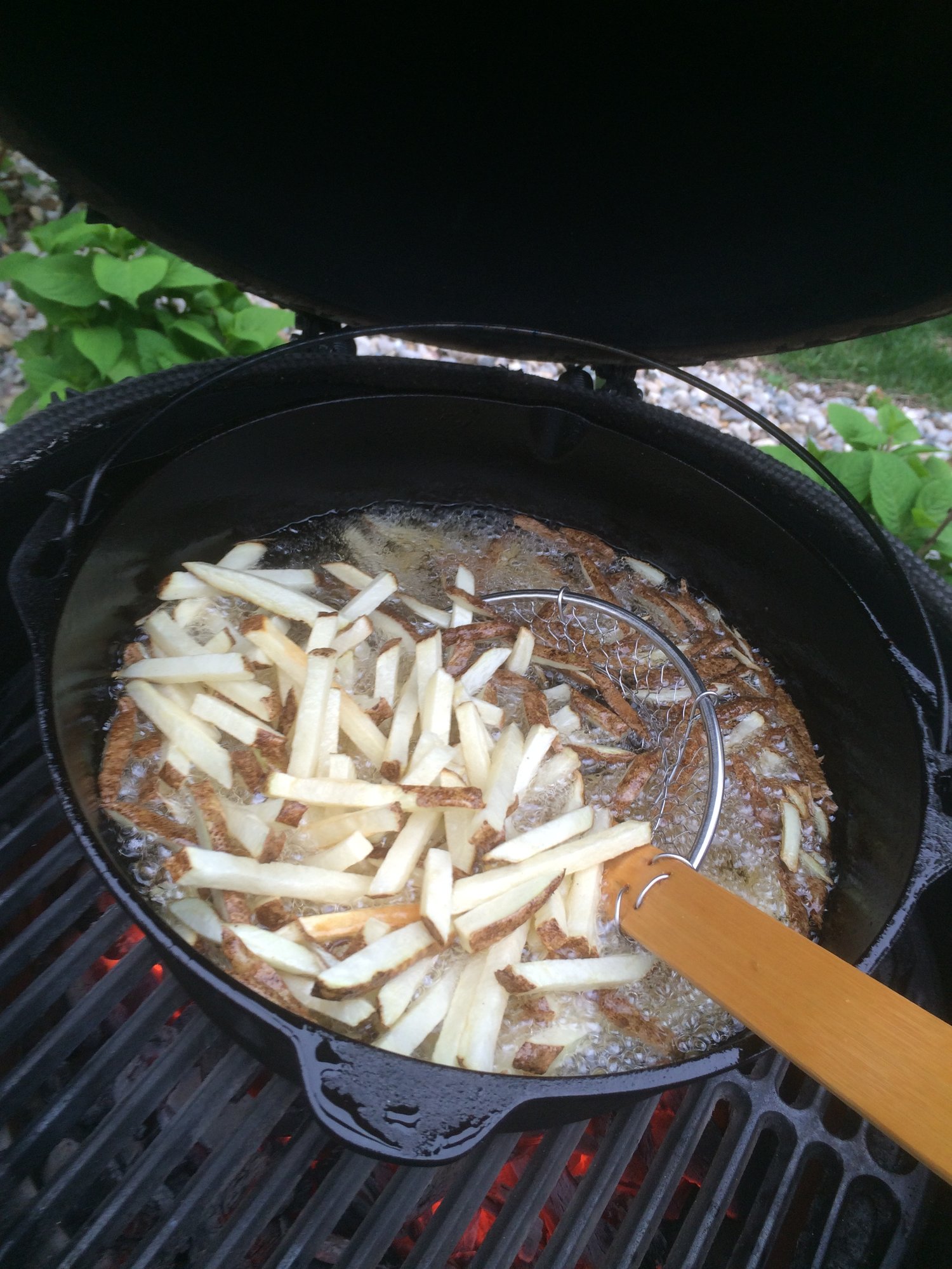 @DieselkW - agree the trick is to double fry. I use "fryer oil" from cash and carry - God knows what it really is, I think a mix of corn and canola. To clean the oil a fine mesh strainer works for the bigger chunks and then, depending on the weave, one or two layers of cheesecloth, #50 0r #60 grade. in the strainer cleans out the rest. For fries, I've gone as long as 4 or 5 months with the same oil, it seems that chicken and breaded"stuff" is what really shortens the life of the oil. BTW, I use a 2 gallon fryer, the egg is beyond my skill (or bravery) set.Delta B.C. - Whiskey and steak, because no good story ever started with someone having a salad!